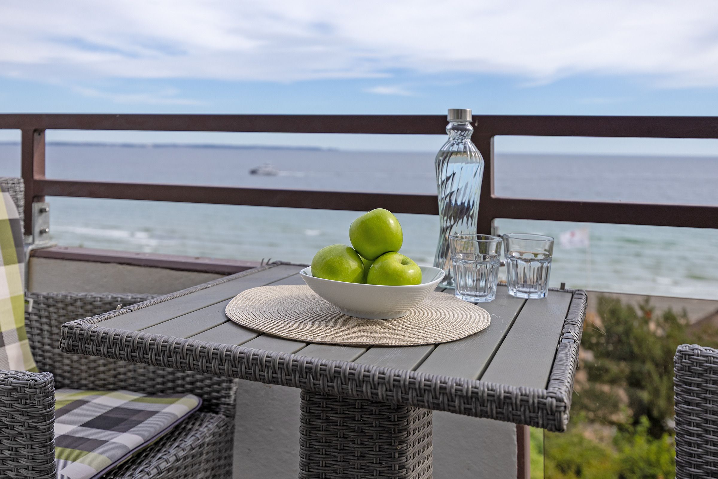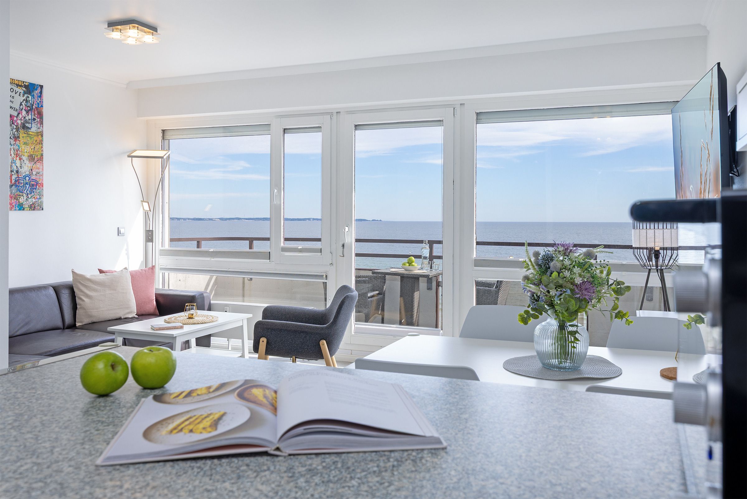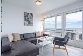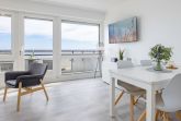Das stilvoll eingerichtete Wohnzimmer begrüßt Sie mit einem großen Ecksofa, einem Flachbildfernseher und Zugang zum Balkon. Die offene Küche ist z. B. mit einem Herd, einem Backofen sowie einem Geschirrspüler gut ausgestattet und bietet am Esstisch ausreichend Platz für bis zu 4 Personen. Das kleinere Schlafzimmer ist mit einem Boxspring-Doppelbett (140x200 cm), einem Fernseher und einem Kleiderschrank ausgestattet. Das größere Schlafzimmer erwartet Sie ebenfalls mit einem Boxspring-Doppelbett (160x200 cm), einer Kommode und einem weiteren Fernseher. In beiden Schlafzimmern sorgen Plissees für Verdunkelung. Im Badezimmer mit Fenster, Dusche und WC sorgen ein Waschbeckenunterschrank und ein weiterer Hängeschrank für ausreichend Stauraum. Lassen Sie den Tag auf dem möblierten Balkon ausklingen und genießen Sie den Blick auf die Ostsee.