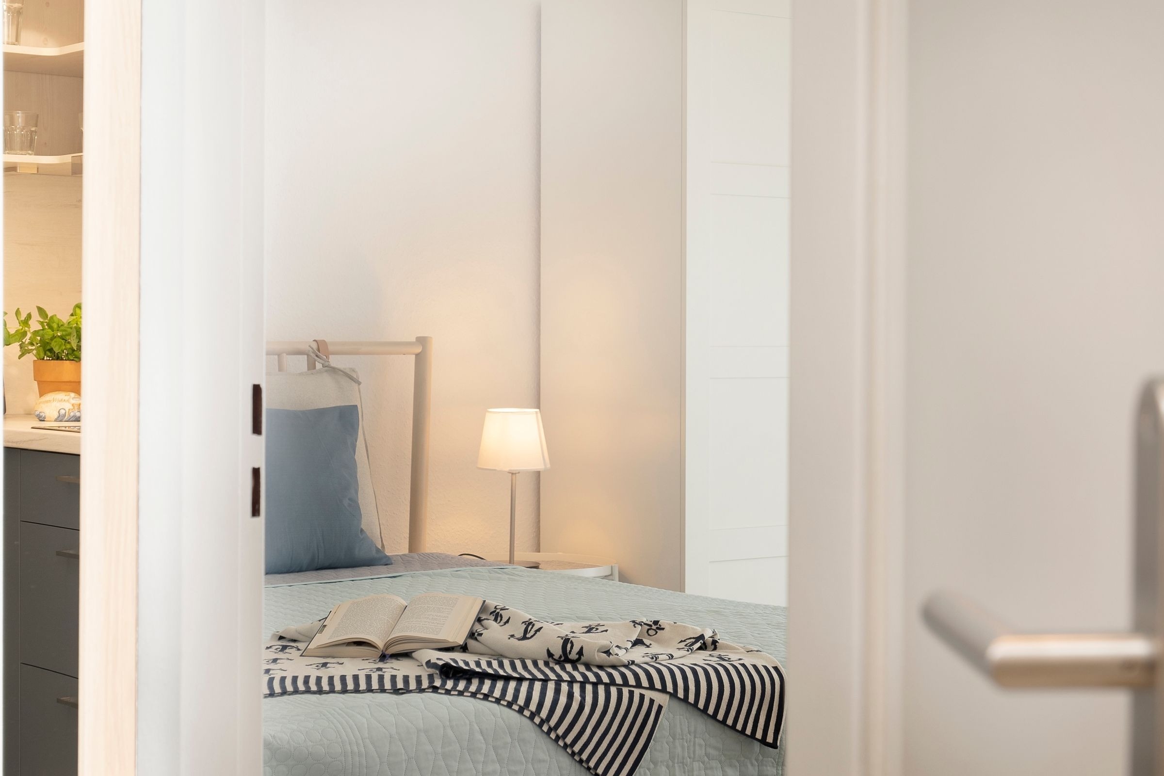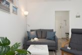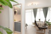 Es empfängt Sie ein schöner Wohn-/Schlafbereich mit Doppelbett (160x200 cm), Sessel, TV und gemütlicher Couch. Von hier aus gelangen Sie auf den überdachten, möblierten Balkon. In der voll ausgestatteten Küche können Sie leckere Gerichte zubereiten und gemeinsam am Esstisch im Wohnbereich einnehmen. Zur Nacht lässt sich das Zimmer durch Vorhänge angenehm abdunkeln. Das helle und moderne Duschbad sorgt für einen angenehmen Start in den Tag.