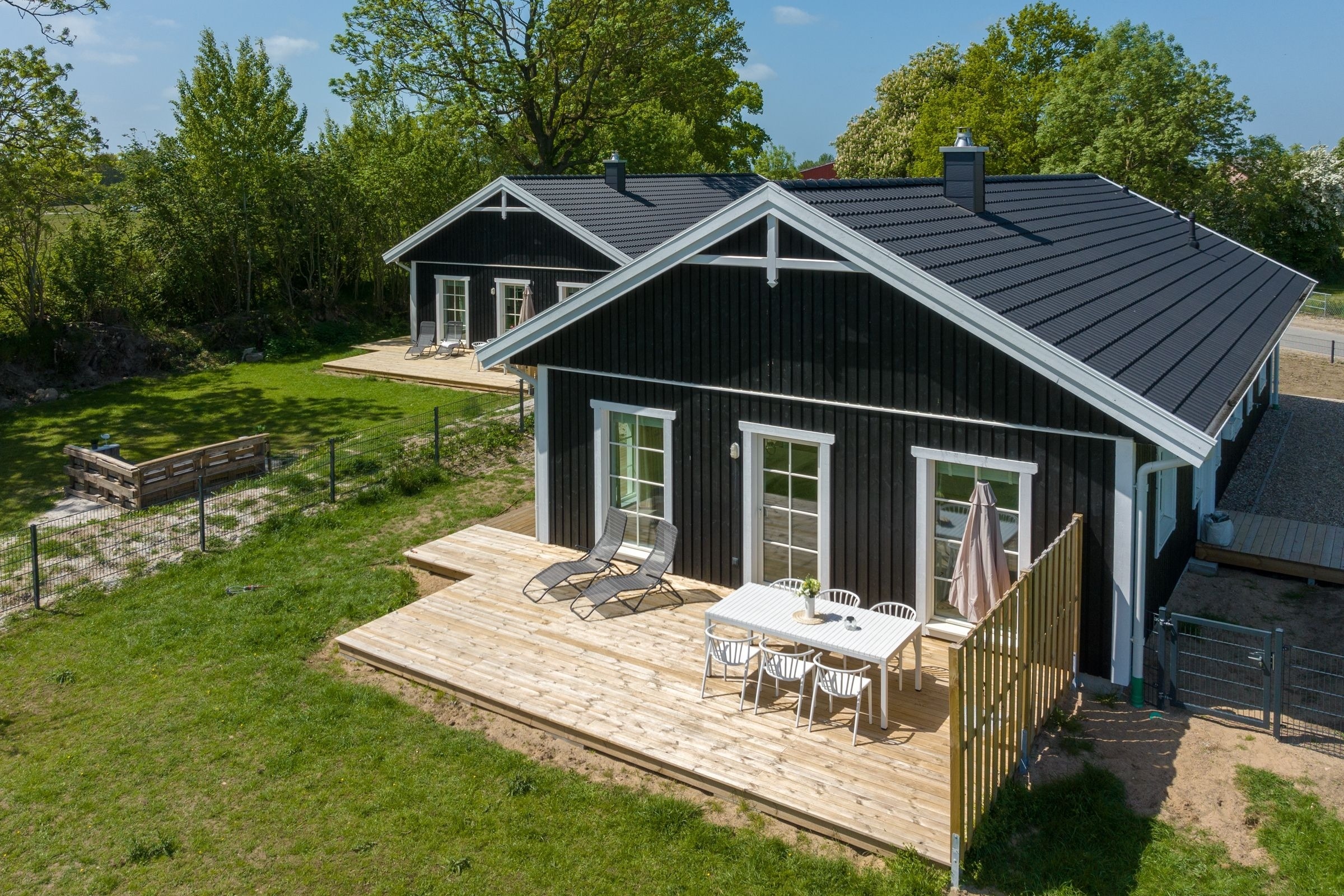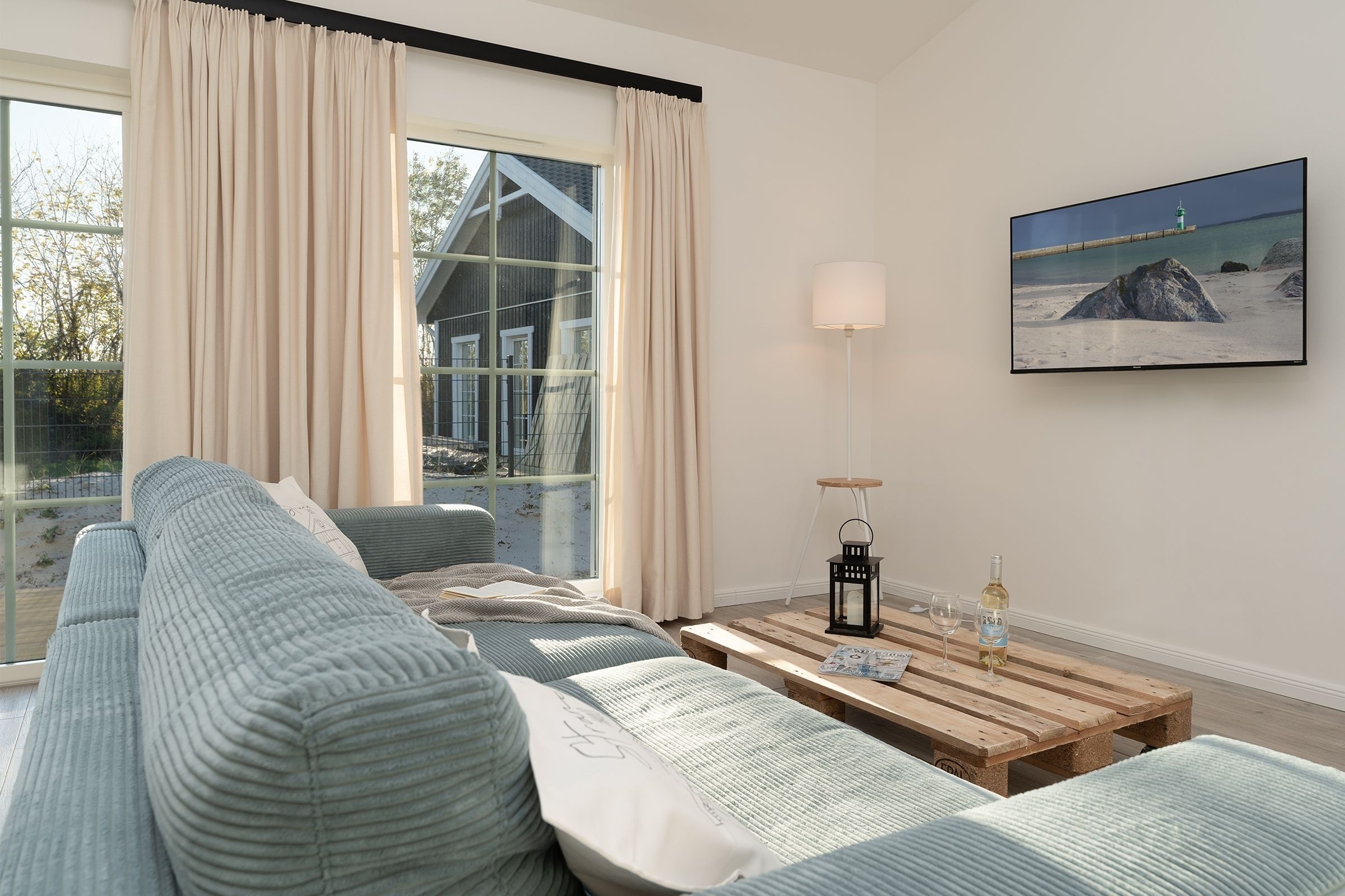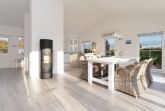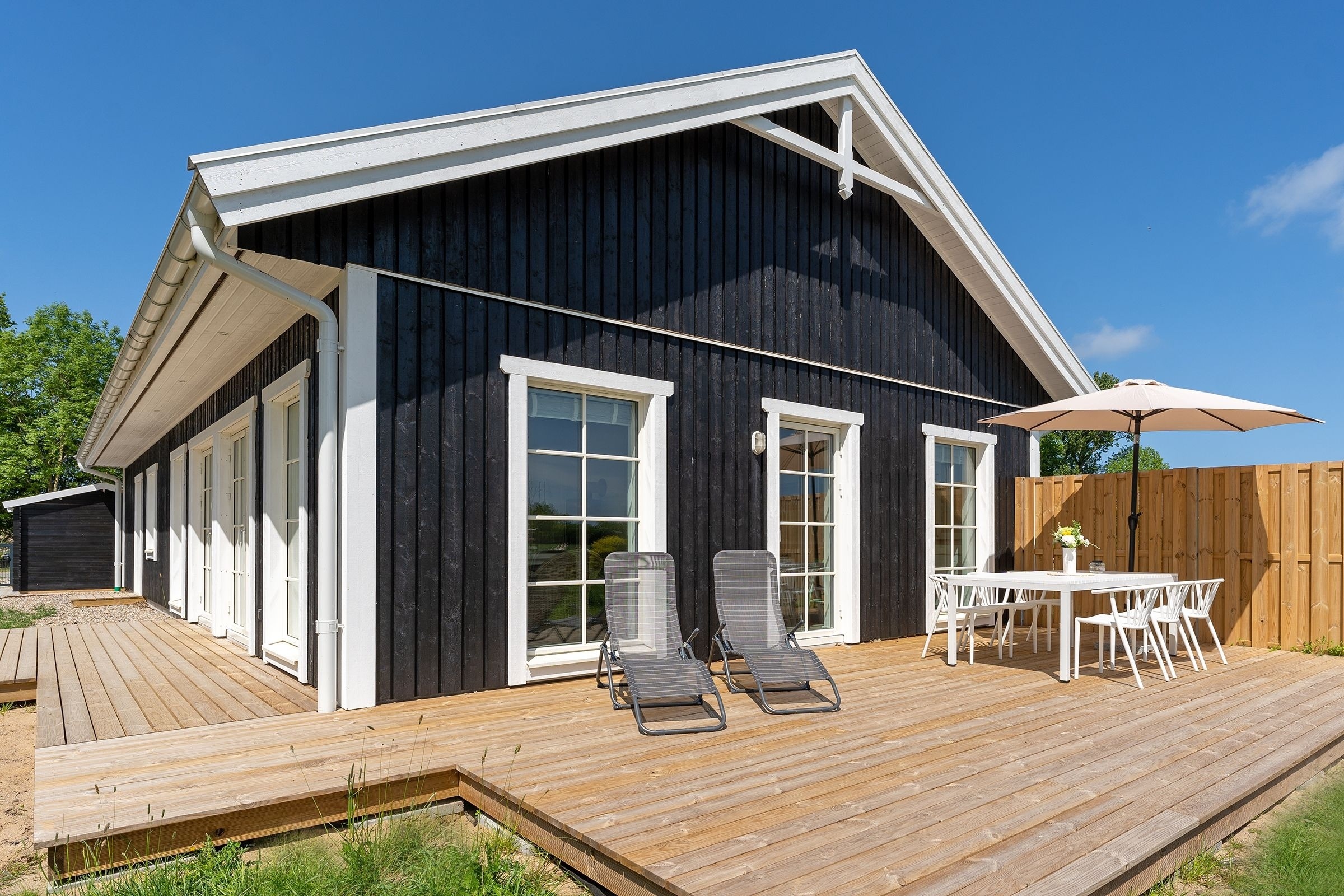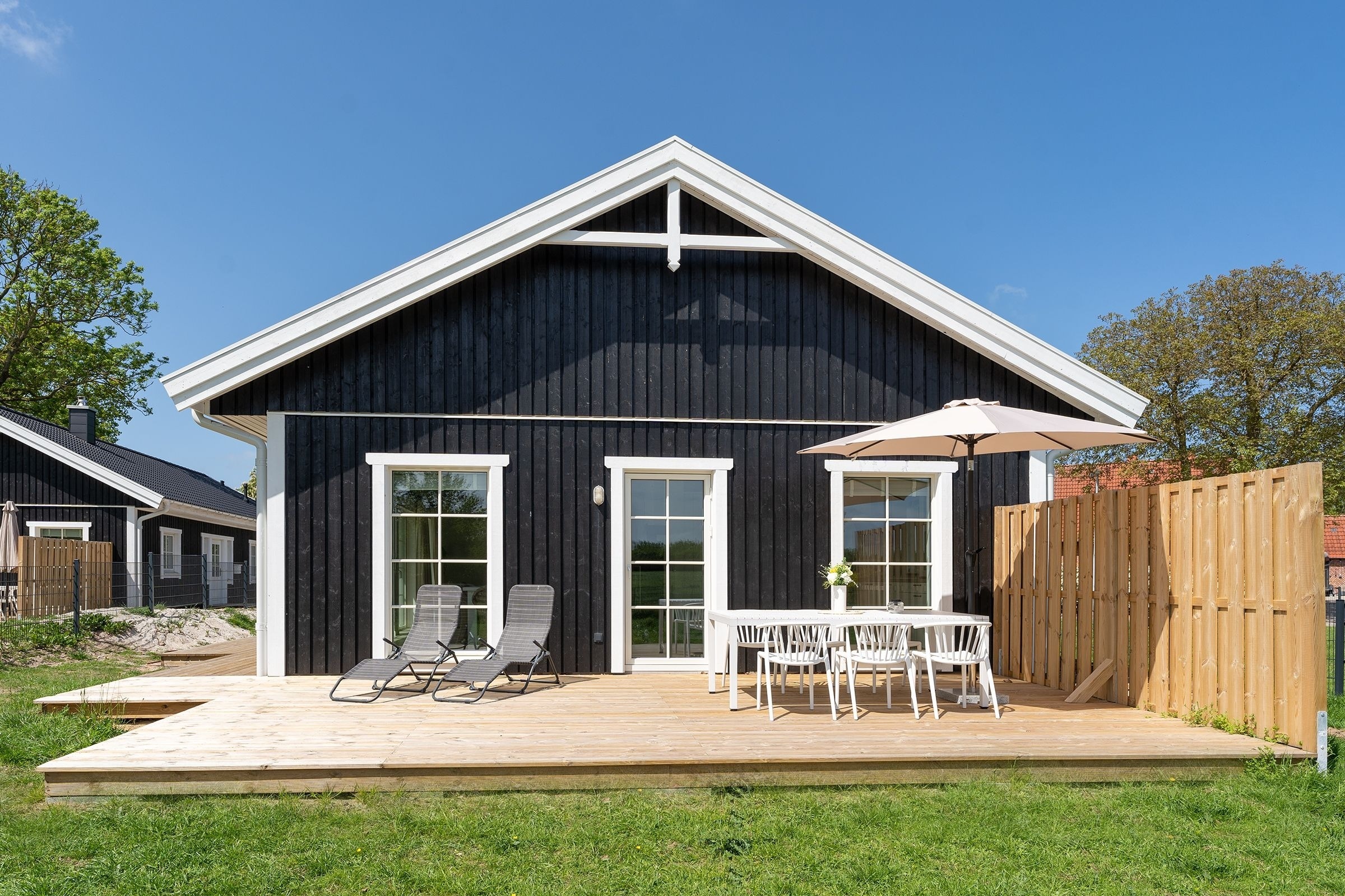 Das Ferienhaus aus Holz empfängt Sie in skandinavischem Stil mit einem offenen Wohnraum mit hoher Decke. Die geschmackvolle Einrichtung und das gemütliche Sofa laden direkt zum Entspannen ein. Während hier ein Teil der Mitreisenden auf dem Sofa das flackernde Feuer im Kaminofen beobachtet, können sich weitere Gäste in der offenen Küche mit angrenzendem Tresen auf den Urlaub einstimmen. Für die nächtliche Erholung gibt es drei Schlafzimmer, eines mit einem Boxspringdoppelbett (180x200 cm), eines mit normalem Doppelbett (140x200 cm) und eines mit einem Etagenbett (2x 80x200 cm) und eigenem TV-Gerät. Für den frischen Start in den Tag stehen zwei Tageslicht-Bäder zur Verfügung, die jeweils mit offener Dusche und Fußbodenheizung begeistern. Als besonderes Highlight gibt es eine eigene Sauna im Haus. Der Außenbereich lässt mit Süd-Ost-Terrasse, Gartenmöbeln und Sonnenliegen keine Wünsche offen. Die Terrasse ist überdacht, sodass Sie bei jeder Wetterlage die frische Luft genießen können.