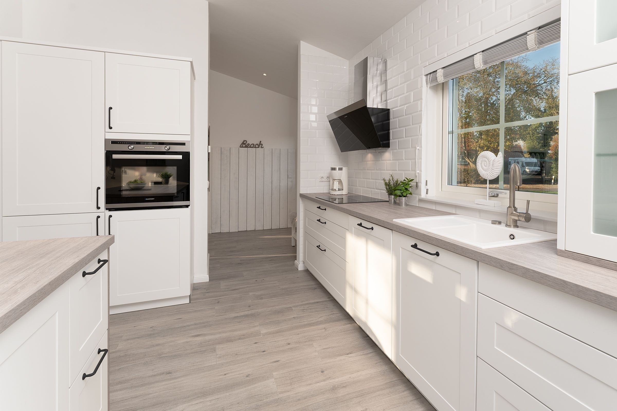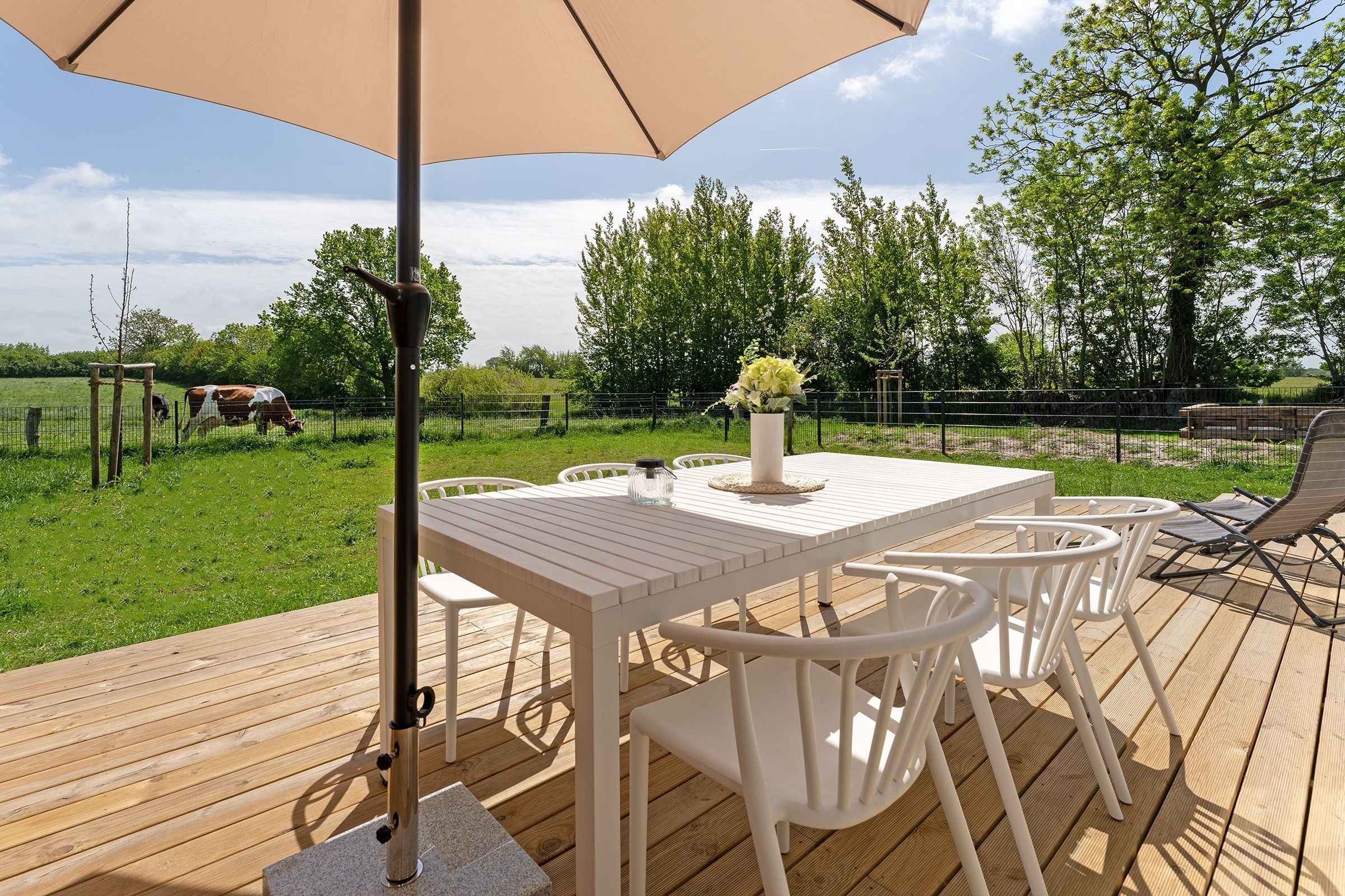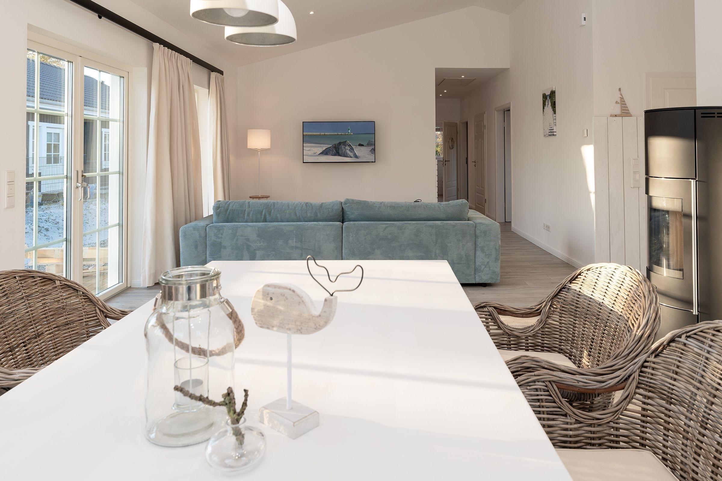 Das Ferienhaus aus Holz empfängt Sie in skandinavischem Stil mit einem offenen Wohnraum mit hoher Decke. Die geschmackvolle Einrichtung und das gemütliche Sofa laden direkt zum Entspannen ein. Während hier ein Teil der Mitreisenden auf dem Sofa das flackernde Feuer im Kaminofen beobachtet, können sich weitere Gäste in der offenen Küche mit angrenzendem Tresen auf den Urlaub einstimmen. Für die nächtliche Erholung gibt es drei Schlafzimmer, eines mit einem Boxspringdoppelbett (180x200 cm), eines mit normalem Doppelbett (140x200 cm) und eines mit einem Etagenbett (2x 80x200 cm) und eigenem TV-Gerät. Für den frischen Start in den Tag stehen zwei Tageslicht-Bäder zur Verfügung, die jeweils mit offener Dusche und Fußbodenheizung begeistern. Als besonderes Highlight gibt es eine eigene Sauna im Haus. Der Außenbereich lässt mit Süd-Ost-Terrasse, Gartenmöbeln und Sonnenliegen keine Wünsche offen. Die Terrasse ist überdacht, sodass Sie bei jeder Wetterlage die frische Luft genießen können.