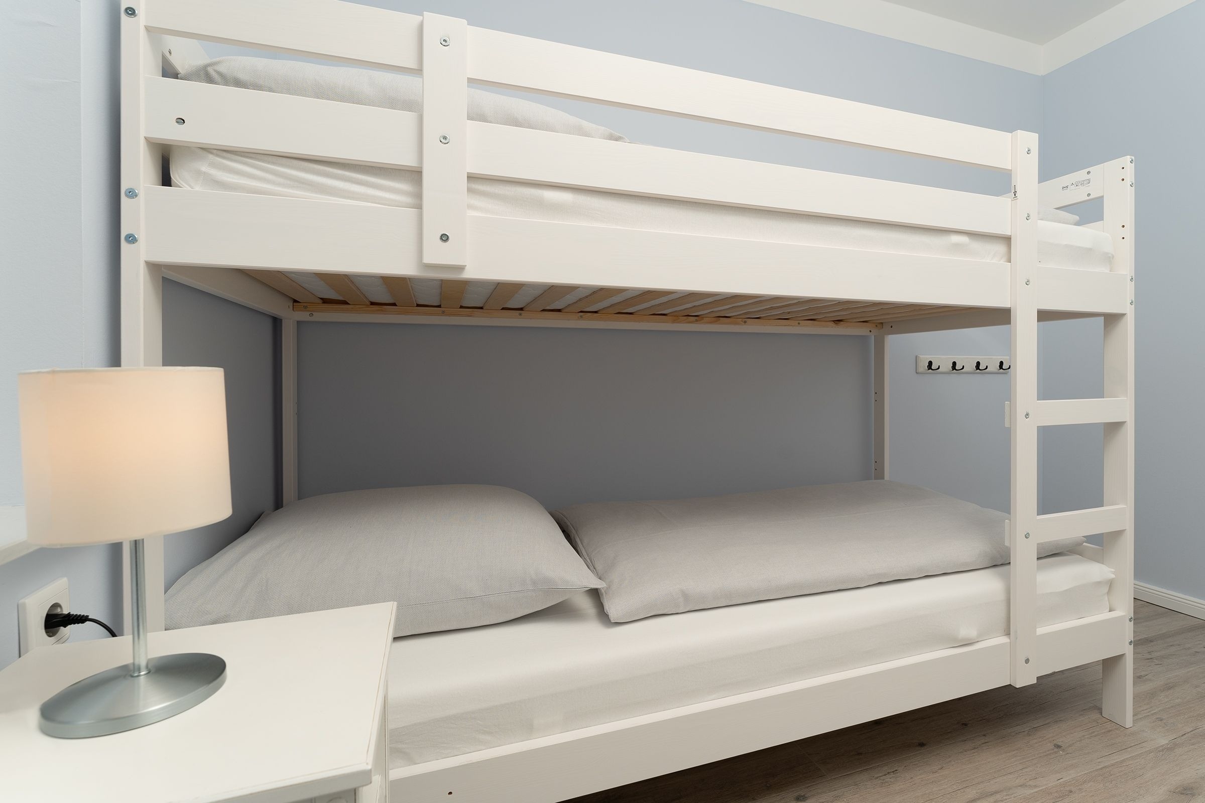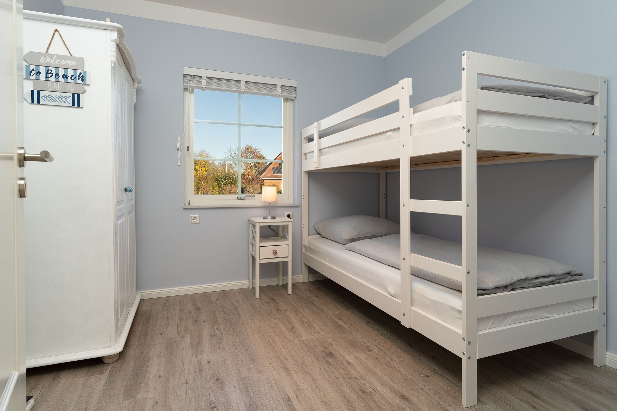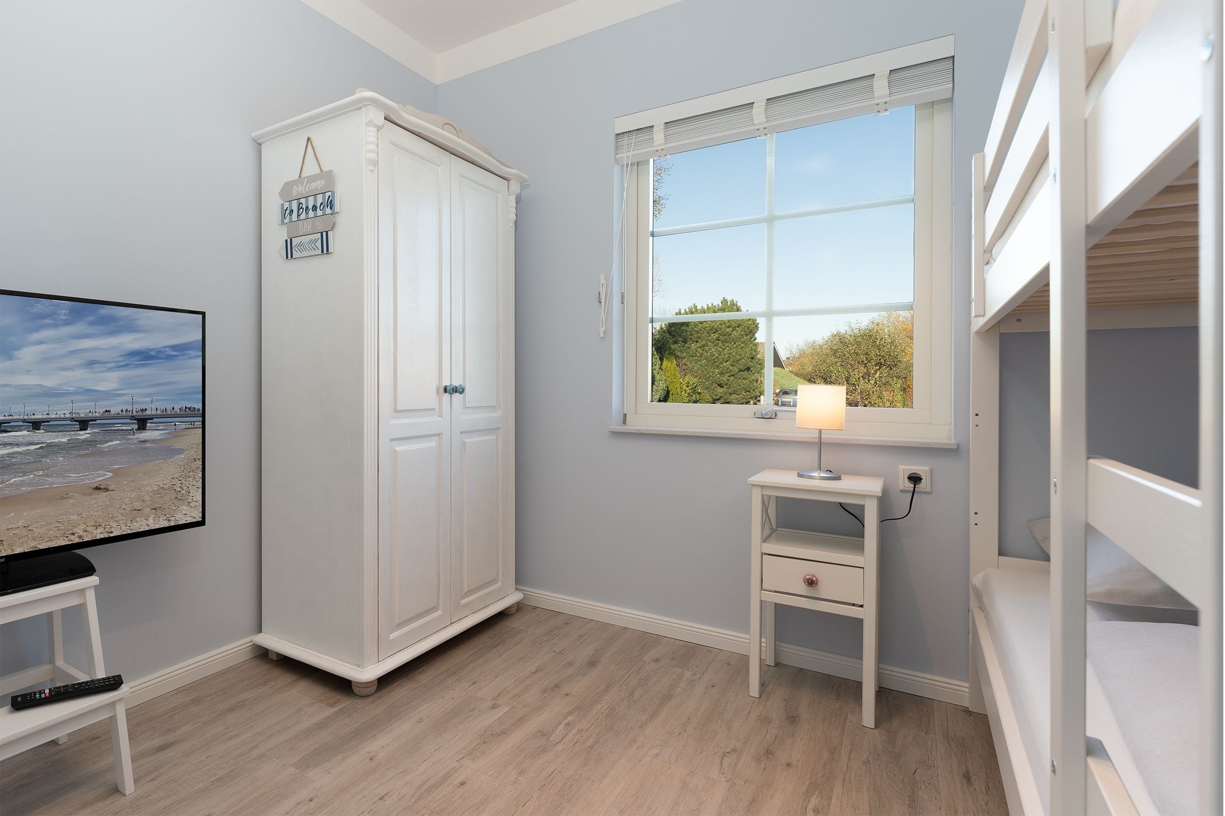 Schlafzimmer 2: 1 Etagenbett (2x 80x200 cm), Kleiderschrank, TV, Verdunkelung (Holzjalousien)