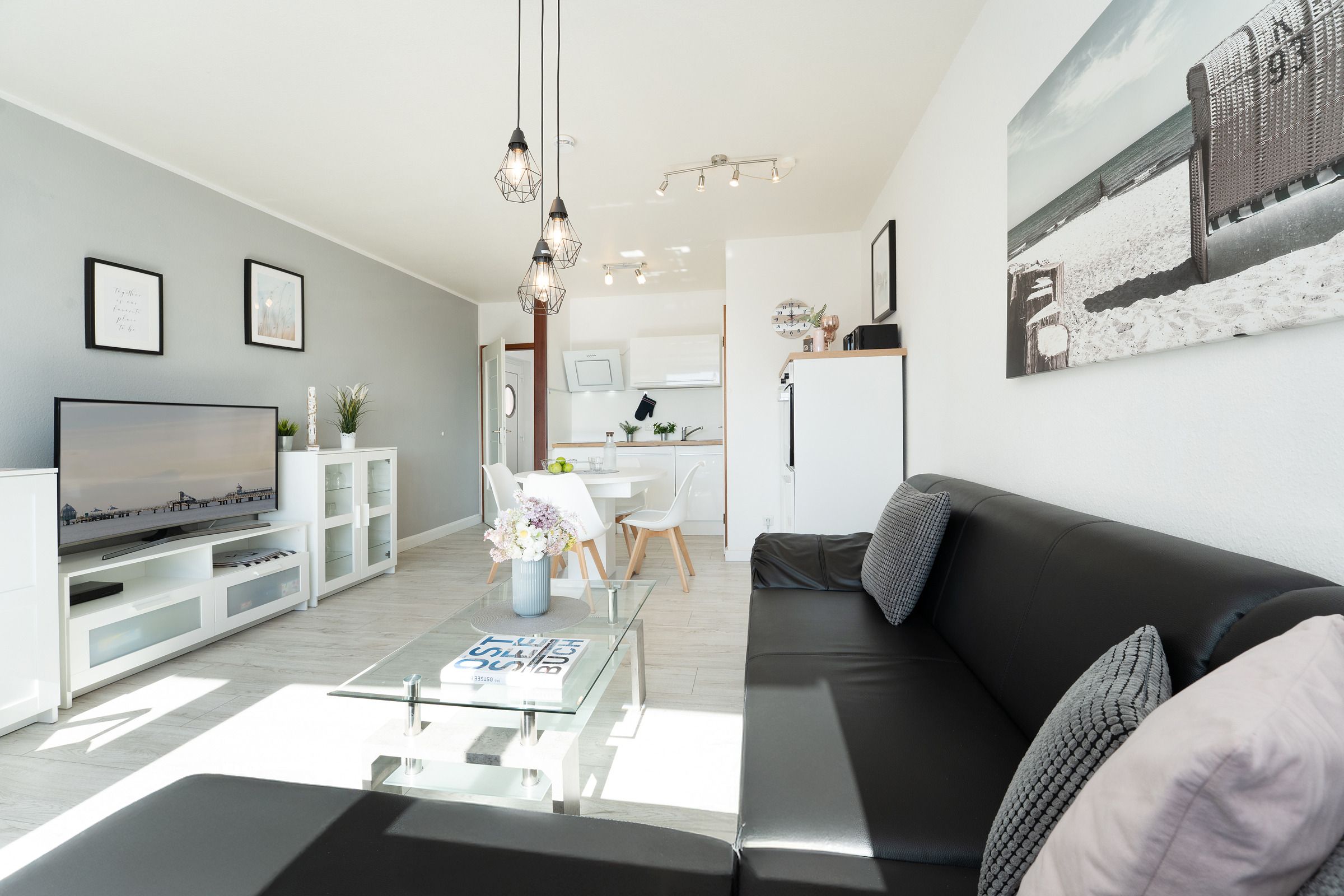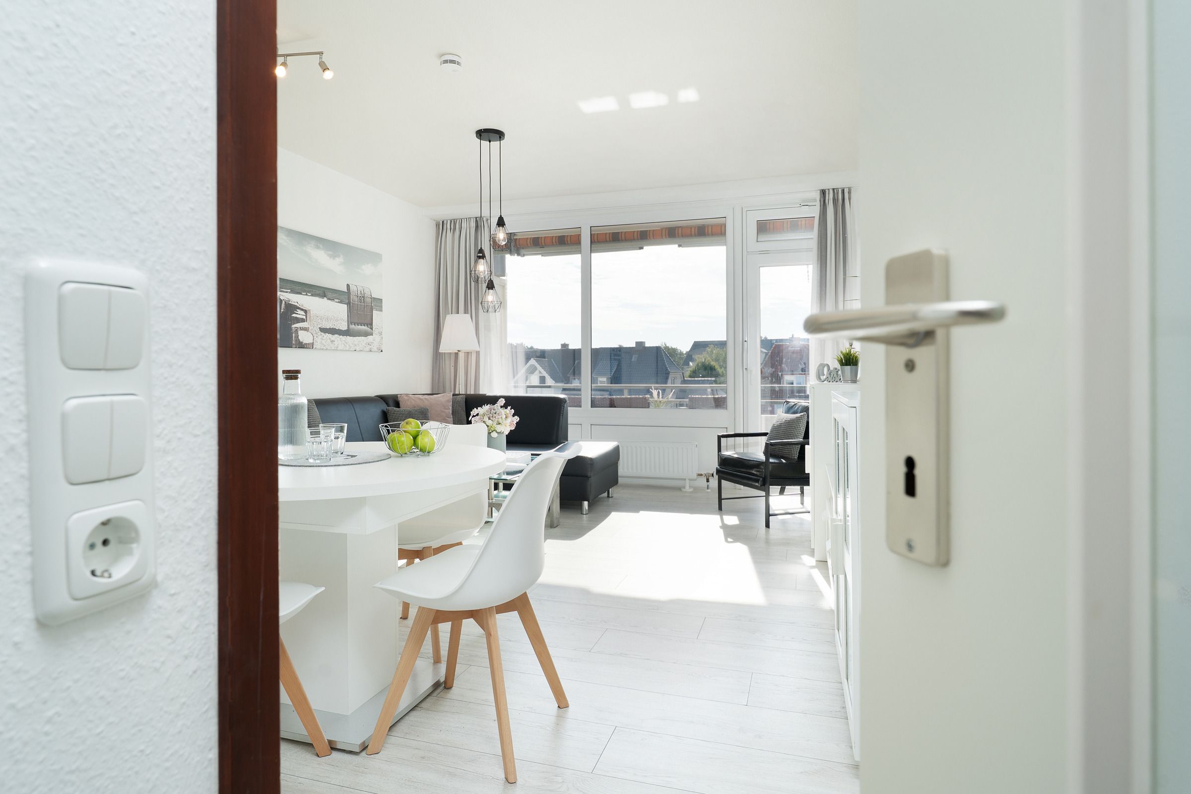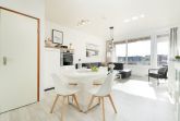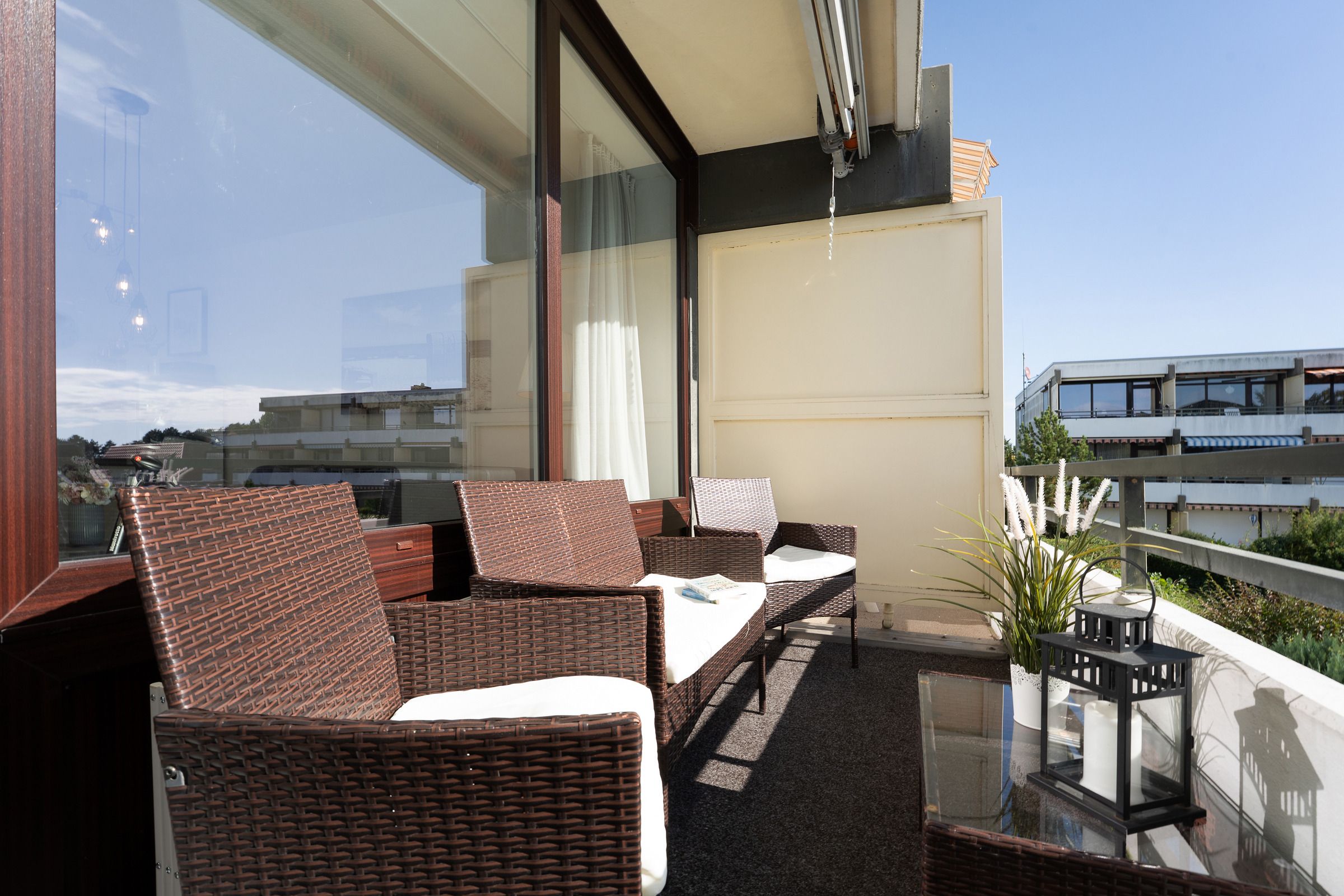 Durch den Eingang gleich rechts erreichen Sie den hellen, stets lichtdurchfluteten Wohnbereich mit Sofa und Flachbildfernseher. Der Esstisch bietet bequem Platz für die ganze Familie. Vom Wohnbereich aus gelangen Sie auf den möblierten Balkon mit Süd-Ost-Ausrichtung. In der voll ausgestattete Küche können Sie köstliche Mahlzeiten zubereiten. Das separate Schlafzimmer ist mit einem Doppelbett (2x 90x200cm), einem weiteren TV sowie einem Kleiderschrank ausgestattet und lässt sich zur Nacht angenehm abdunkeln. Genießen Sie den Komfort im hellgefliesten Badezimmer mit Dusche und beheizbaren Handtuchhalter.