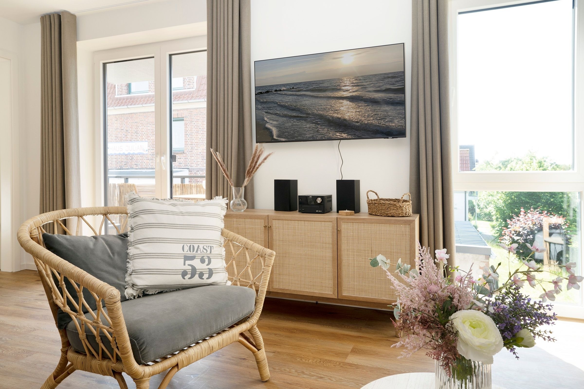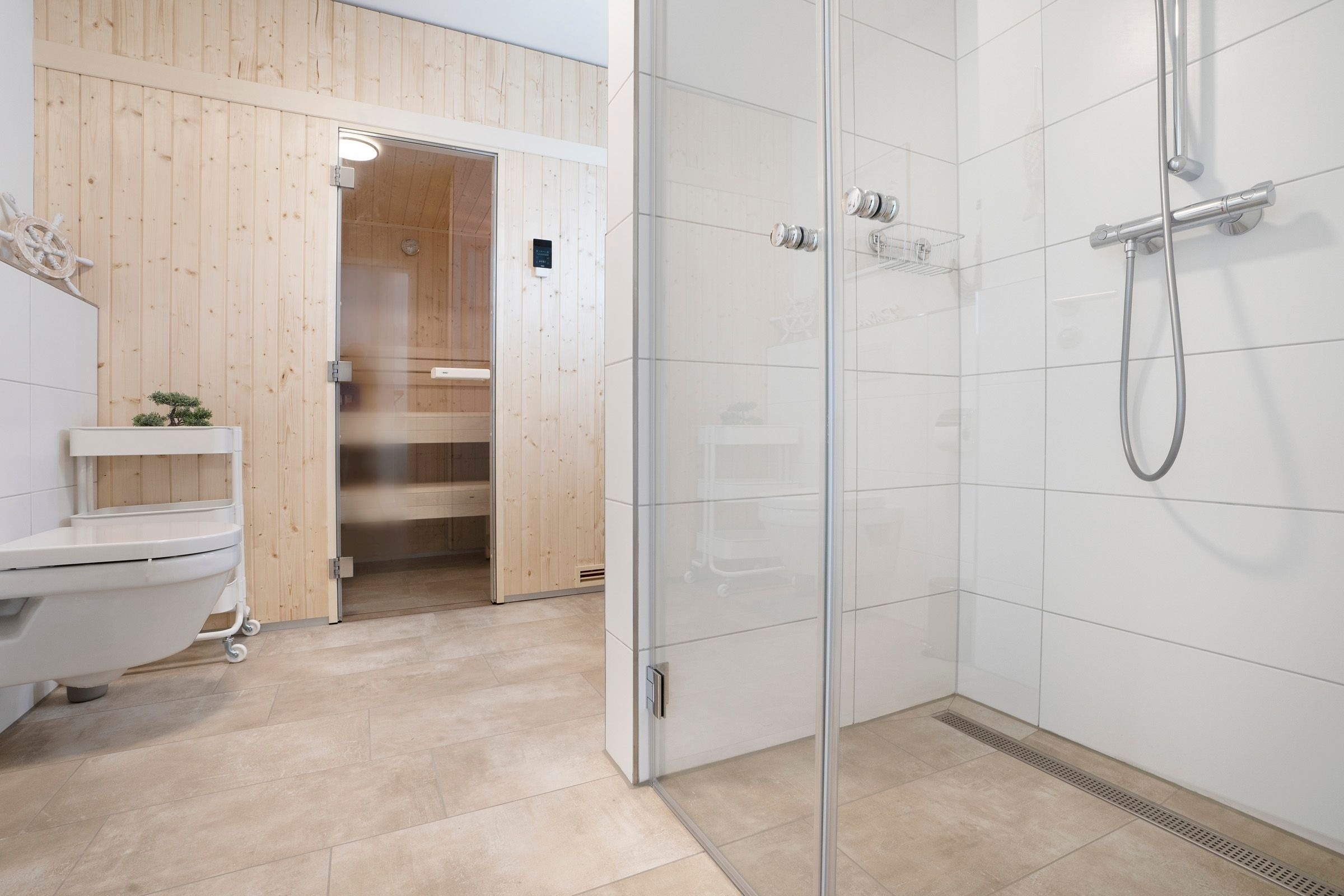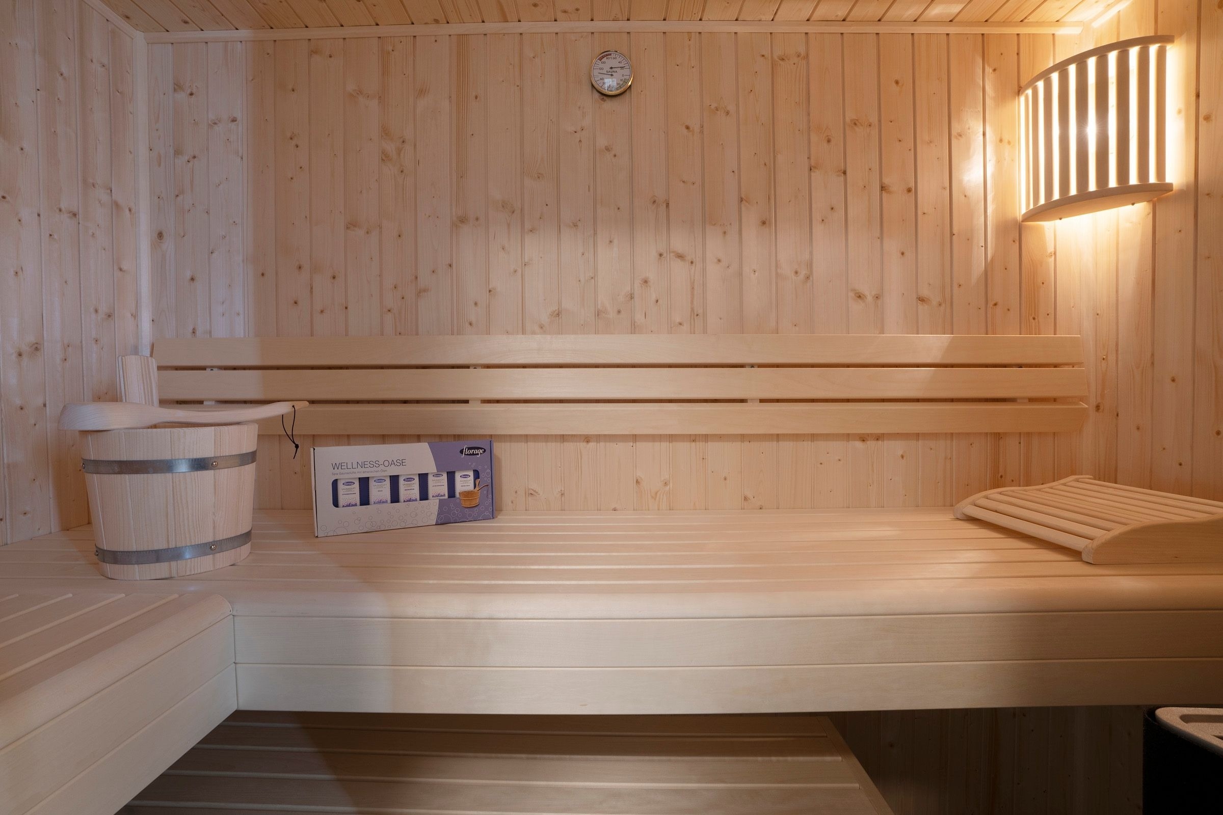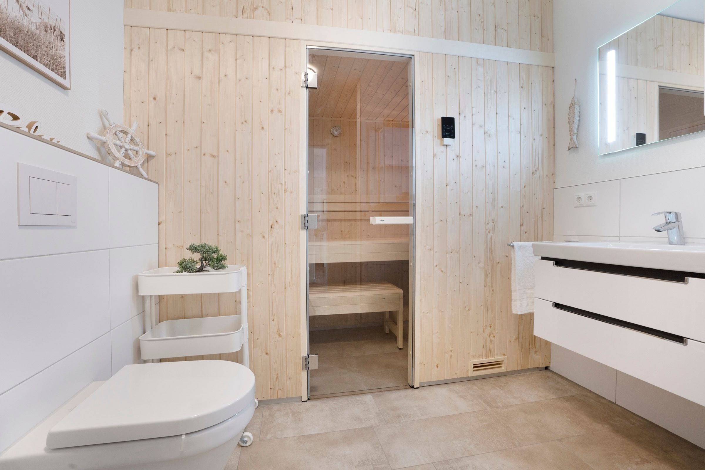 Auf 57 m² Wohnfläche erwartet Sie ein moderner Wohn- und Essbereich mit ausreichend Platz zum gemütlichen Beisammensein. Die Couch lässt sich bei Bedarf in eine weitere Schlafmöglichkeit (155x200 cm) verwandeln. Das Zubereiten der Mahlzeiten wird Ihnen in der modernen, gut ausgestatteten Küche sicherlich Freude bereiten. Vom Wohnbereich aus gelangen Sie auf den möblierten, überdachten Südost-Balkon. Hier können Sie ausgiebige Sonnenstunden genießen und die Seele baumeln lassen. Im Schlafzimmer befindet sich ein komfortables Doppelbett (2x 90x200 cm) sowie ein Kleiderschrank mit ausreichend Platz für Ihre Urlaubsgarderobe. Das Badezimmer verfügt über Dusche/WC und als besonderes Highlight sogar über eine eigene Sauna.
