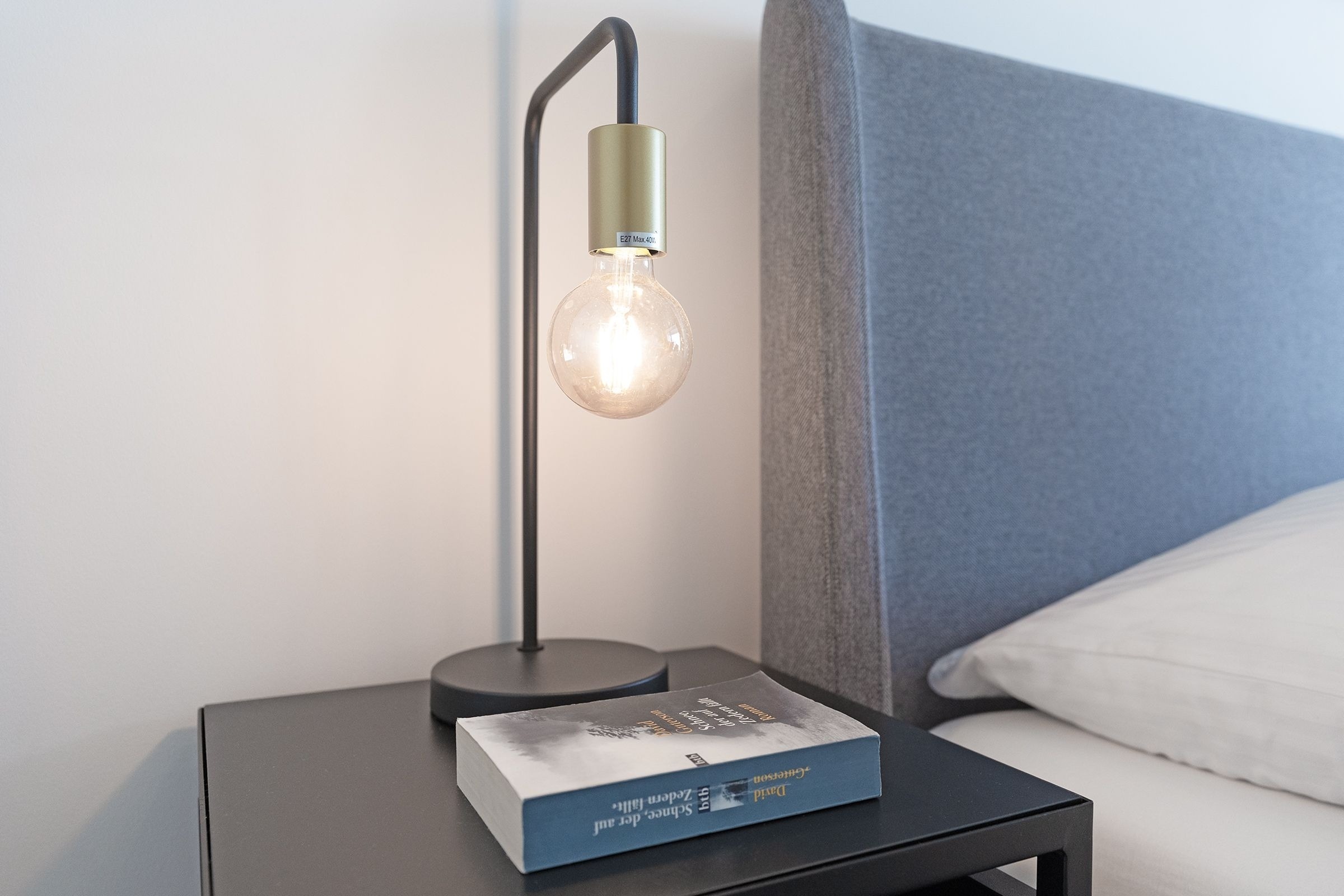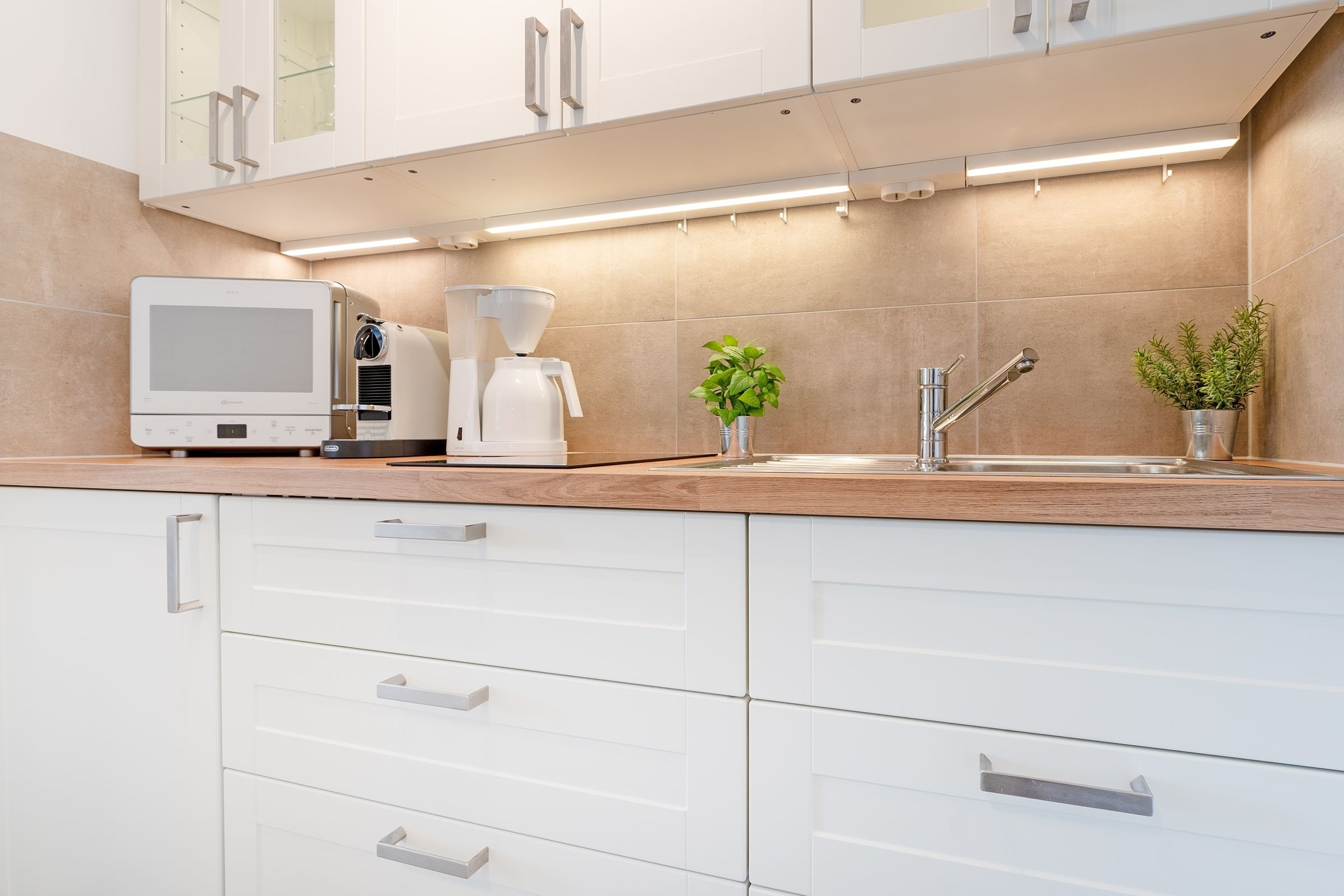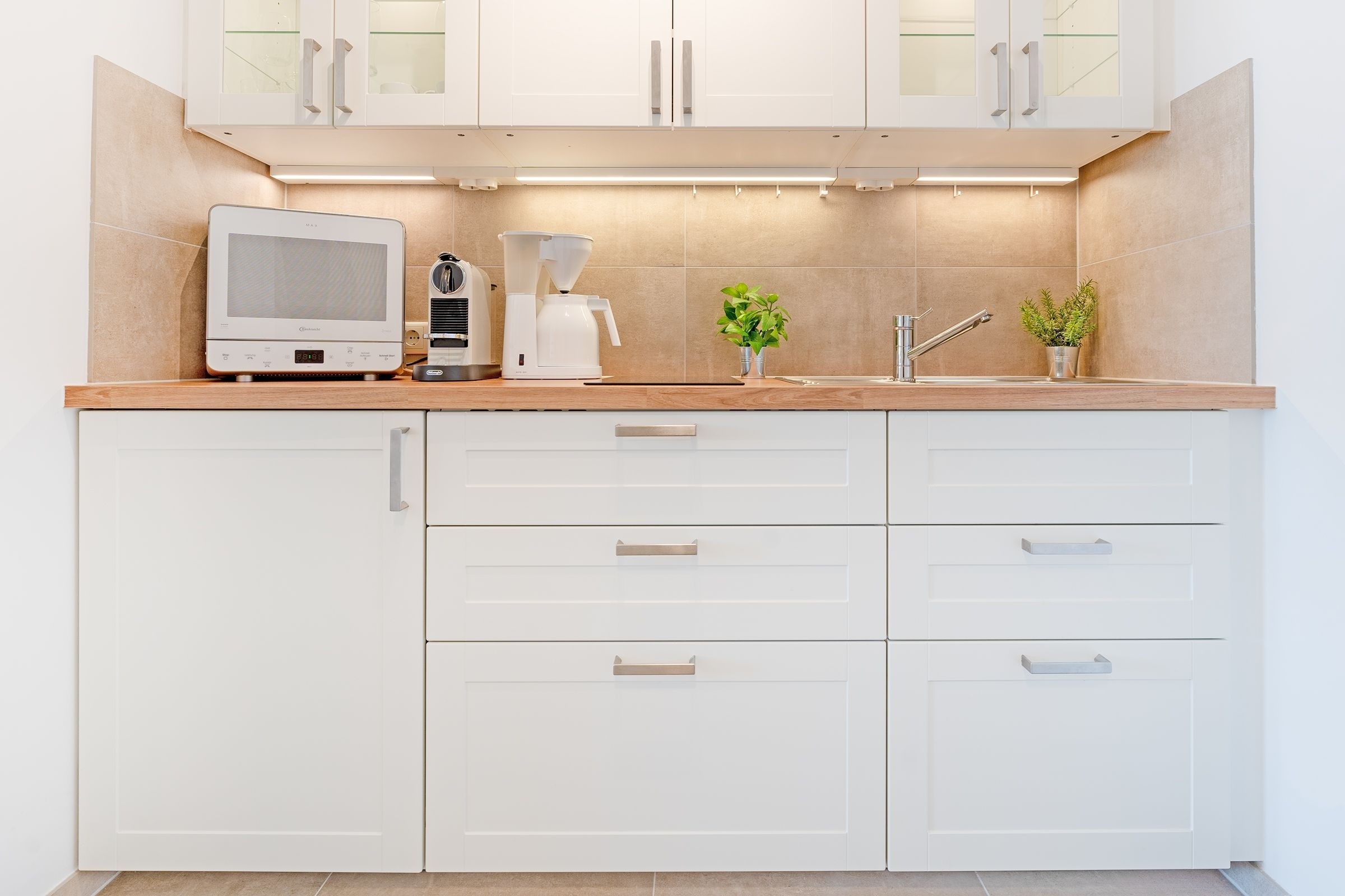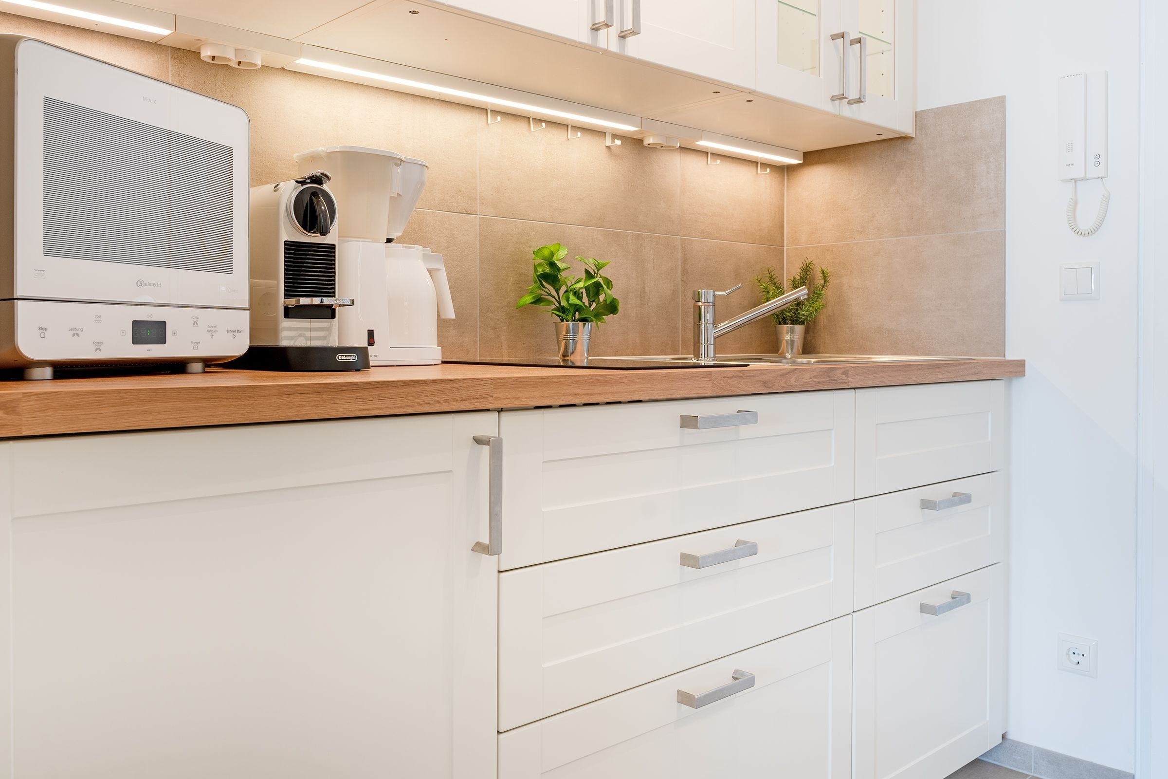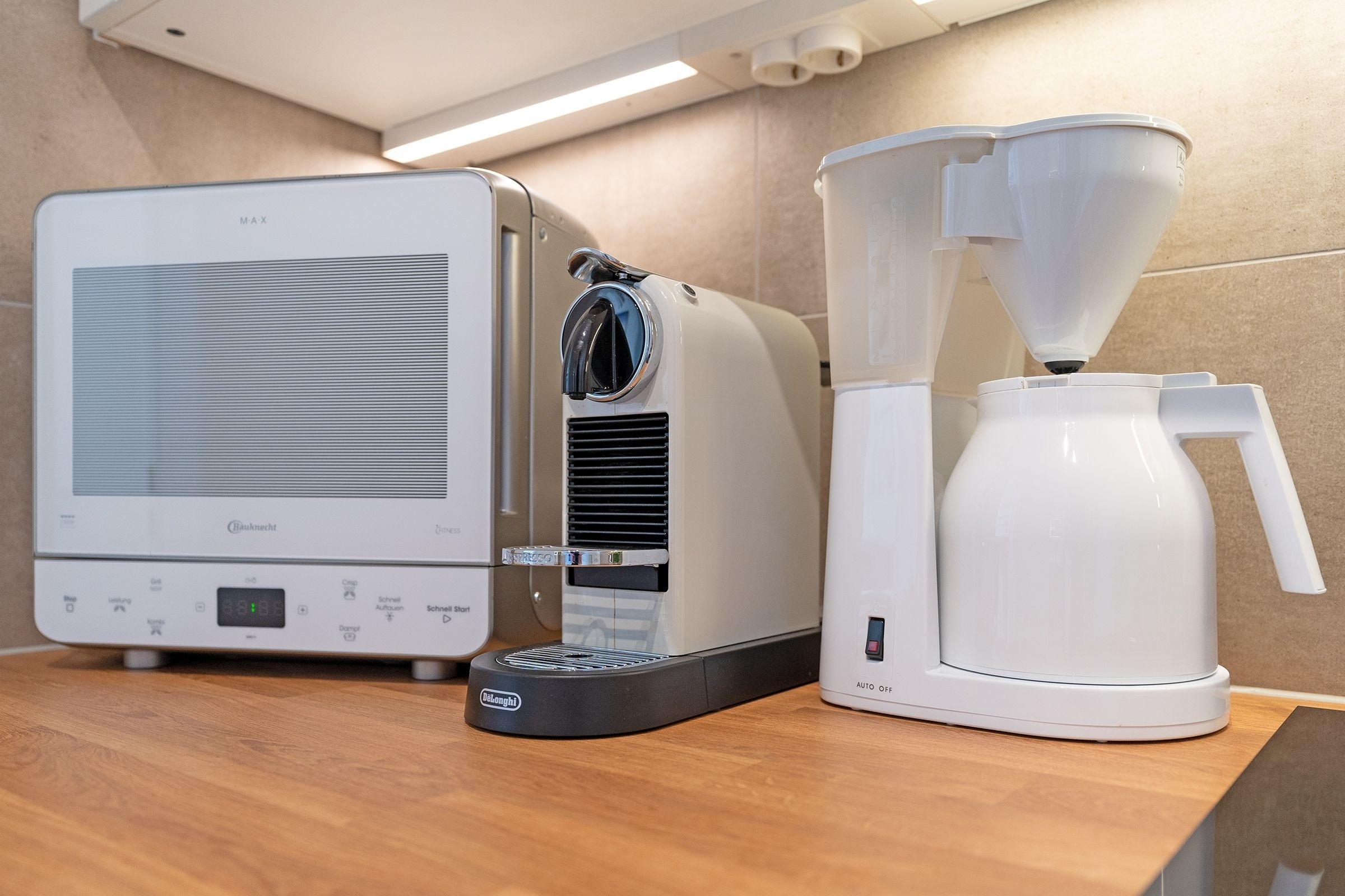 Im kombinierten Wohn- und Schlafraum finden Sie Ruhe im Doppelbett (2x 80x200 cm) oder auf dem Schlafsofa (120x195 cm). Das angrenzende Badezimmer bietet Ihnen ein Rundum-Wohlfühlpaket mit bodengleicher Dusche und Haartrockner. In der vom Eingangsbereich abgehenden, offenen Küche finden Sie neben einem Kühlschrank mit Gefrierfach und Toaster unter anderem auch ein Kombigerät mit Mikrowelle- und Backofenfunktion.
