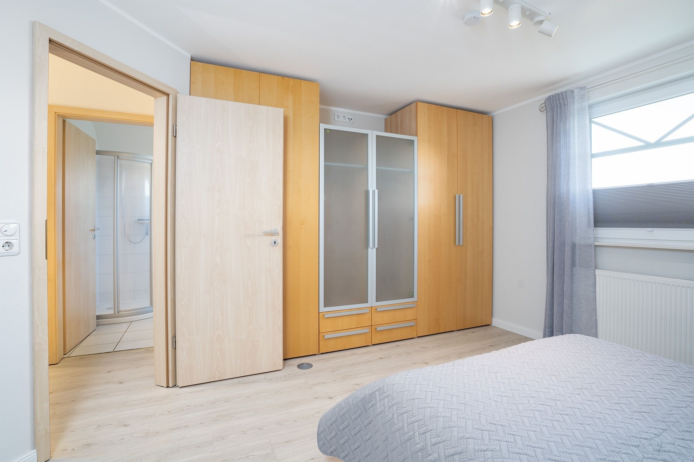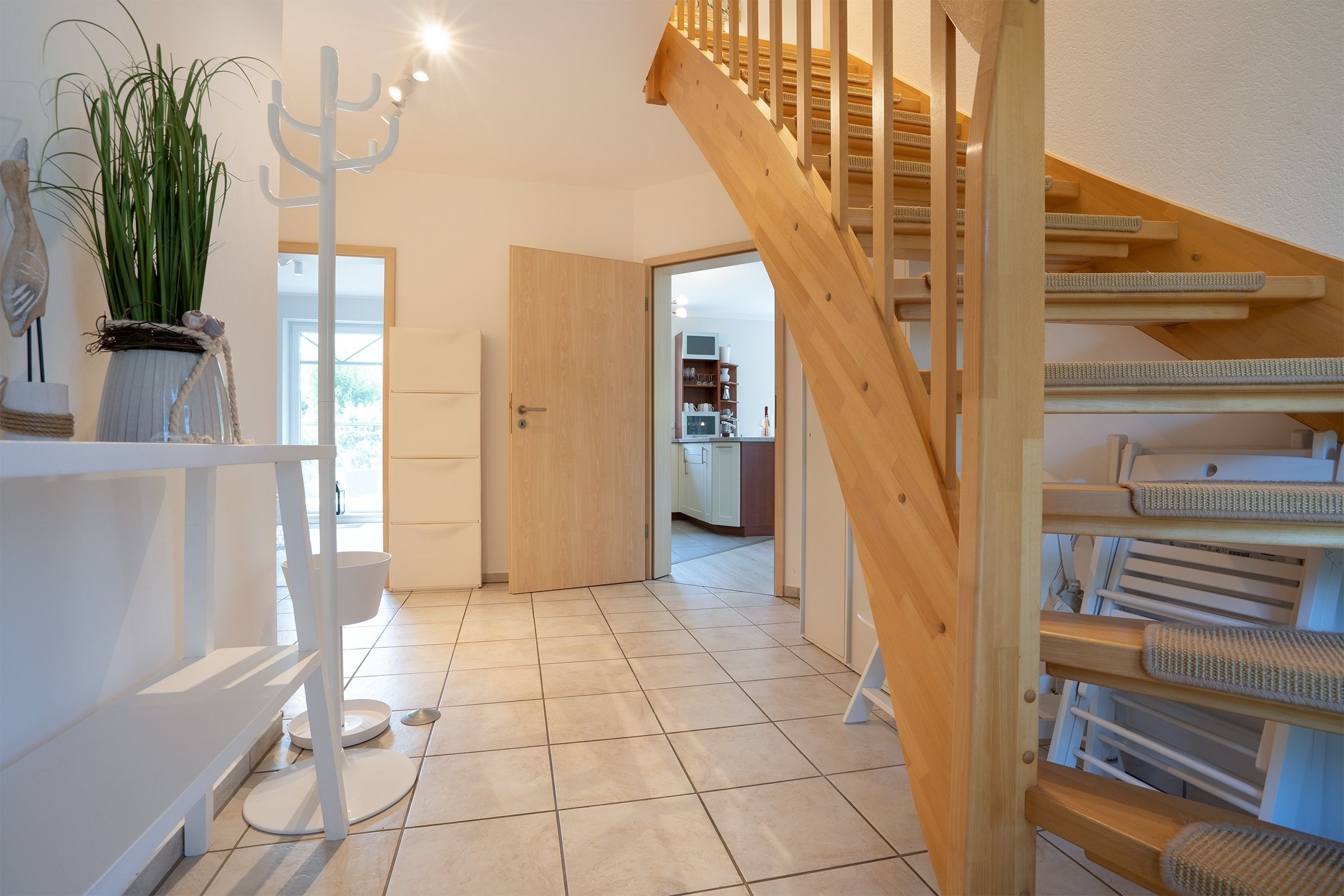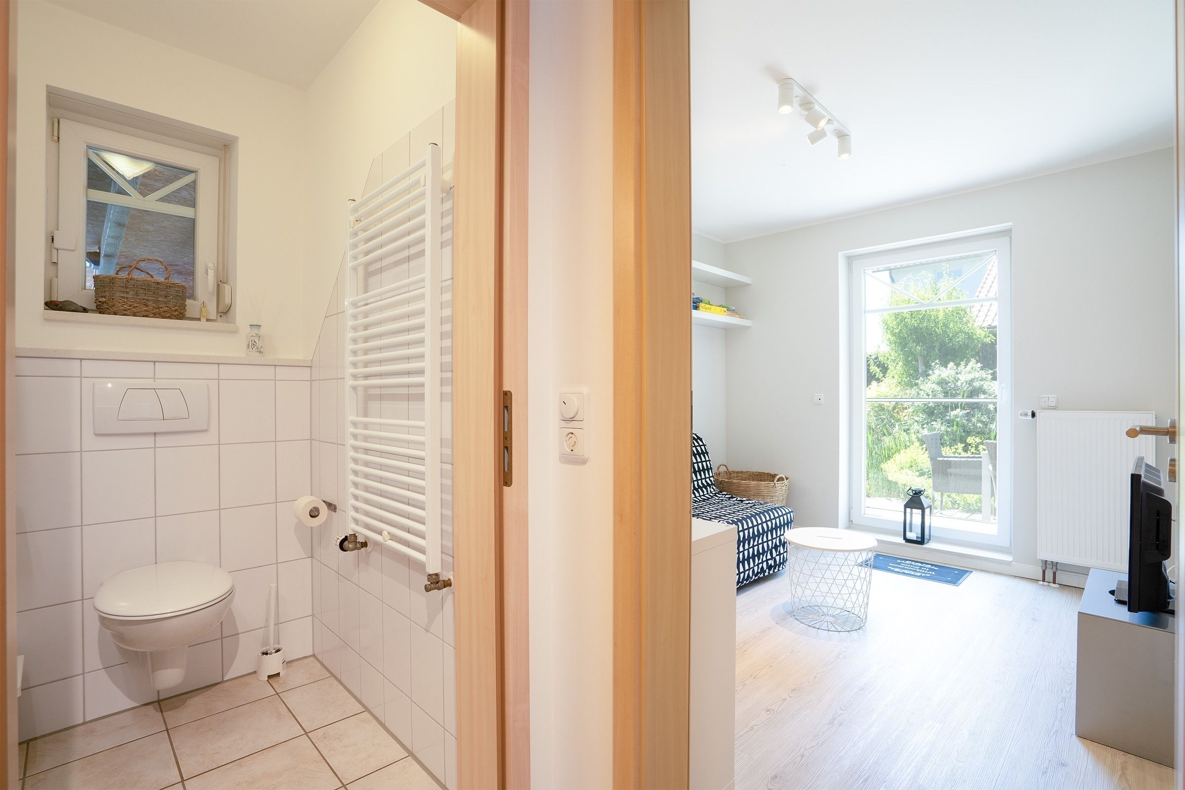 Das Ferienhaus beeindruckt durch ein lichtdurchflutetes Wohnzimmer mit einem Flachbild-TV und einer Sofalandschaft. In der offenen, integrierten Küche bereiten Sie Ihre Mahlzeiten zu und können diese am angrenzenden Essplatz gemeinsam einnehmen. Von hier aus gelangen Sie auf die möblierte Terrasse und in den Garten. Lassen Sie den Tag im Strandkorb oder in der Hängematte ausklingen. Ein Kohlegrill steht für gemeinsame Grillabende bereit. Im 1. Obergeschoss erwarten Sie drei Schlafzimmer, eines davon mit Doppelbett (140x200 cm). Das zweite Schlafzimmer bietet mit zwei Einzelbetten (90 x 200 cm) viel Schlafkomfort. Das letzte Schlafzimmer verfügt ebenfalls über zwei Einzelbetten (je 80 x 200 cm und 90 x 200 cm), wovon ein Bett zu einem weiteren Schlafplatz (80 x 200 cm) ausgezogen werden kann. Alle Schlafzimmer sind mit einem Kleiderschrank und einer Verdunkelungsmöglichkeit (Plissees) ausgestattet, Platz für ein Babybett ist ebenfalls vorhanden. Für das Rundum-Urlaubsgefühl sorgen im Badezimmer eine Fußbodenheizung, die große Eckbadewanne und eine Dusche sowie ein separates Gäste-WC im Erdgeschoss.