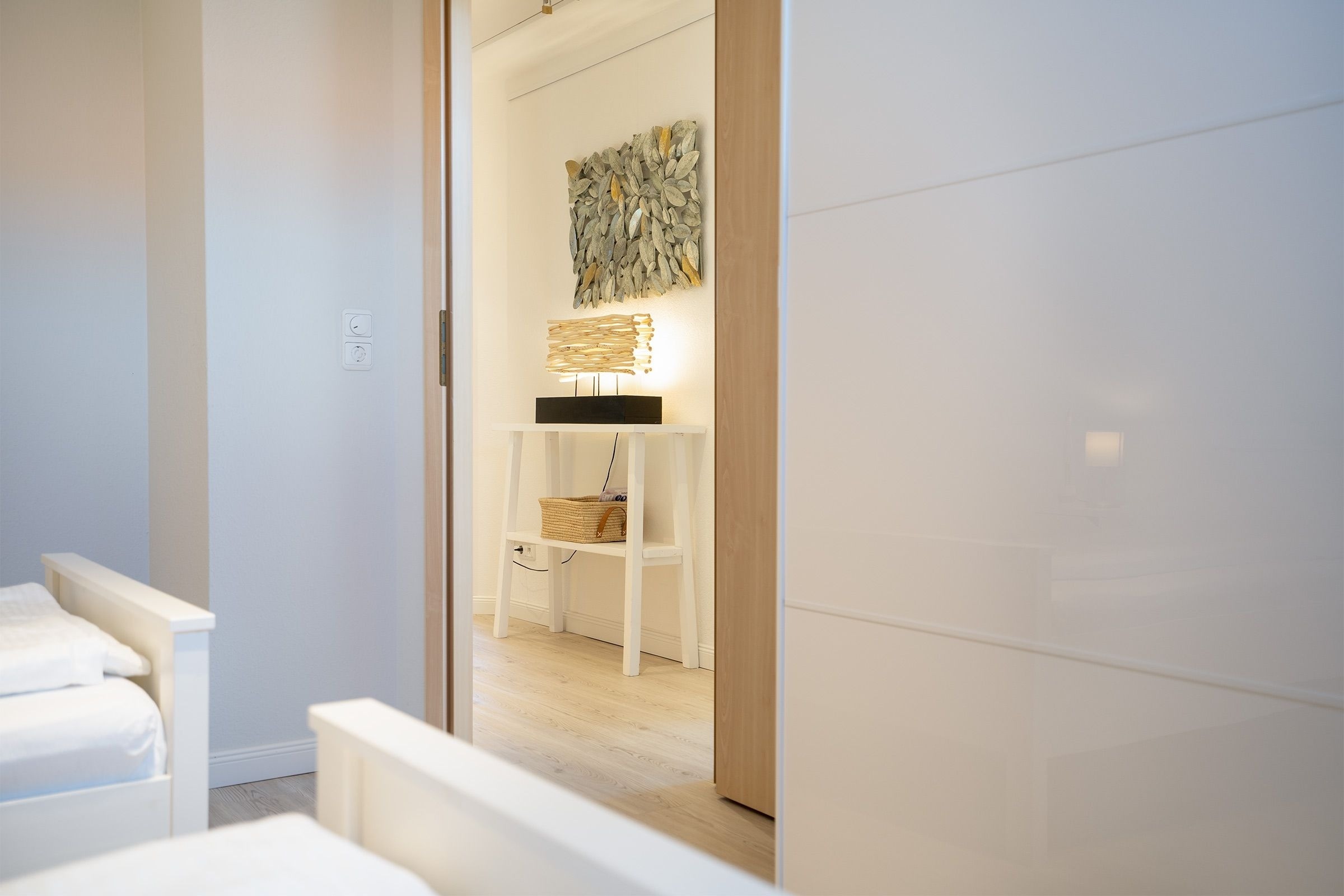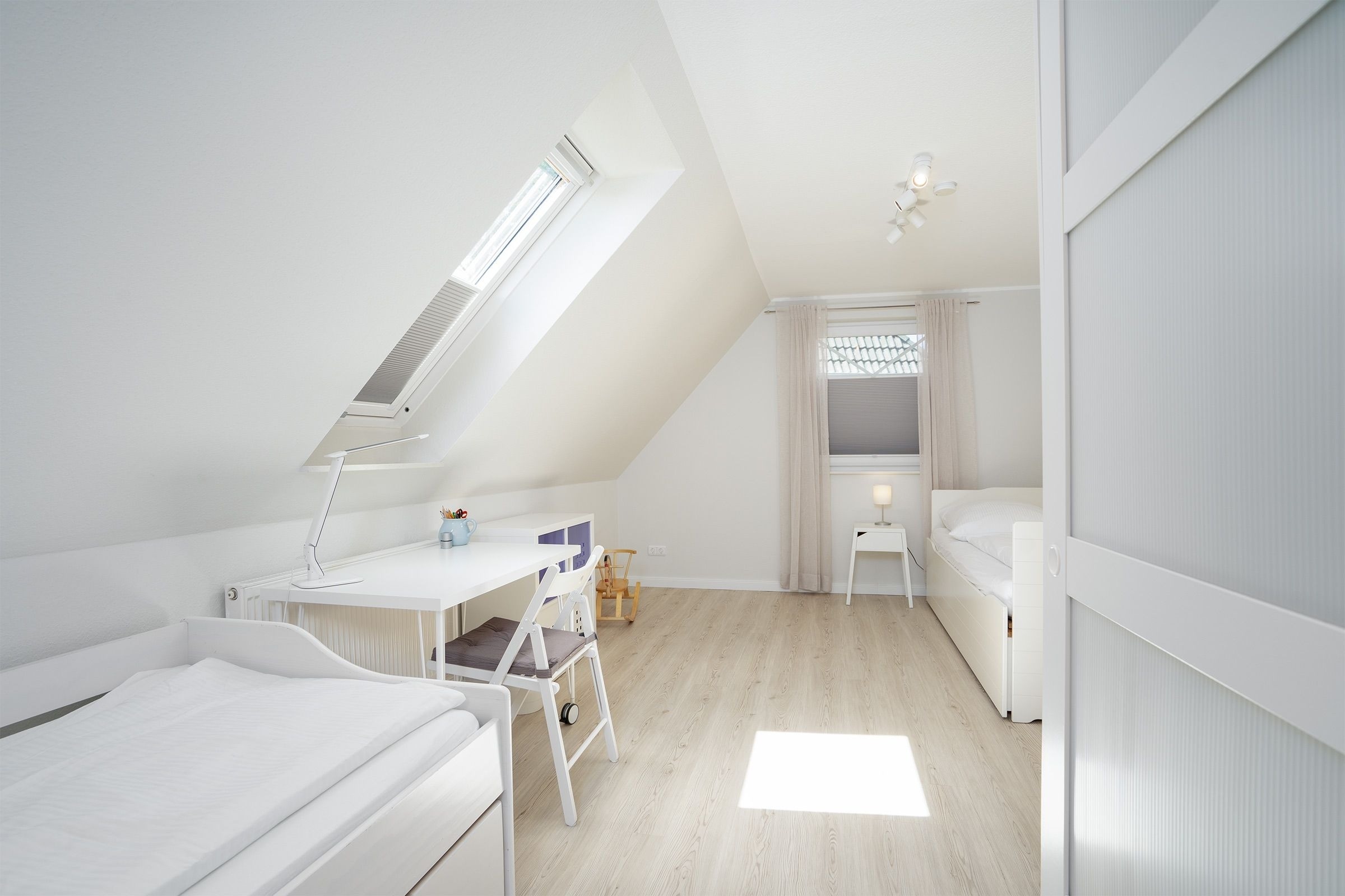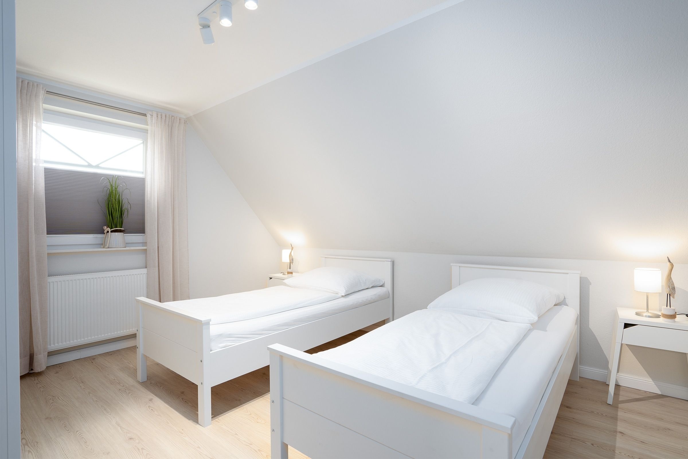 Schlafzimmer 2 (1. OG): 2 Einzelbetten (je 90x200 cm), Kleiderschrank, Verdunkelung (Plissees)