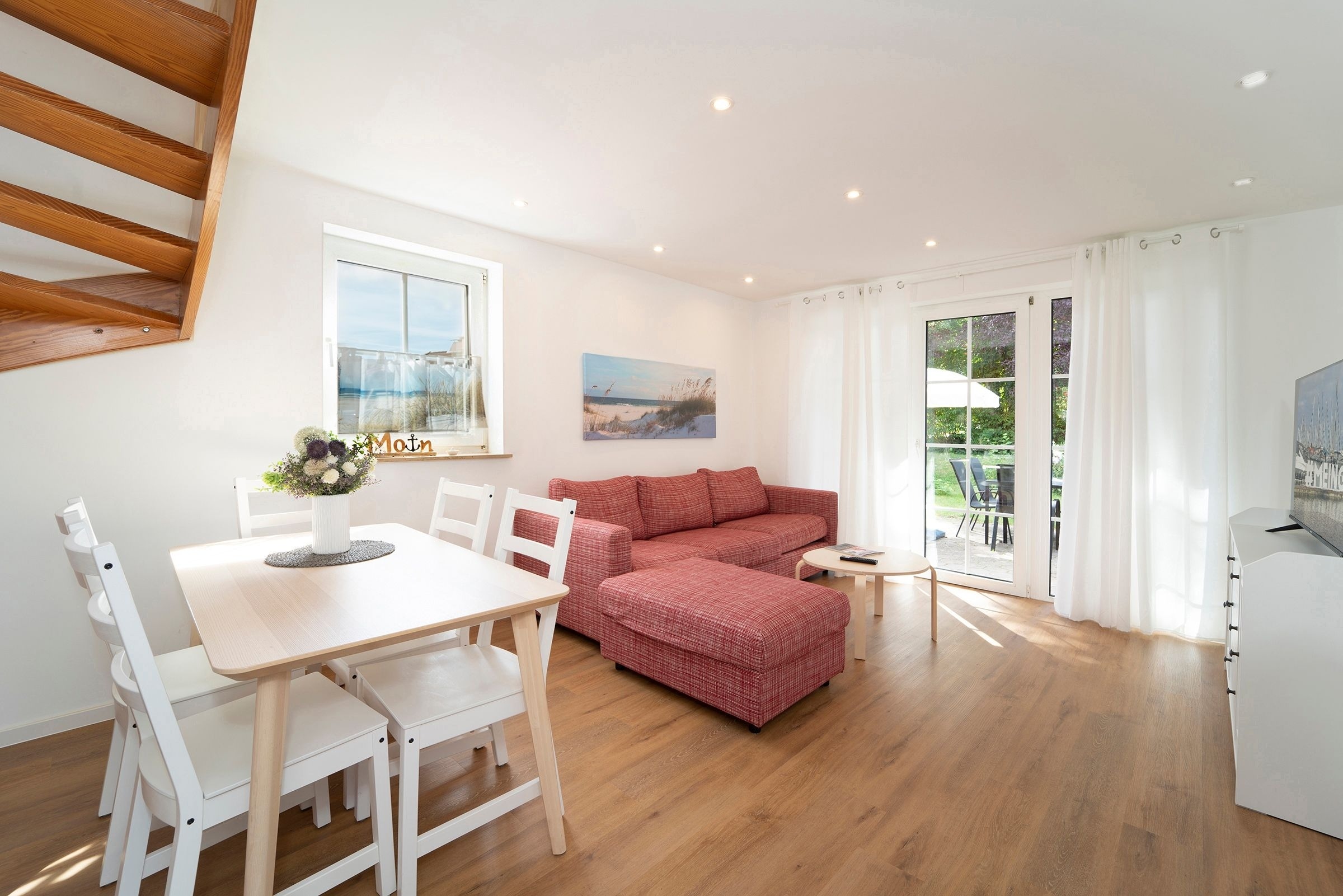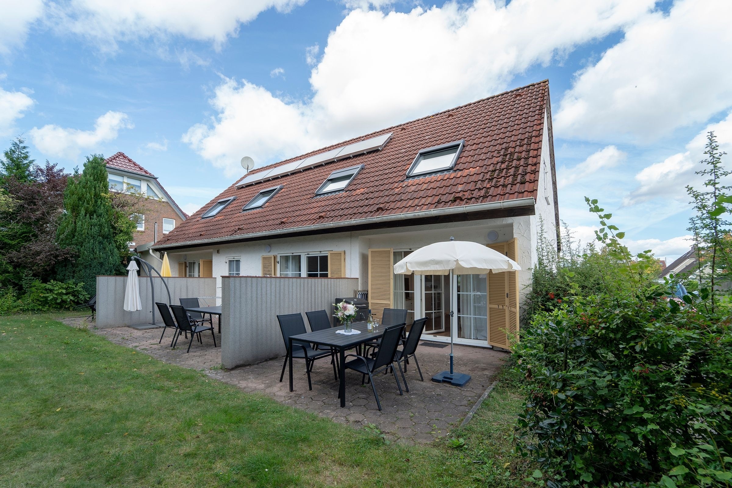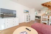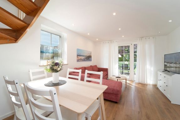 Der Wohn-/Essbereich mit offener Küche lädt zum gemeinsamen Essen, Fernsehen und erholsamen Urlaubsstunden ein. In der offenen voll ausgestatteten Küche finden Sie alles, um sich und Ihre Lieben kulinarisch zu verwöhnen. Vom Wohnbereich gelangen Sie auf die Terrasse mit Gartenmöbel, der perfekte Ort, um einen ereignisreichen Urlaubstag bei einem Glas Wein ausklingen zu lassen. Das angrenzende Gartenstück wird gemeinschaftlich von allen Bewohnern der Anlage genutzt. Drei Schlafzimmer und zwei moderne Bäder, befinden sich in der 1. Etage. Zwei Schlafzimmer sind jeweils mit einem Doppelbett (2x 90x200 cm) und Kleiderschrank ausgestattet. Das dritte Schlafzimmer verfügt über ein Einzelbett (90x200 cm). Die modernen und hell gefliesten Badezimmer, wovon eins mit einer Sauna ausgestattet ist, runden diese Ferienwohnung mit Dusche (Schwelle nur 2cm) und Fußbodenheizung ab.