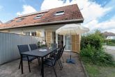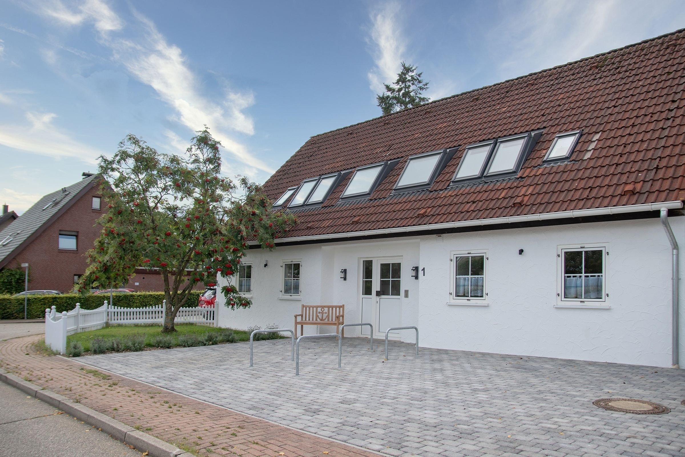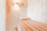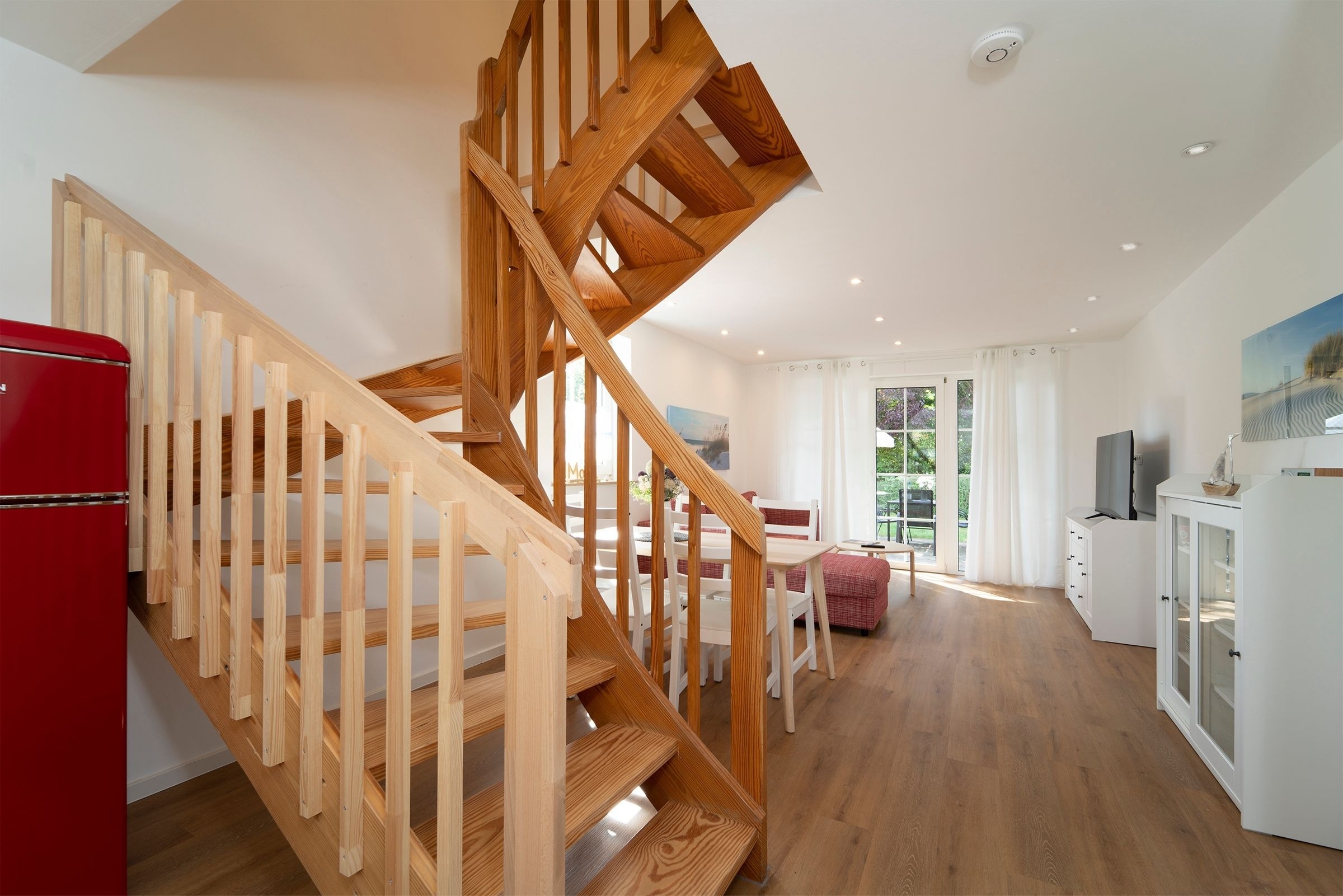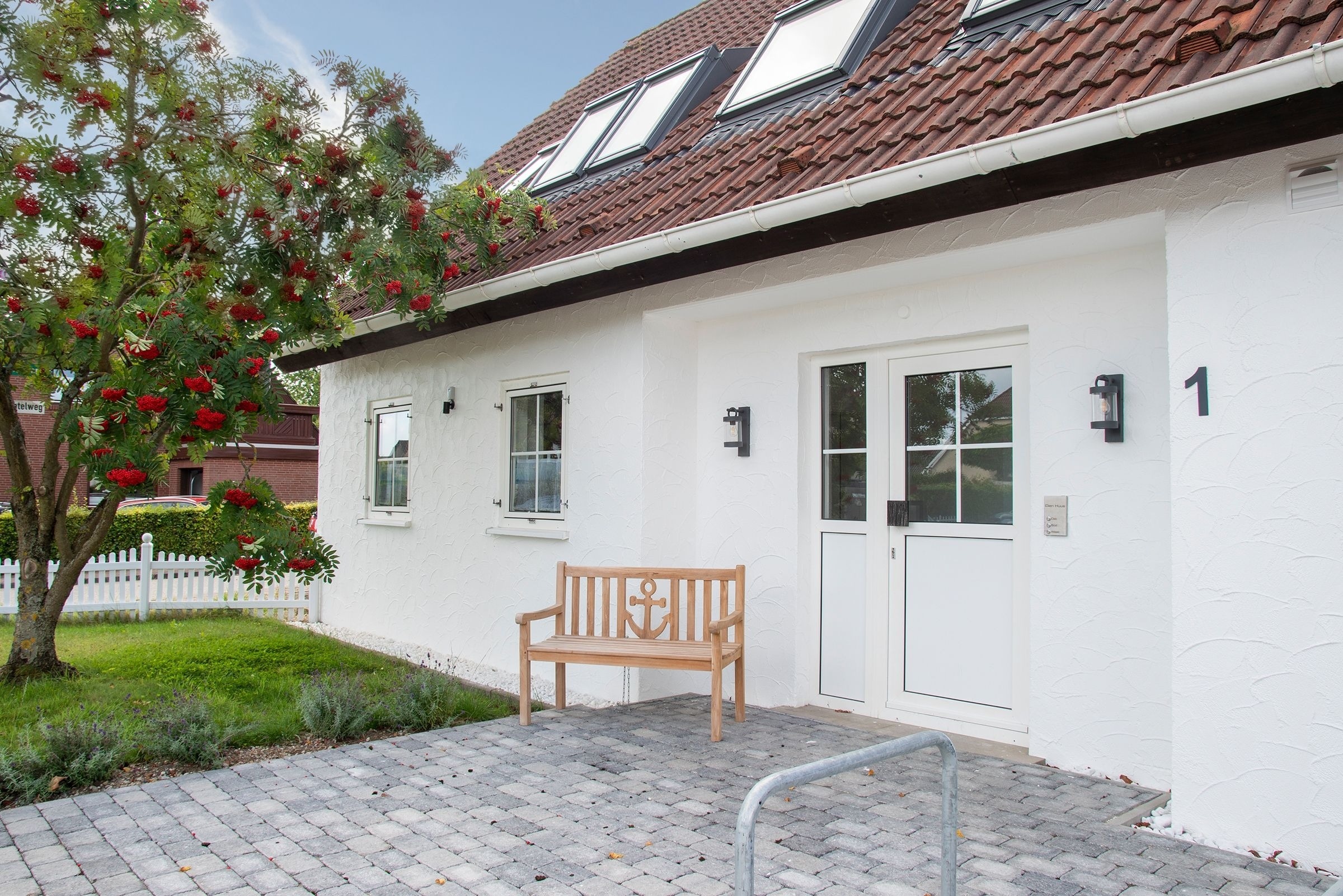 Der Wohn-/Essbereich mit offener Küche lädt zum gemeinsamen Essen, Fernsehen und erholsamen Urlaubsstunden ein. In der offenen voll ausgestatteten Küche finden Sie alles, um sich und Ihre Lieben kulinarisch zu verwöhnen. Vom Wohnbereich gelangen Sie auf die Terrasse mit Gartenmöbel, der perfekte Ort, um einen ereignisreichen Urlaubstag bei einem Glas Wein ausklingen zu lassen. Das angrenzende Gartenstück wird gemeinschaftlich von allen Bewohnern der Anlage genutzt. Drei Schlafzimmer und zwei moderne Bäder, befinden sich in der 1. Etage. Zwei Schlafzimmer sind jeweils mit einem Doppelbett (2x 90x200 cm) und Kleiderschrank ausgestattet. Das dritte Schlafzimmer verfügt über ein Einzelbett (90x200 cm). Die modernen und hell gefliesten Badezimmer, wovon eins mit einer Sauna ausgestattet ist, runden diese Ferienwohnung mit Dusche (Schwelle nur 2cm) und Fußbodenheizung ab.