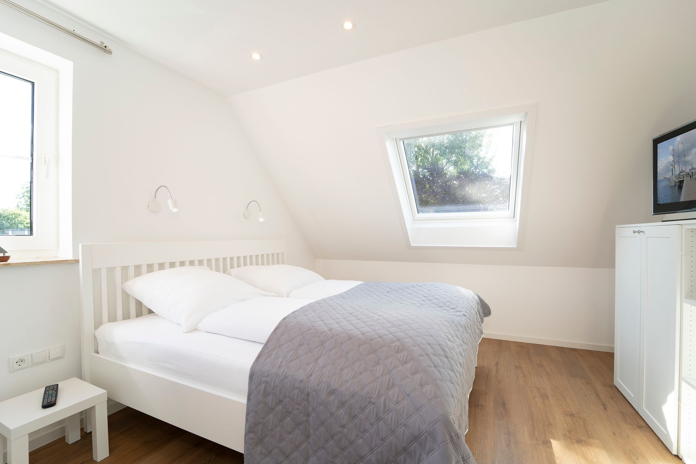 Schlafzimmer 1: 1 Doppelbett (2x 90x200 cm), Kleiderschrank, TV, Verdunkelung: Rollladen und Gardinen, Platz für Babybett