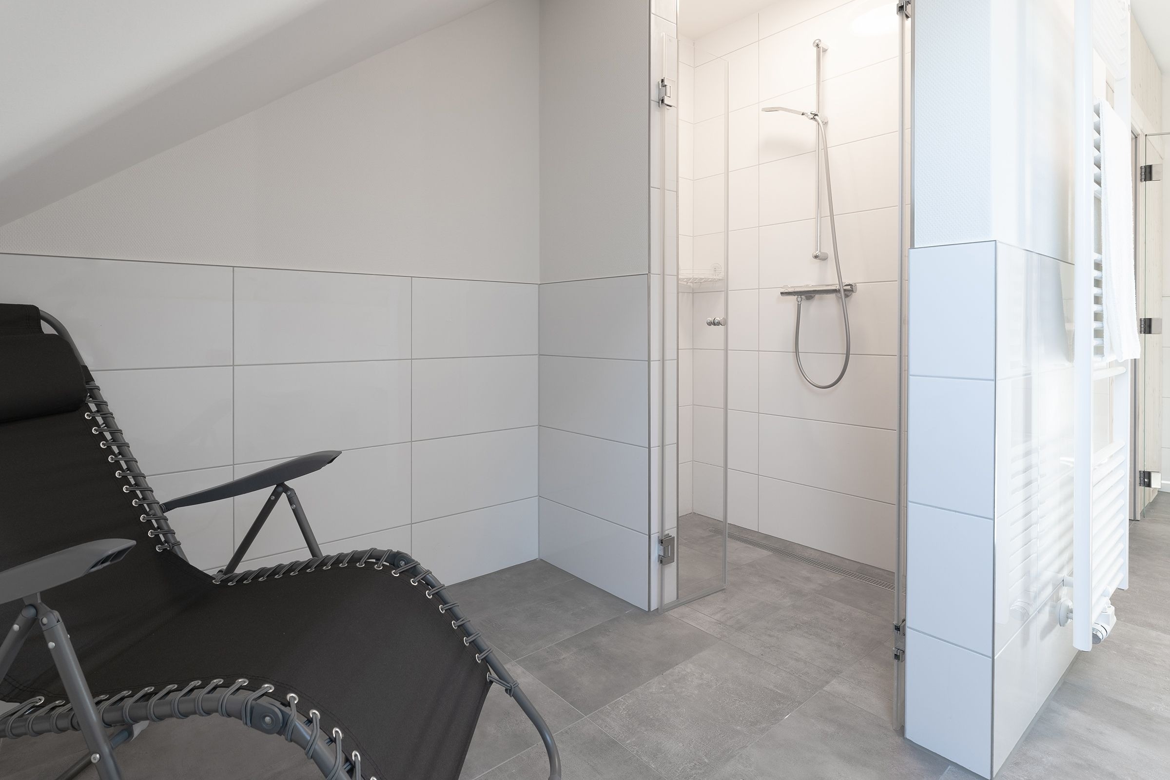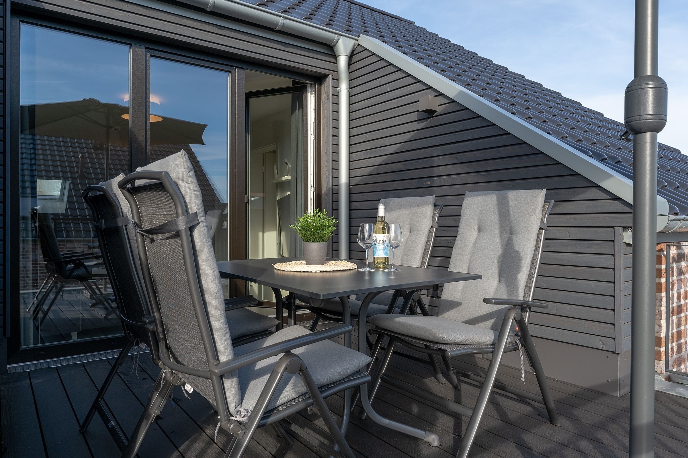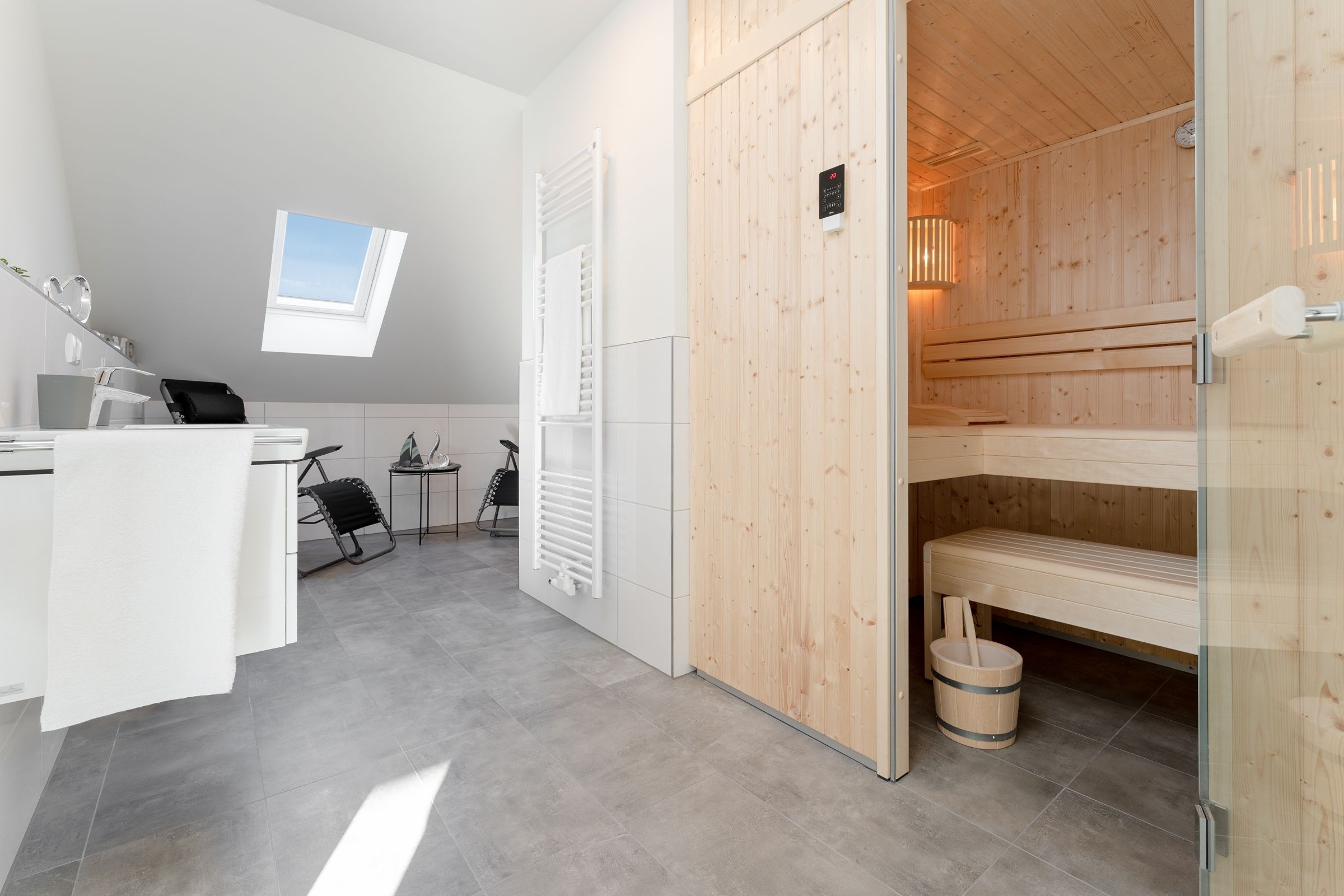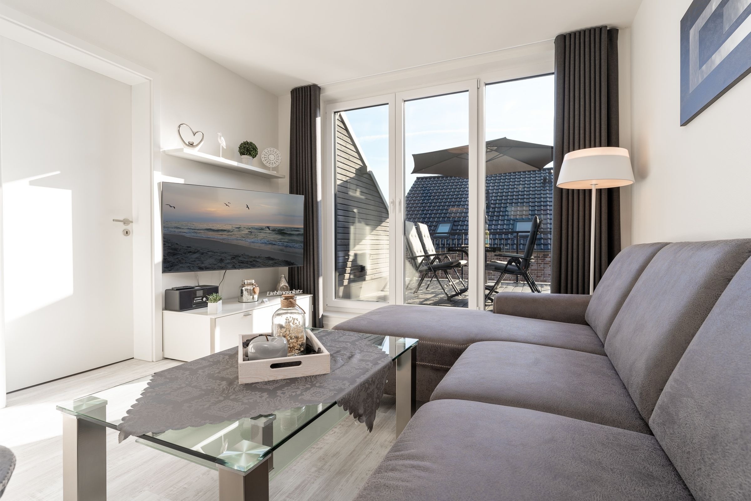 Das Herzstück dieser Wohnung bildet das Wohnzimmer mit Schlafsofa (130x200cm) und offener Küche, welche zum Verweilen und gemeinsamen Kochen einlädt. Von dort gelangen Sie auf den Balkon mit Südausrichtung, der mit Sonnenschirm und Balkonmöbeln ausgestattet ist. Für die Erholung im Urlaub gibt es ein separates Schlafzimmer, das sich mit Jalousien abdunkeln lässt, und mit eigenem TV und Boxspringbett (2x 90x200cm) überzeugt. Das Tageslichtbad verfügt über eine bodengleiche Dusche und Annehmlichkeiten wie einen Haartrockner und eine Handtuchheizung, damit es Ihnen an nichts fehlt, wenn Sie aus der eigenen Sauna kommen. Als weitere Besonderheit verfügt die gesamte Wohnung über eine angenehme Fußbodenheizung. Kostenfreies WLAN und ein Internetradio stehen hier zur Verfügung.