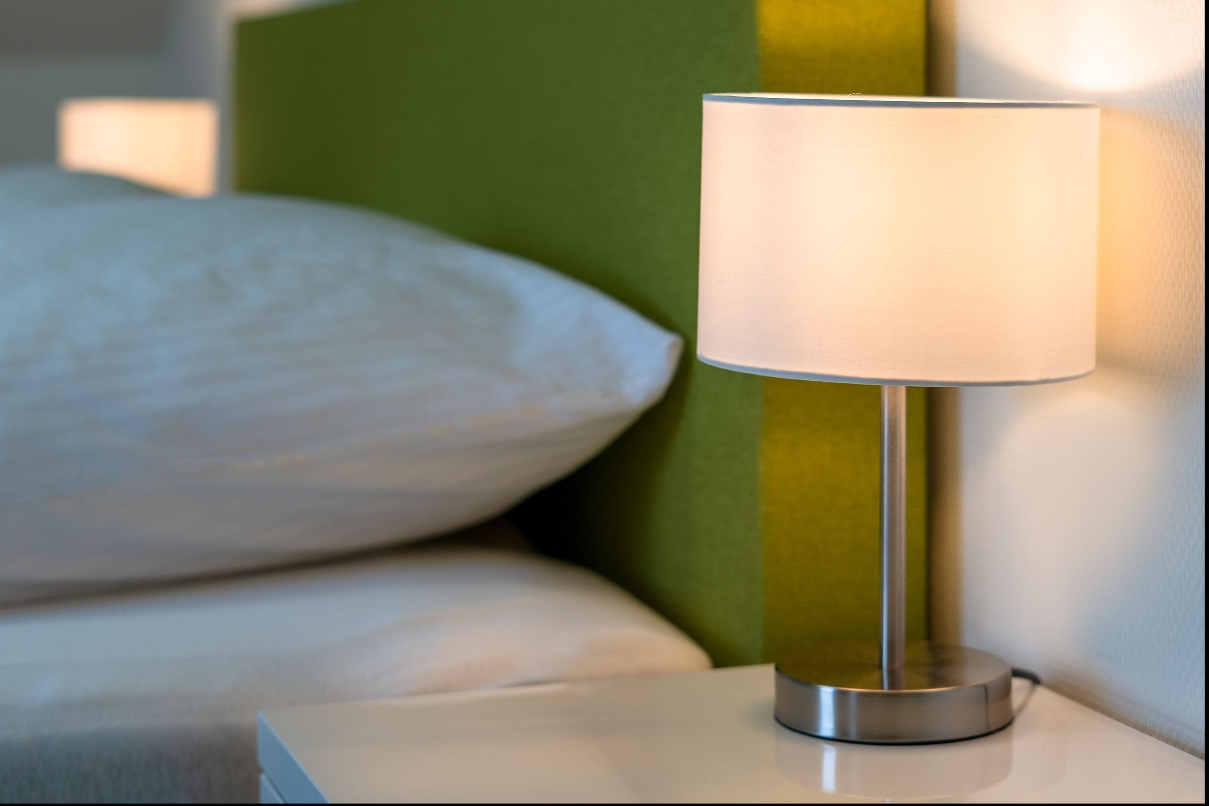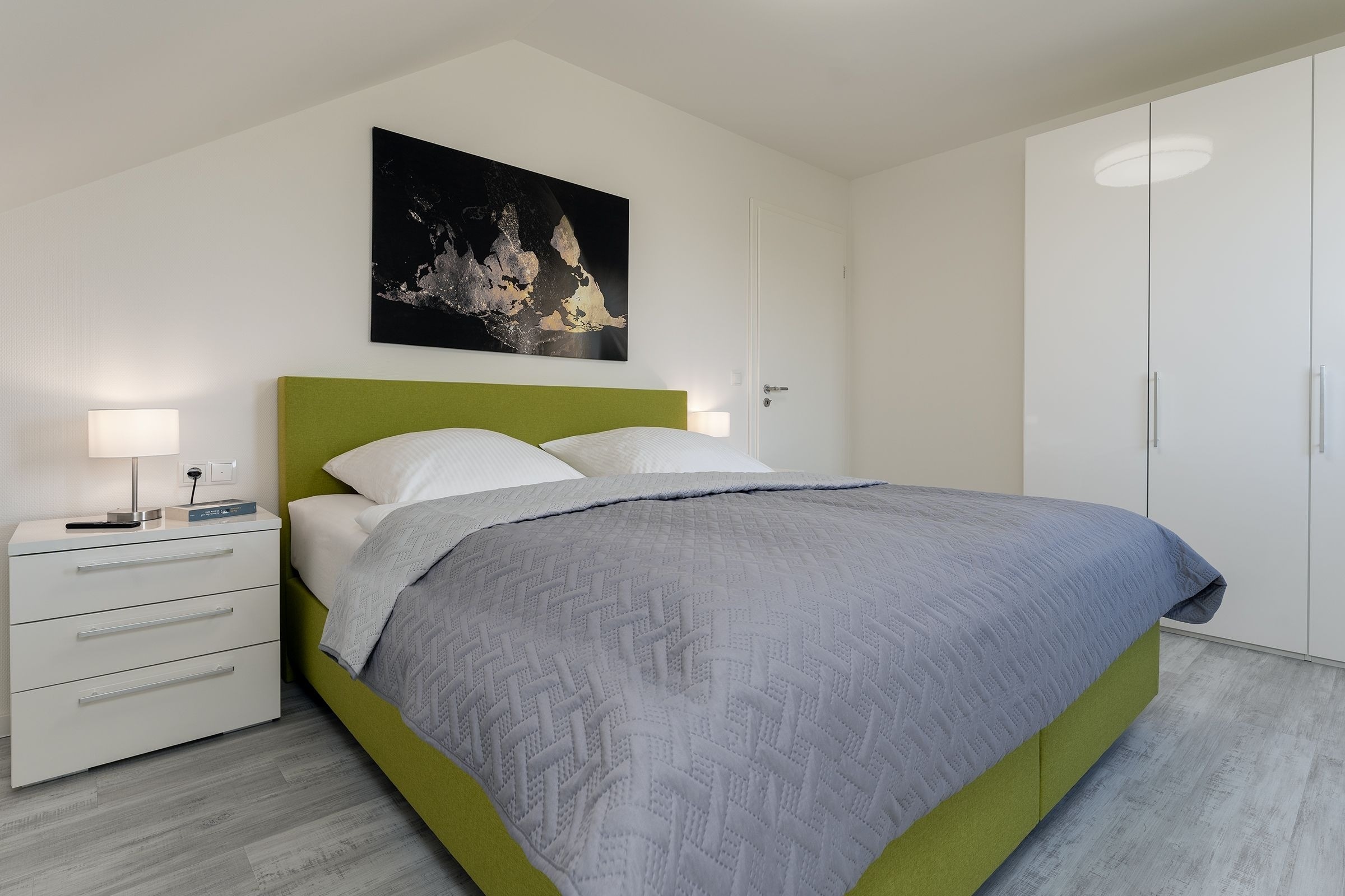 Schlafzimmer: Boxspringbett (2x 90x200 cm, durchgeh. Topper), Kleiderschrank, TV, Platz für Kinderreisebett vorhanden, Verdunkelung (Jalousie + Gardine)