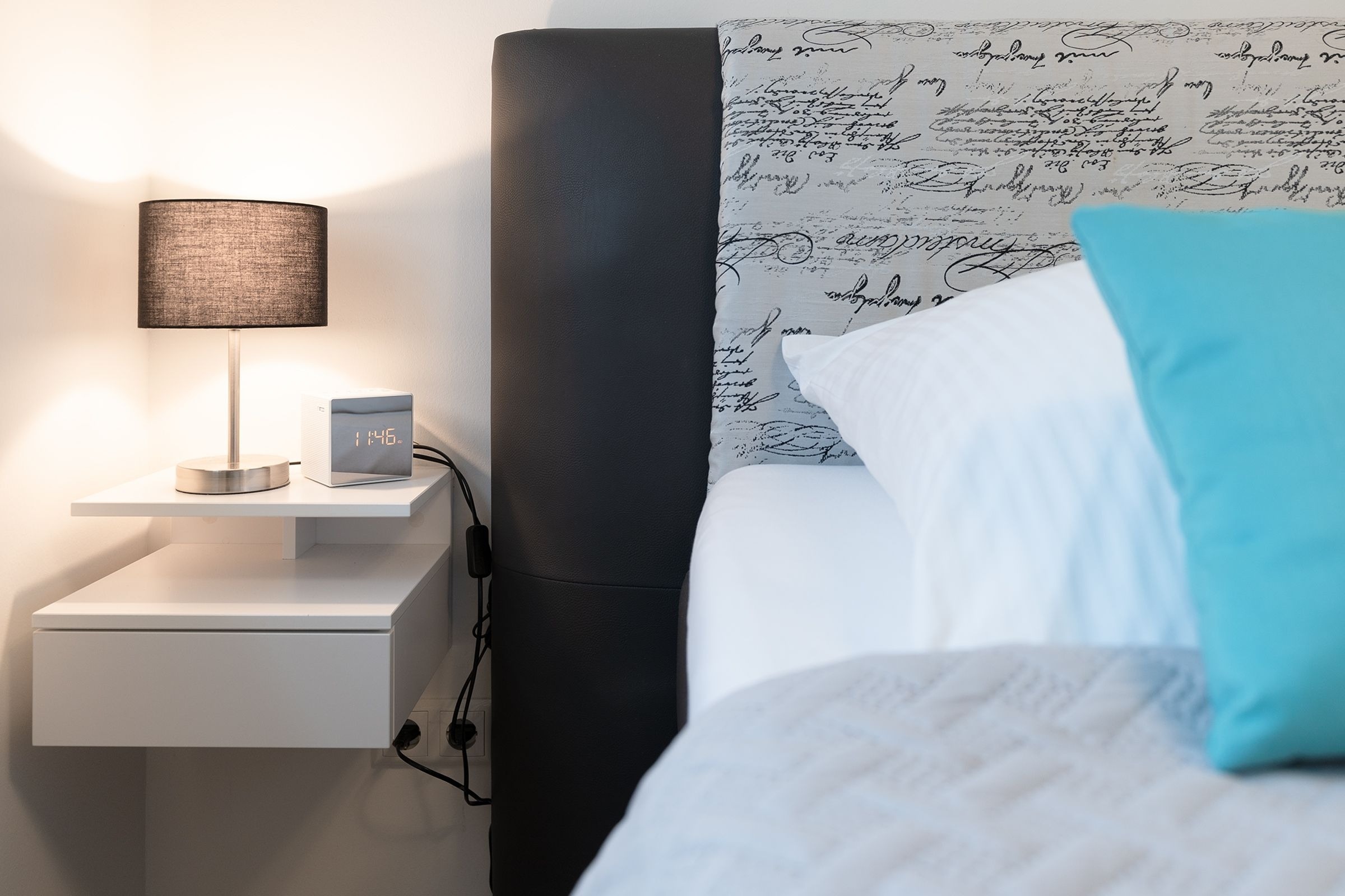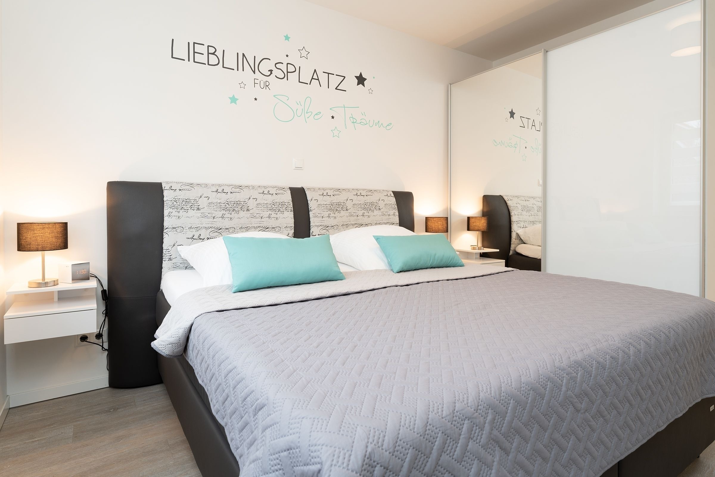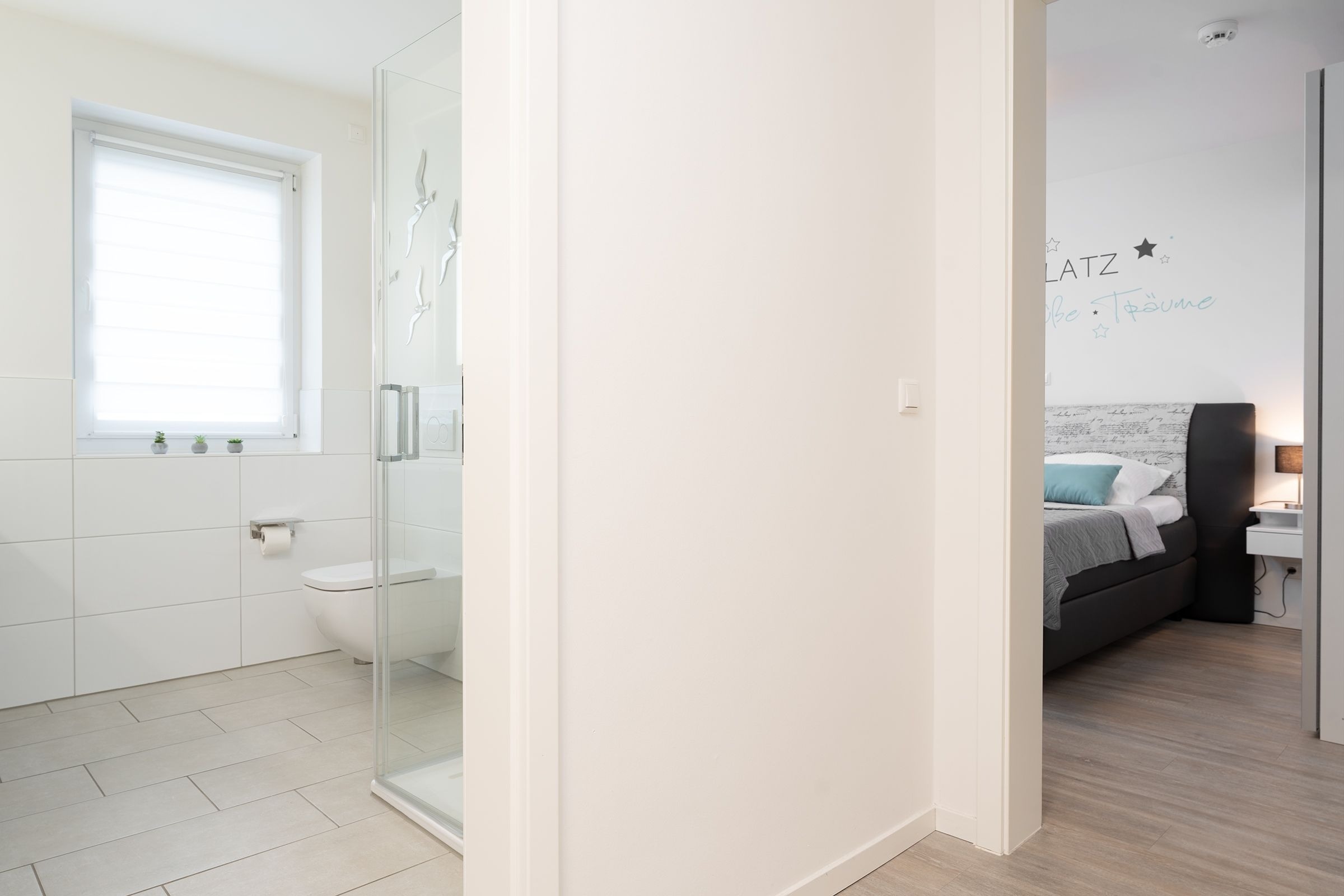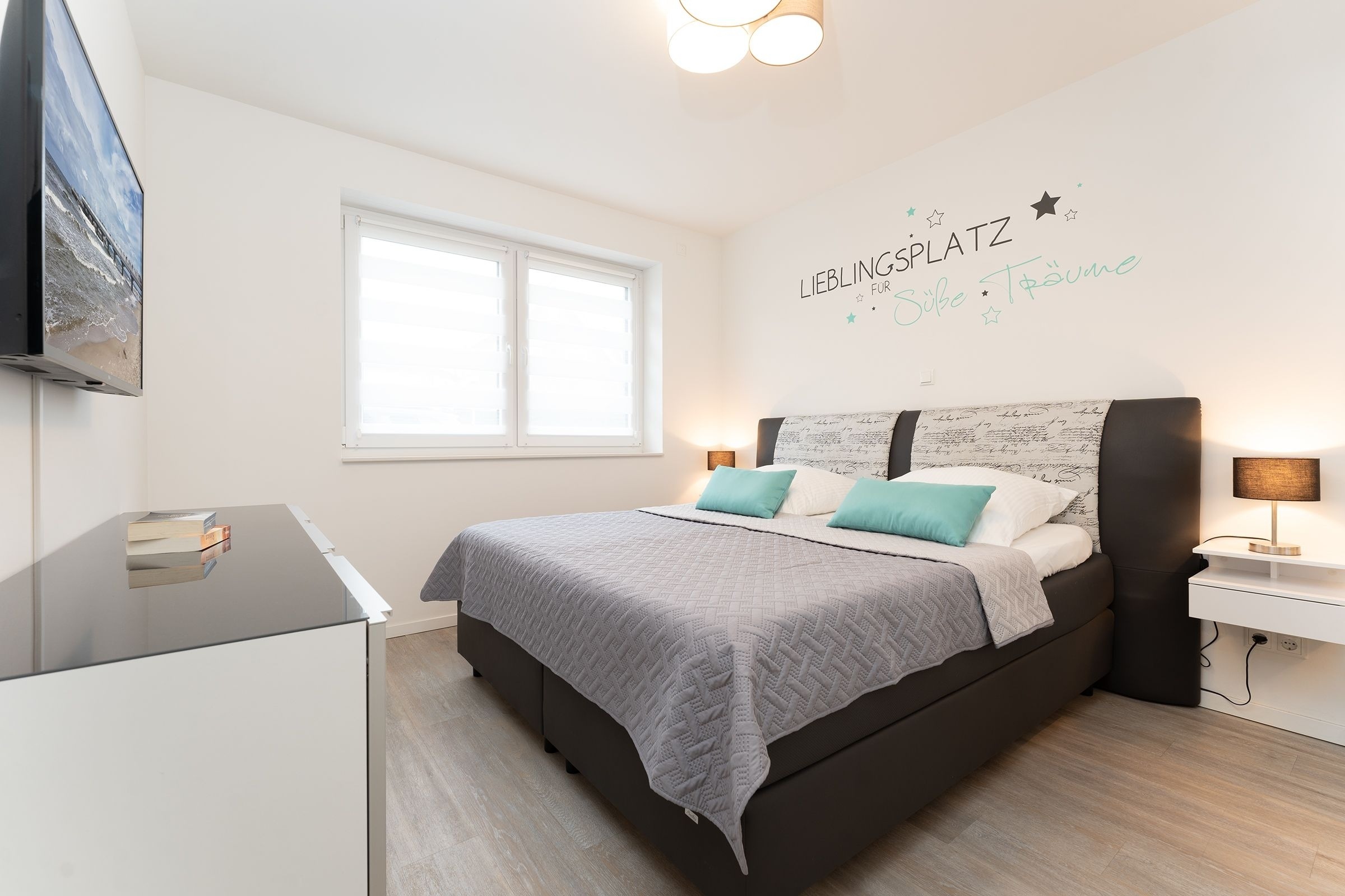 Schlafzimmer: Boxspringdoppelbett (180x200 cm), TV, Verdunkelung (elektr. Außenrollläden), Platz für Babybett vorhanden