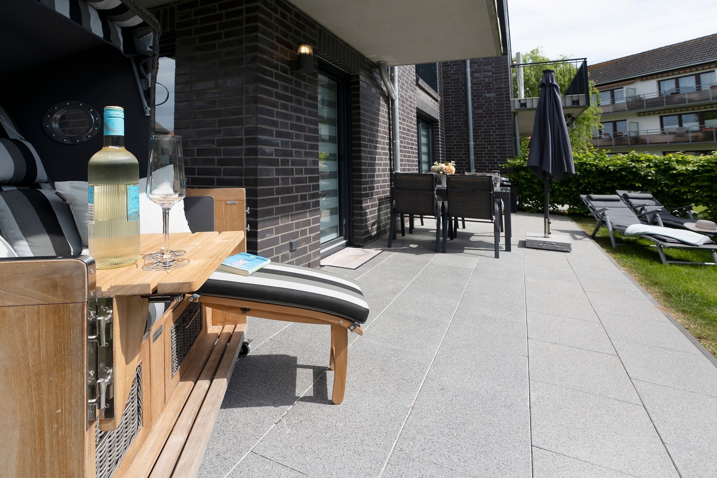 Der offene Wohn-, Ess- und Kochbereich bietet ausreichend Platz für die ganze Familie. Das Sofa lässt sich mit wenigen Handgriffen in eine komfortable Schlafstätte (180x200 cm) verwandeln. Von hier gelangen Sie auf die schöne Terrasse, die mit einem vorhandenen Holzkohle-Grill für Abwechslung auf dem Speiseplan sorgt. Im Strandkorb genießen Sie Ihre Urlaubslektüre. Abends können Sie sich nach einem langen Strandtag ins separate Schlafzimmer mit Boxspringbett (180x200 cm) und eigenem TV zurückziehen. Neben dem Tageslicht-Bad mit Walk-In-Dusche punktet diese Wohnung mit einem zusätzlichen Gäste-WC.