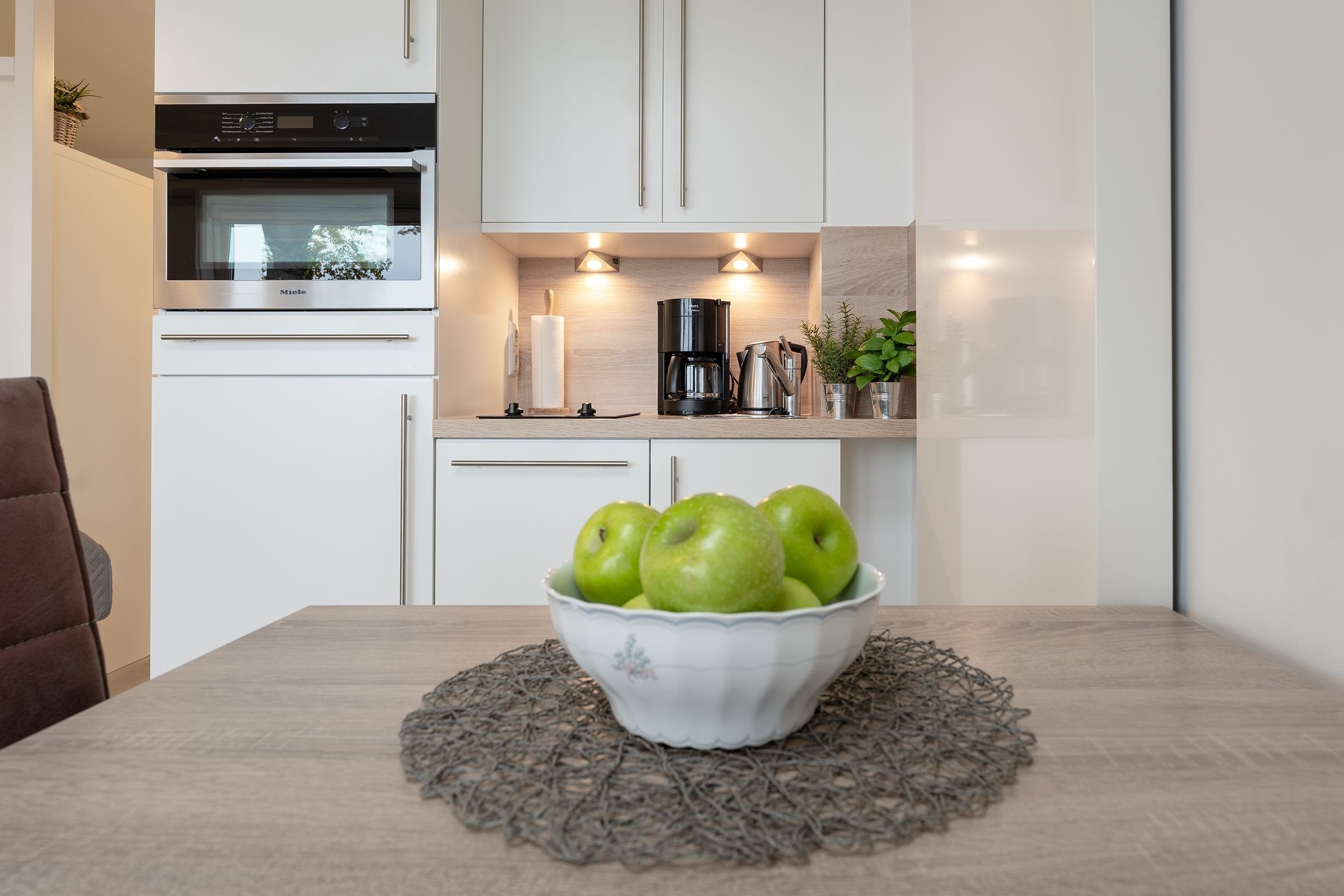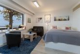 Der moderne Wohnbereich ist multifunktional mit einem großen Doppelbett (2x 90x200 cm) sowie einem Schrankbett (90x200 cm) ausgestattet. Die kleine Küchenzeile bietet viele Annehmlichkeiten, die zubereiteten Mahlzeiten können am angrenzenden Essplatz gemeinsam eingenommen werden. Von hier gelangen Sie auch auf den überdachten, möblierten Balkon, auf dem Sie zahlreiche Sonnenstunden an der frischen Luft verbringen und den direkten Meerblick genießen können. Ein Flachbild-Fernseher und der vorhandene WLAN-Anschluss komplettieren das Angebot.
