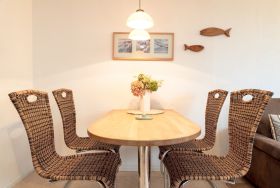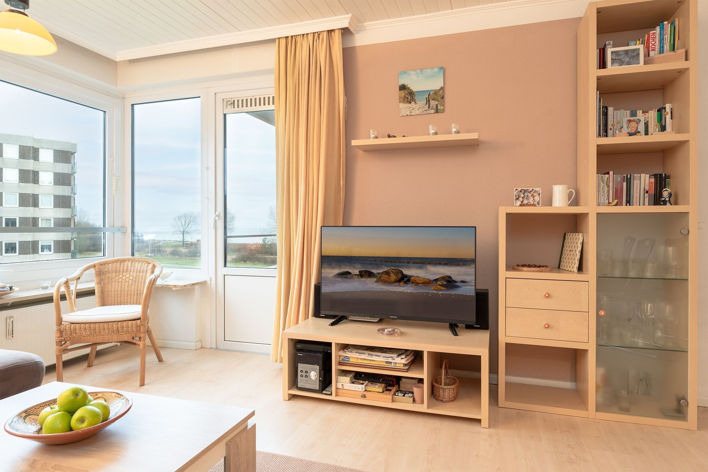 Es erwartet Sie ein gemütlicher Wohnbereich mit einer funktionellen Schlafcouch, die bei Bedarf in einen weiteren Schlafplatz (140x200 cm) verwandelt werden kann. Ein Esstisch mit 4 Stühlen bietet ausreichend Platz für Spiele-Abende oder um die Mahlzeiten gemeinsam nach der Zubereitung in der angrenzenden Küche einzunehmen. Nehmen Sie Platz auf dem möblierten, überdachten Balkon und genießen Sie die frische Ostseeluft sowie die Aussicht in Richtung Meer.