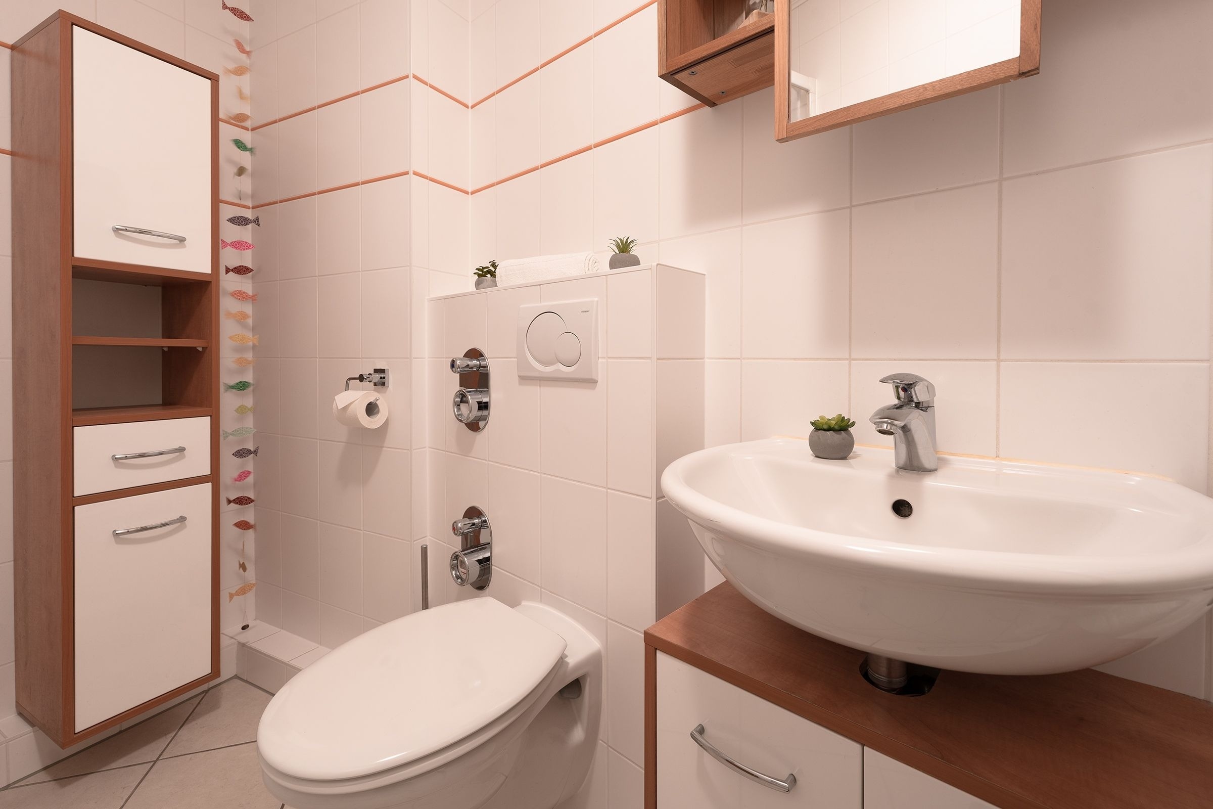 Geruhsame Nächte werden Sie im separaten Schlafzimmer mit Doppelbett (2x 90x200cm) verbringen und starten ausgeruht mit einer erfrischenden Dusche im hell gefliesten Badezimmer in Ihren neuen Urlaubstag.