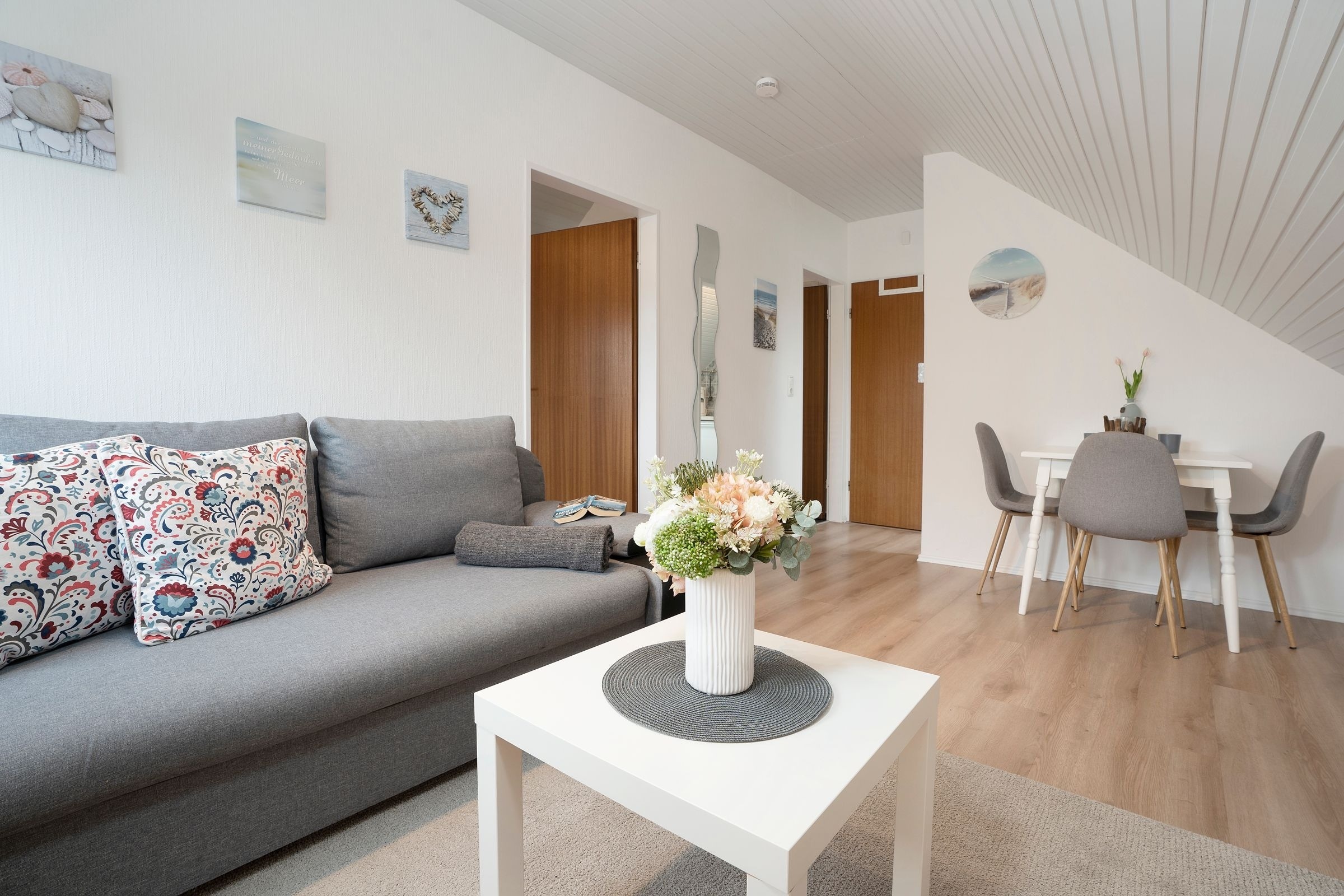 In dieser Unterkunft finden Sie alles, was Sie für einen erholsamen Ostsee-Urlaub benötigen: Der Wohnbereich ist mit einer gemütlichen Couch ausgestattet, die bei Bedarf in einen Schlafplatz (150x190 cm) verwandelt werden kann. Im separaten Schlafzimmer erwartet Sie ein komfortables Doppelbett (2x 90x200 cm) und ein Kleiderschrank zum Verstauen Ihrer Urlaubsgarderobe. Der Wohn- sowie auch der Schlafbereich lassen sich durch Vorhänge angenehm verdunkeln.