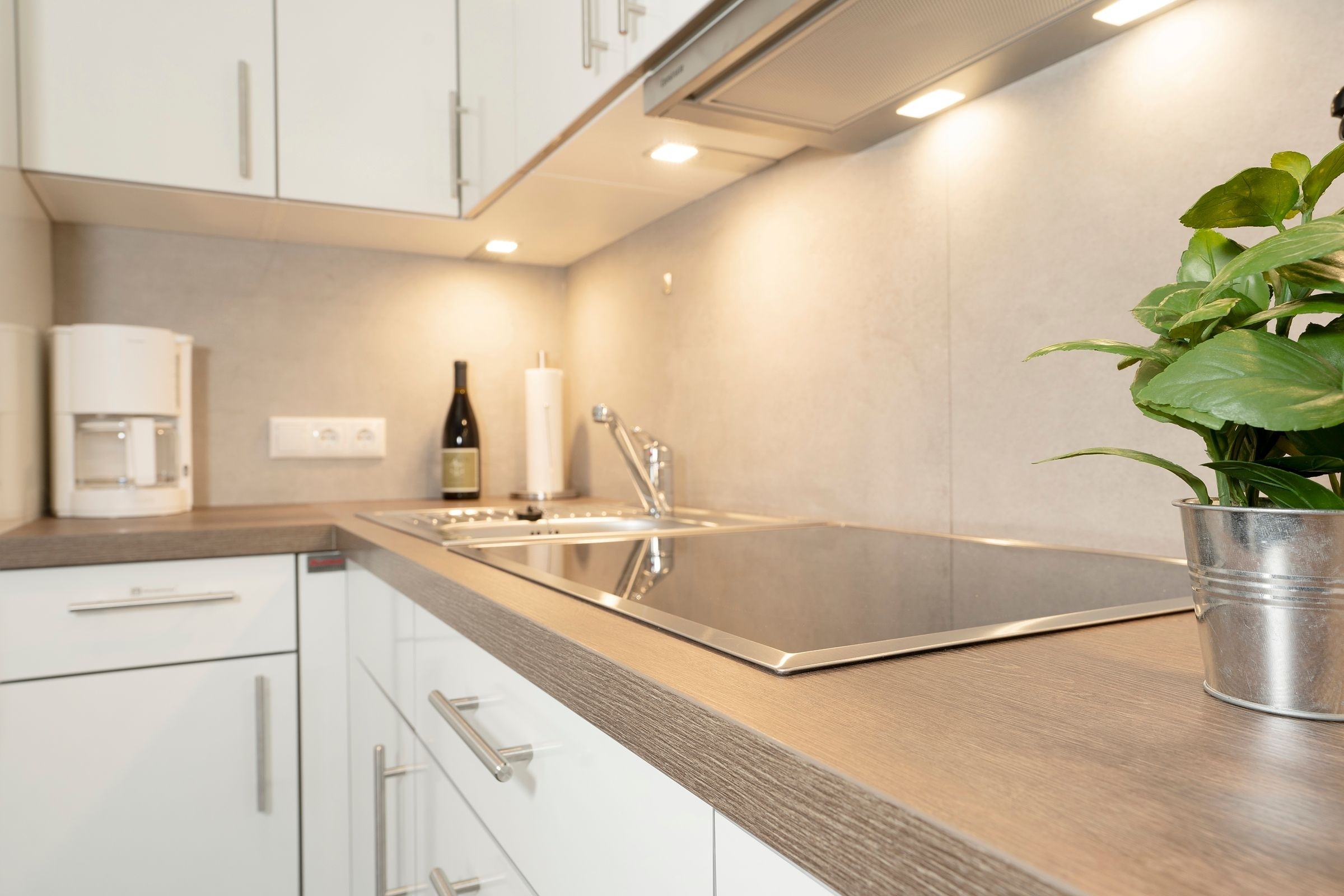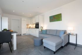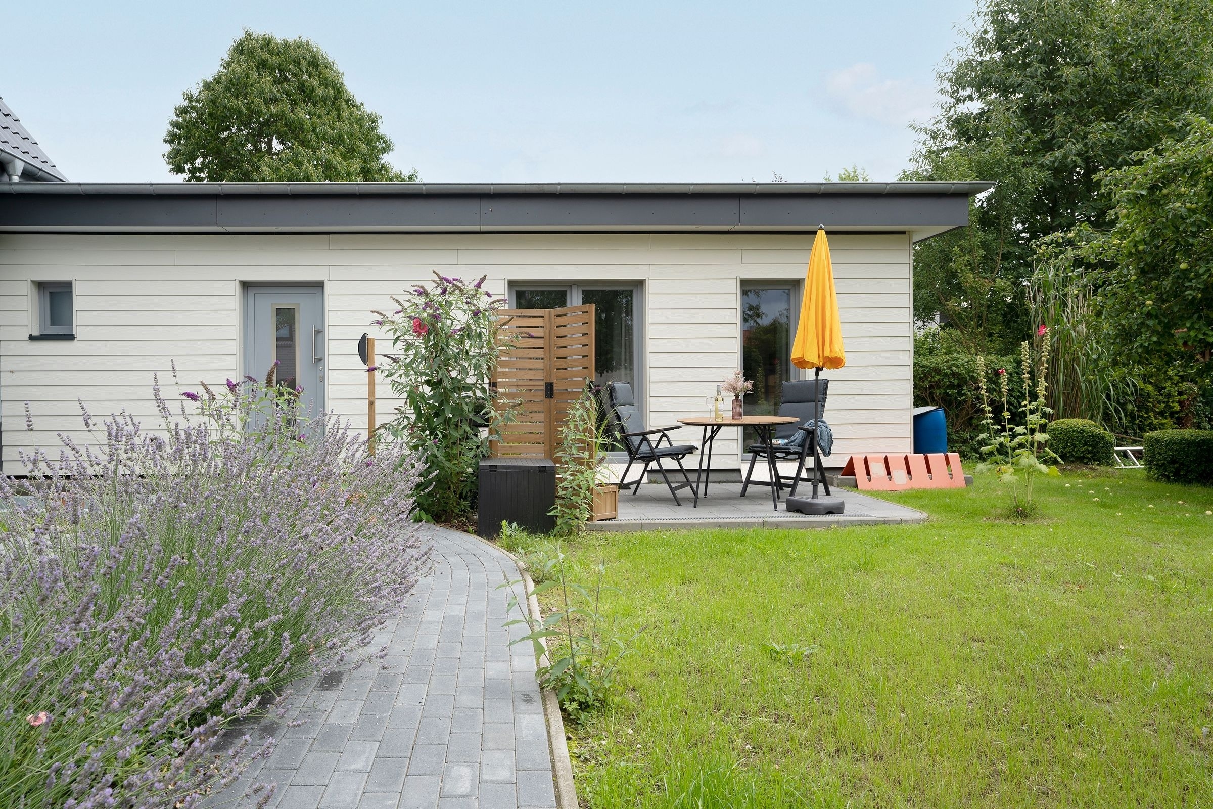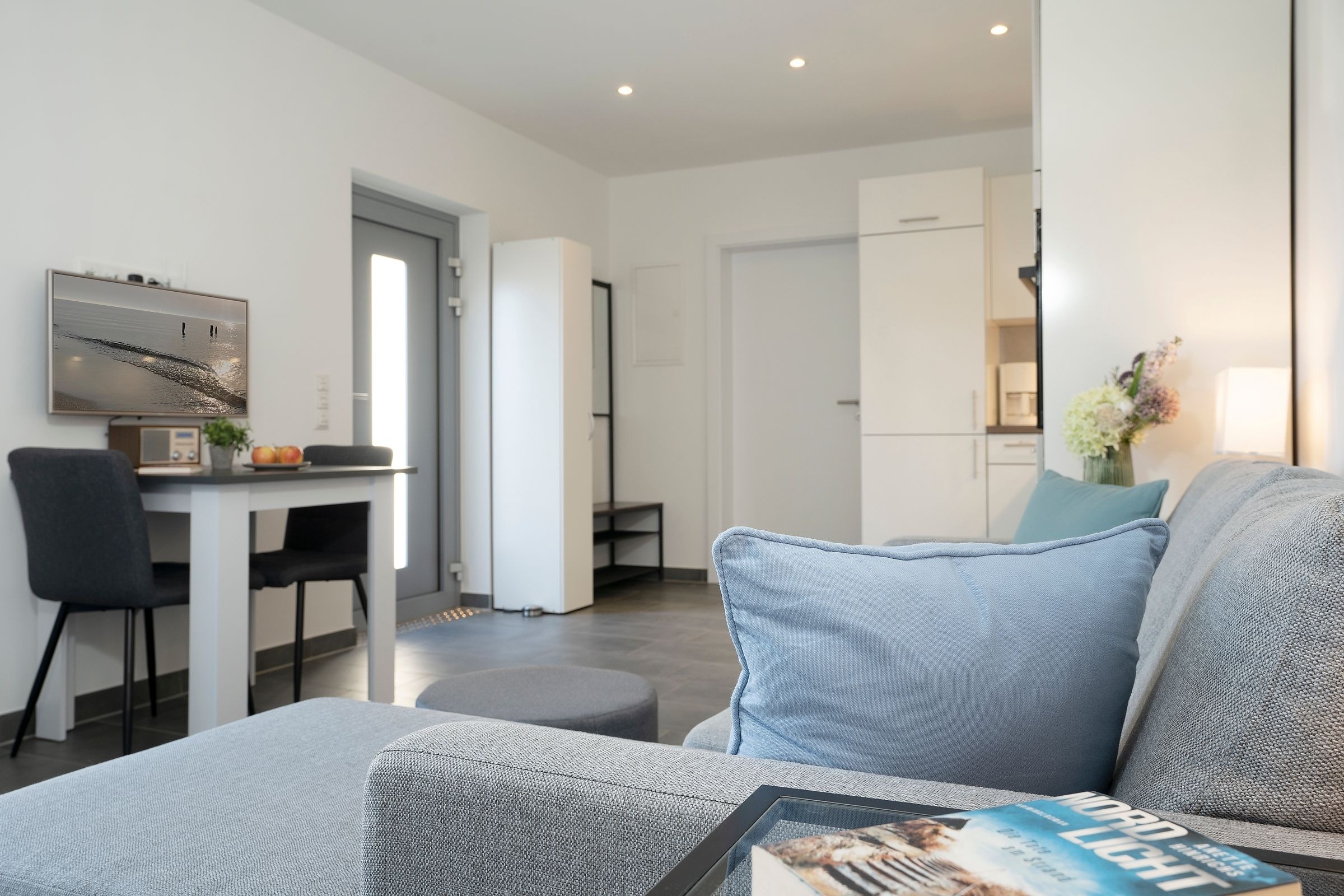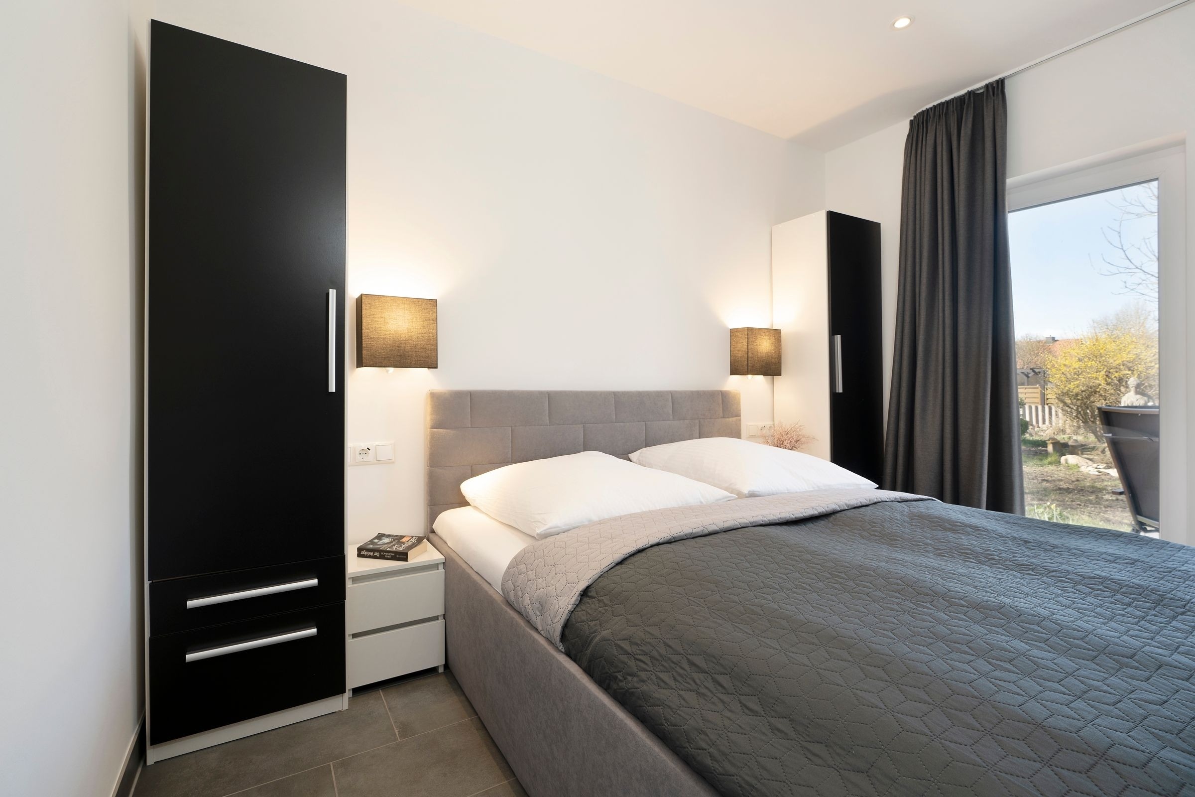 Der moderne offene Wohn-/Ess- und Kochbereich begrüßt Sie mit klarem Design und schlichter Eleganz. Kuscheln Sie sich zu Zweit nach einem langen Strandtag mit einem Glas Wein auf das Sofa oder lassen Sie den Tag auf der möblierten Terrasse mit Blick in den Garten ausklingen. Im Urlaub ist Schlemmen erlaub; zaubern Sie sich leckere Mahlzeiten - vielleicht sogar mit frischen regionalen Lebensmitteln. Durch den geräumigen Kleiderschrank ist der Schlafbereich mit komfortablem Doppelbett (2x 80x200cm) optisch vom Wohnbereich abgetrennt. Das hochwertige Badezimmer ist mit Walk-In-Dusche ausgestattet. Im ganzen Haus können Sie barfuß laufen, denn die Fußbodenheizung spendet wohlige Wärme.
