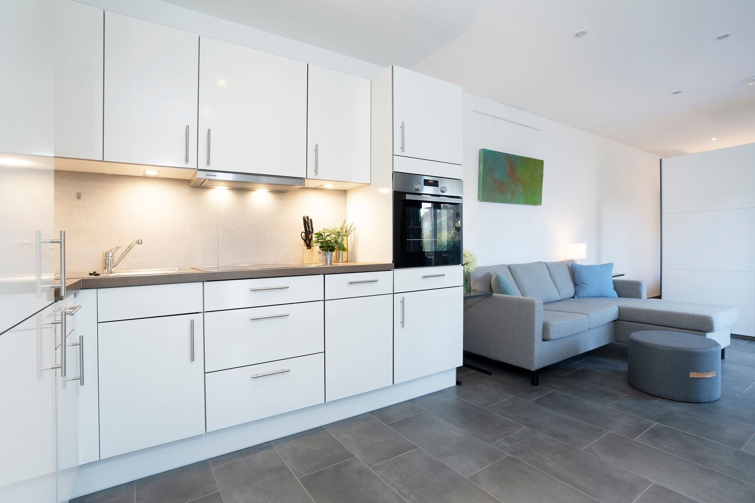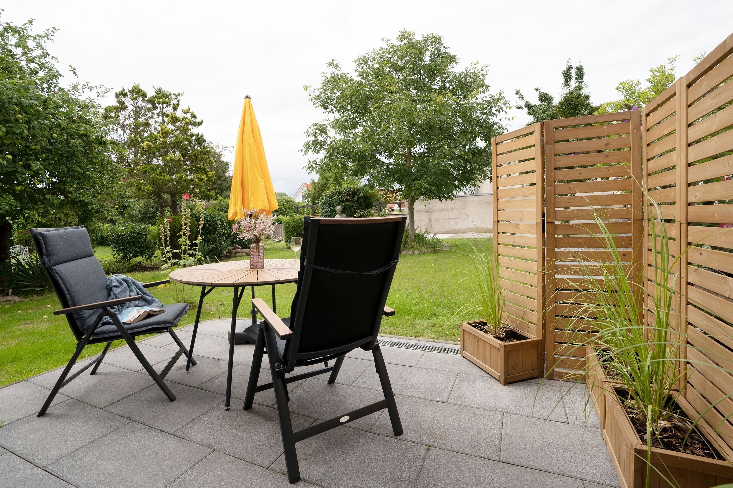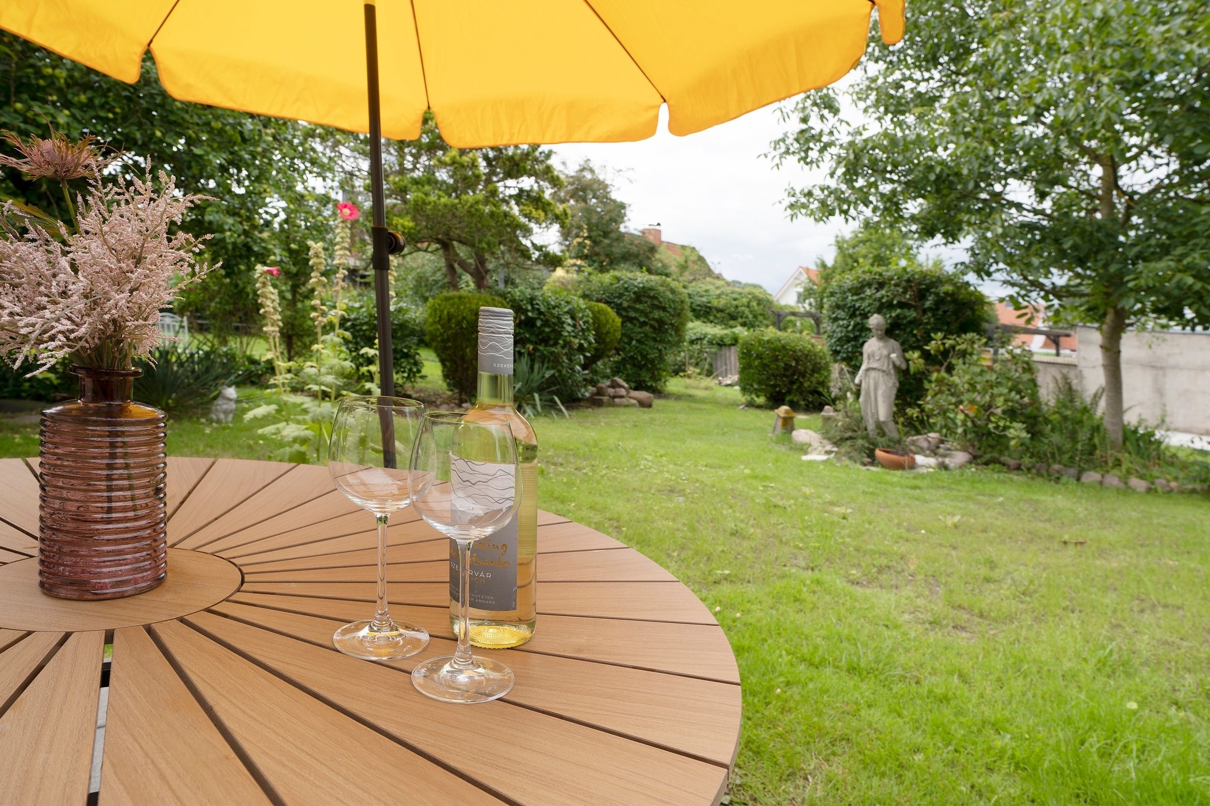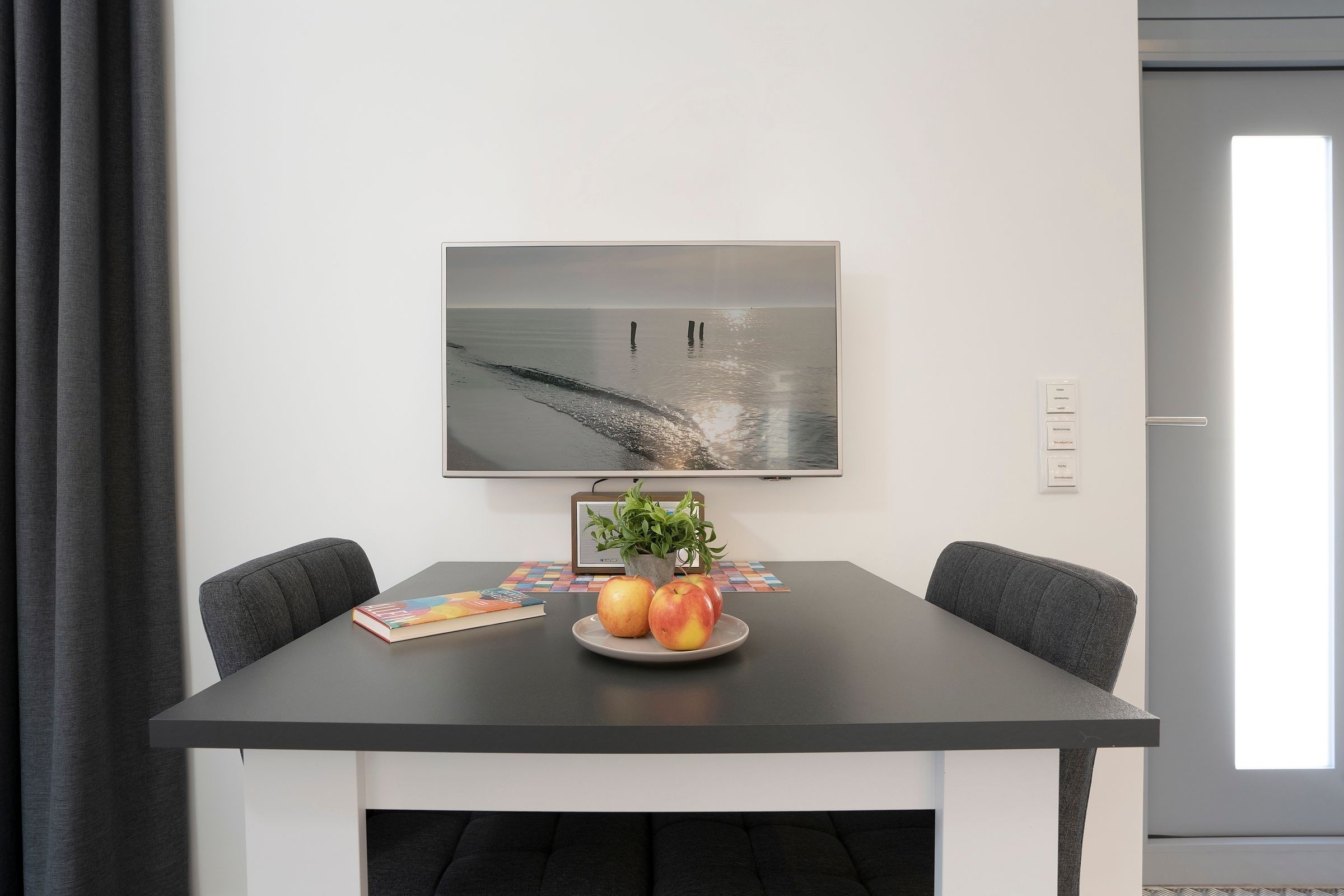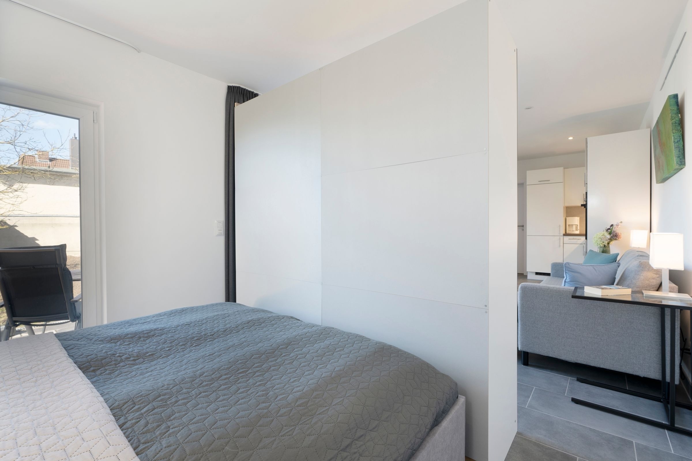 Der moderne offene Wohn-/Ess- und Kochbereich begrüßt Sie mit klarem Design und schlichter Eleganz. Kuscheln Sie sich zu Zweit nach einem langen Strandtag mit einem Glas Wein auf das Sofa oder lassen Sie den Tag auf der möblierten Terrasse mit Blick in den Garten ausklingen. Im Urlaub ist Schlemmen erlaub; zaubern Sie sich leckere Mahlzeiten - vielleicht sogar mit frischen regionalen Lebensmitteln. Durch den geräumigen Kleiderschrank ist der Schlafbereich mit komfortablem Doppelbett (2x 80x200cm) optisch vom Wohnbereich abgetrennt. Das hochwertige Badezimmer ist mit Walk-In-Dusche ausgestattet. Im ganzen Haus können Sie barfuß laufen, denn die Fußbodenheizung spendet wohlige Wärme.