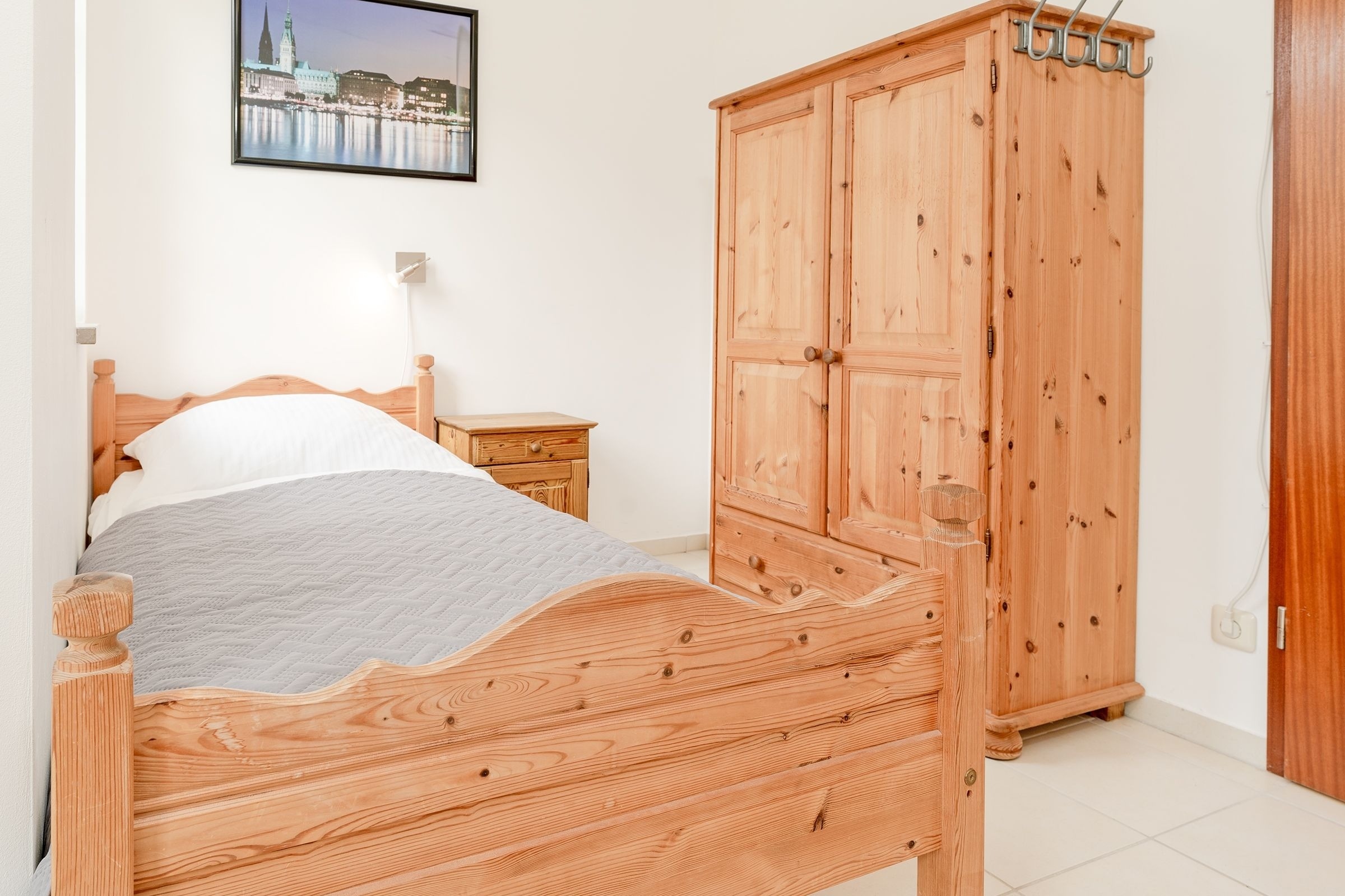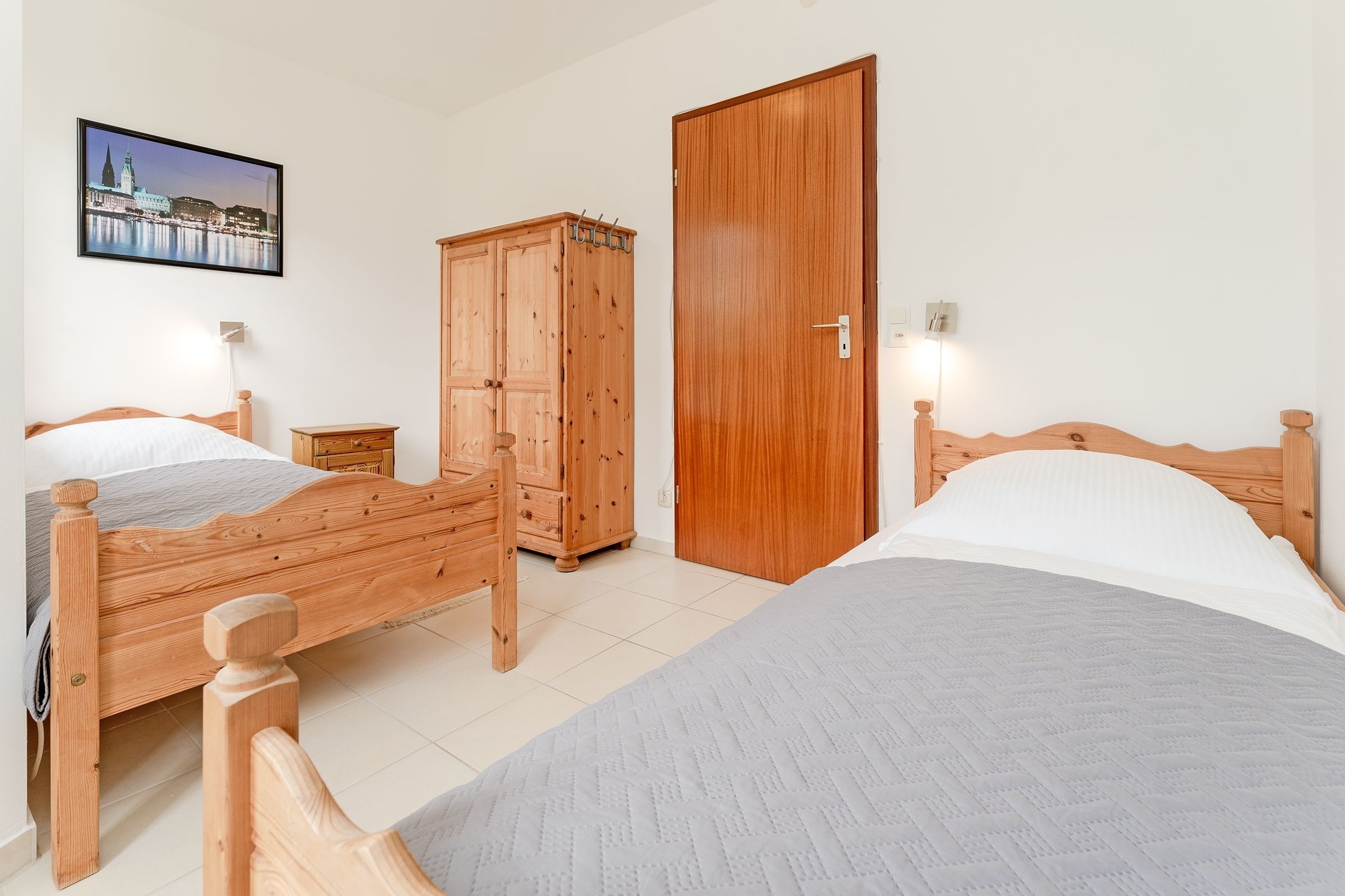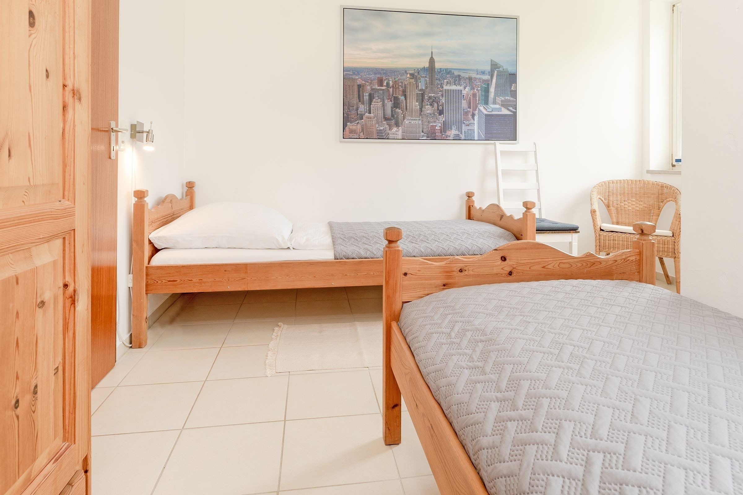 Schlafzimmer 2: 2 Einzelbetten (je 90x200 cm), Kleiderschrank, Verdunkelung (Plissees), Platz für Kinderreisebett vorhanden