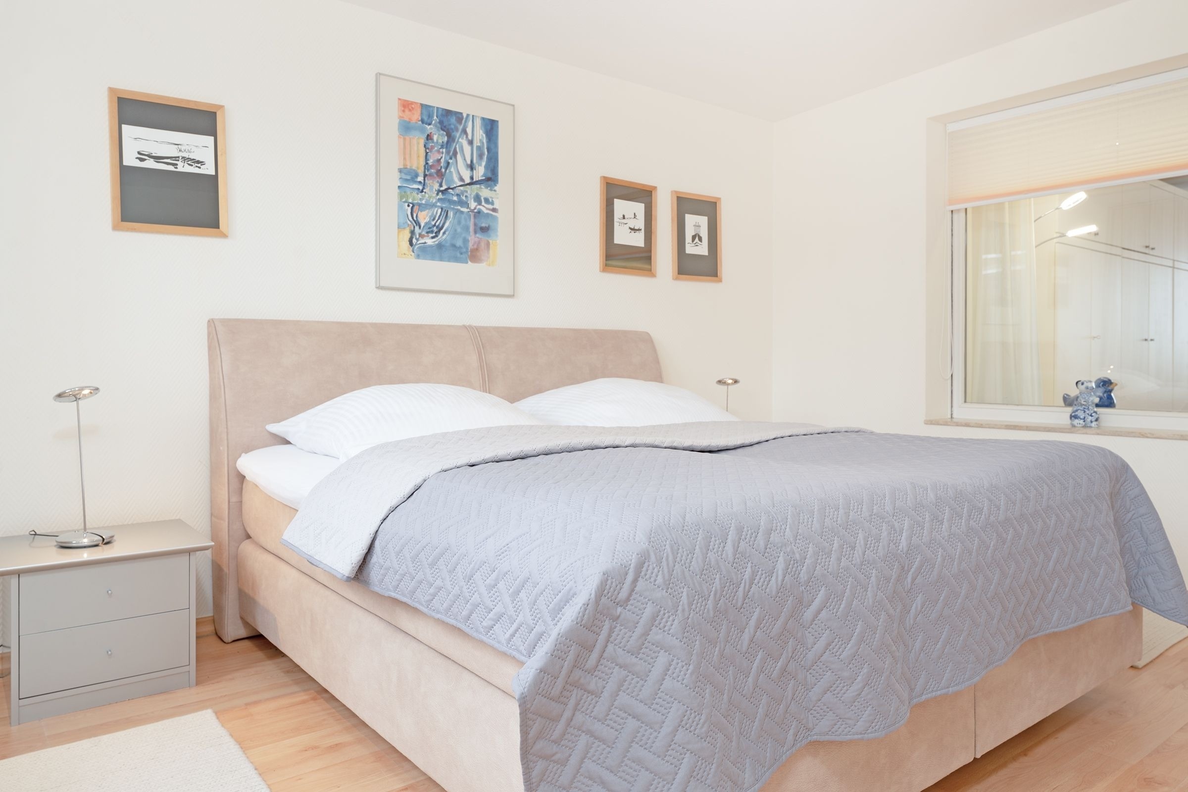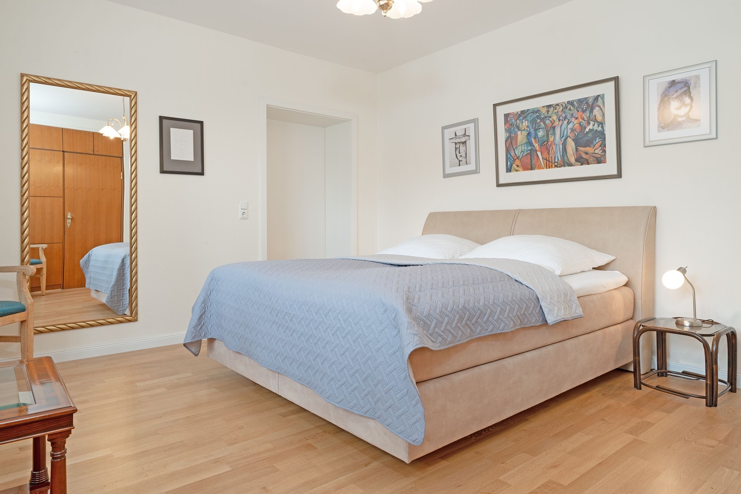 Schlafzimmer 1: 1 Boxspringbett (180x200 cm), Sichtschutz (Gardine), Kleiderschrank, Platz für Kinderreisebett vorhanden, Durchgangszimmer