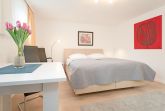 Wohn-/Schlafzimmer: 1 Doppelbett (180x200 cm), Verdunkelung (Gardine), Kleiderschrank im Flur, Smart-TV, Platz für Kinderreisebett vorhanden
