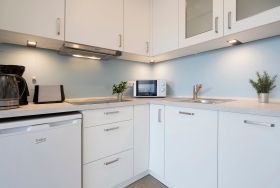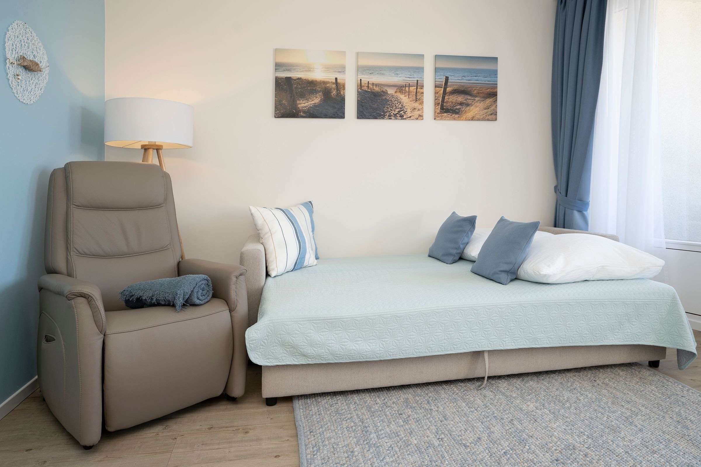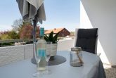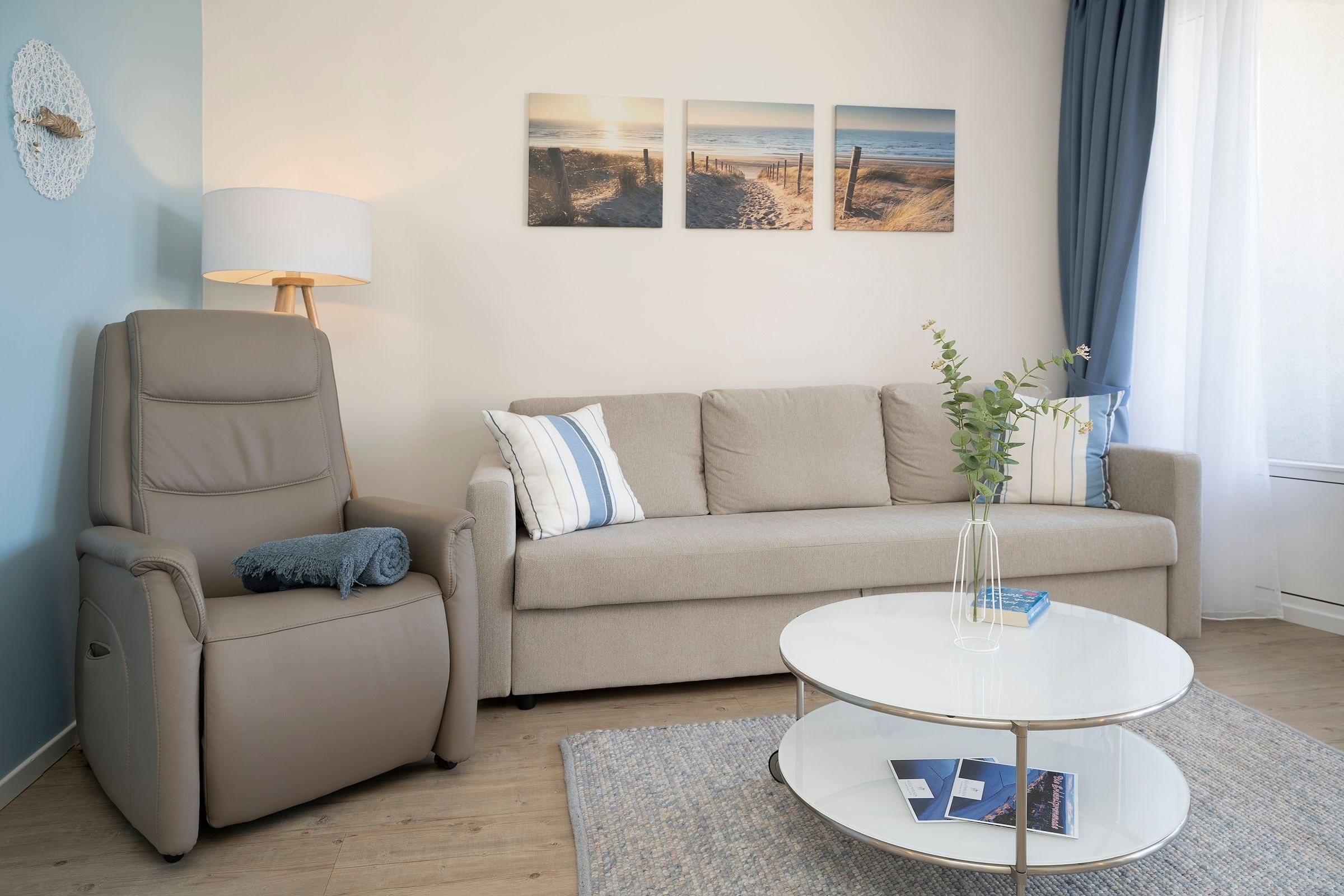 Der helle und gemütliche Wohnbereich empfängt Sie mit einem Schlafsofa (140x200 cm) mit Gelschaumtopper, einem komfortablen Leder-Sessel mit elektrischer Steuerung und Fußstütze sowie einem Flachbild-TV. Die offen gestaltete, moderne Küchenzeile bietet Stauraum für Ihre Einkäufe und viele Annehmlichkeiten wie Geschirrspülmaschine, Toaster, Eierkocher, Mikrowelle mit Grillfunktion, Kaffeemaschine mit Thermoskanne etc. Der Essplatz lädt zum gemeinsamen Essen und zu Spieleabenden ein. Dafür lässt sich der Tisch extra ausziehen und Ihren Bedürfnissen anpassen. Bücher und Brettspiele befindet sich in der Wohnung. Zahlreiche Stunden an der frischen Ostseeluft können Sie auf dem überdachten, möblierten Süd-Balkon in Ruhe genießen. Eine Solarlichterkette zaubert hier zur Dämmerung ein stimmungsvolles Licht. So kann man den Abend prima ausklingen lassen ...