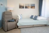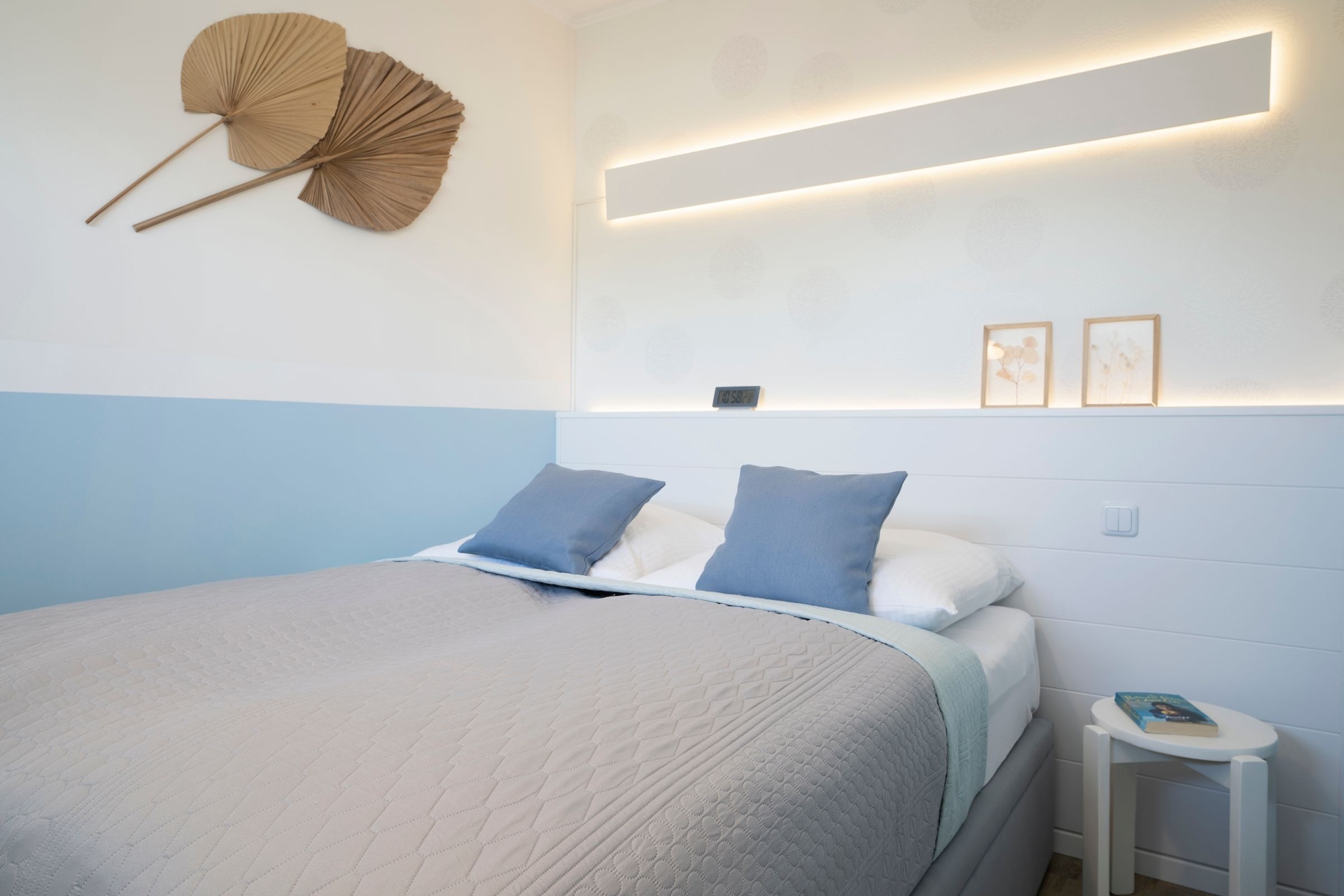 Im separaten Schlafzimmer mit indirekter Beleuchtung befindet sich 1 Boxspringbett (160x200 cm) mit Gelschaumtopper für einen besonders erholsamen Schlaf. In dem geräumigen Kleiderschrank mit offener Kleiderstange können Sie Ihre Urlaubsgarderobe optimal unterbringen. Ein Kofferständer erleichtert das Auspacken und die Koffer können anschließend im Bettkasten verstaut werden. Der neue Urlaubsmorgen beginnt erfrischend im tageslichthellen Duschbad, das zudem mit einem Haartrockner und einer Infrarot-Handtuchheizung ausgestattet ist. Wohn- & Schlafbereiche können zur Nacht angenehm abgedunkelt werden. In der kalten Jahreszeit sorgt eine Fußbodenheizung für wohlige Wärme.
