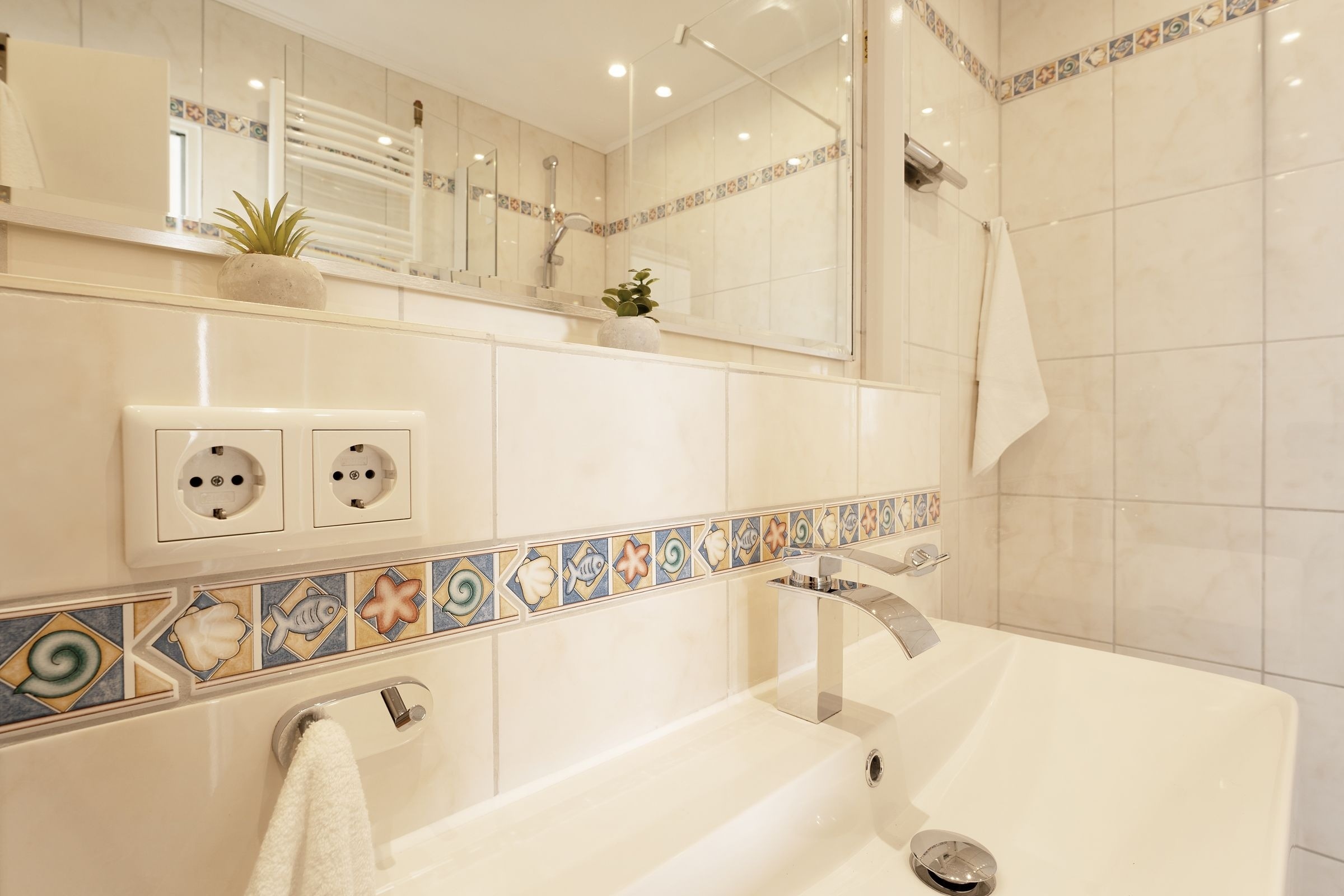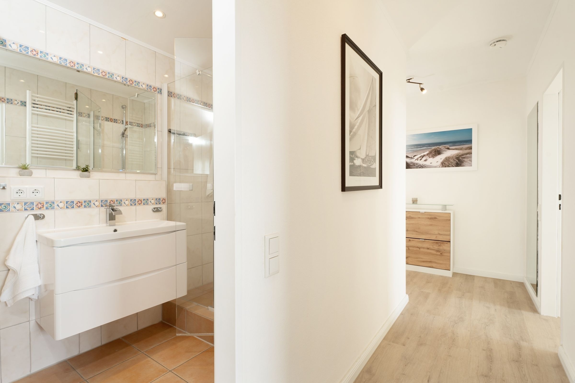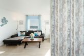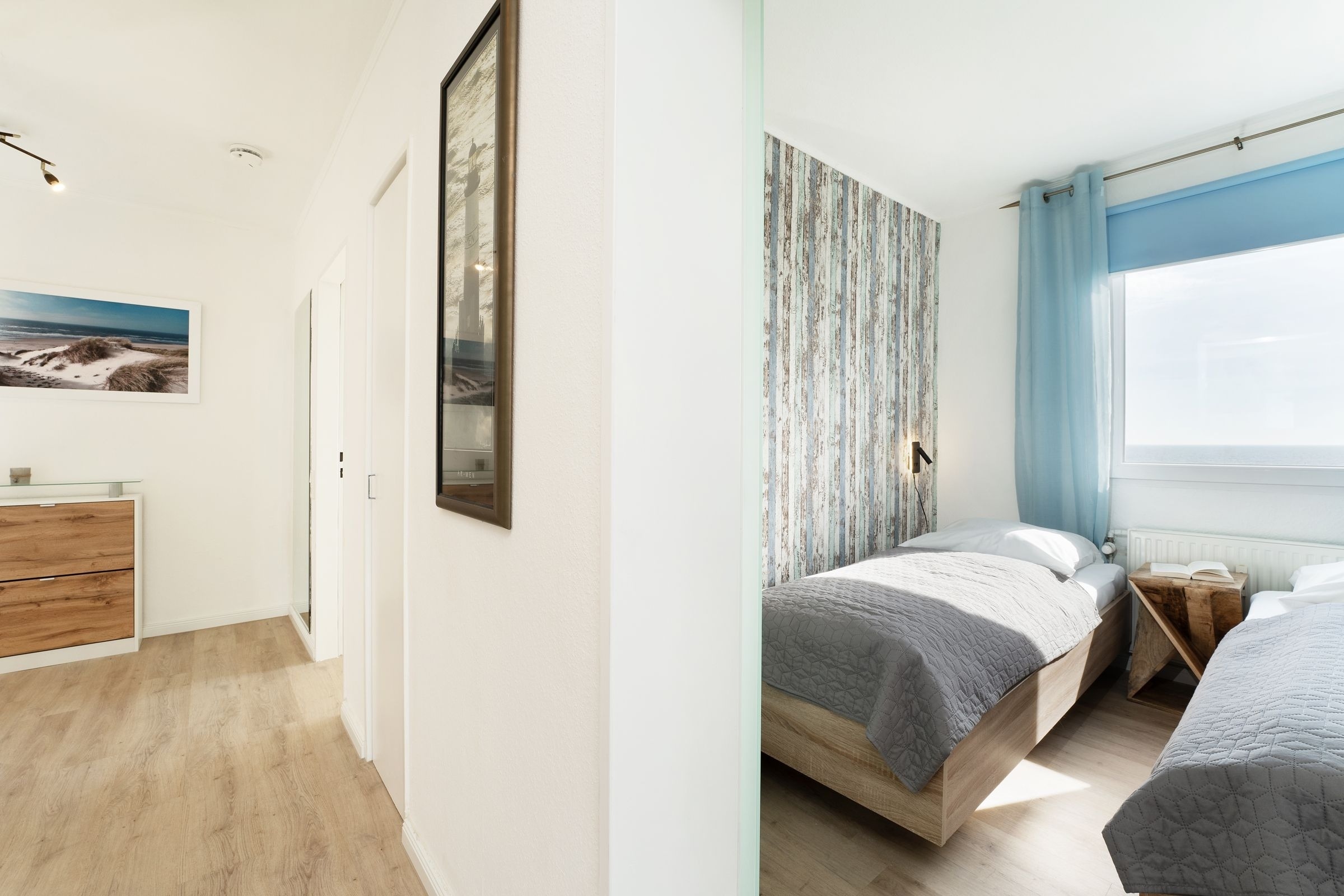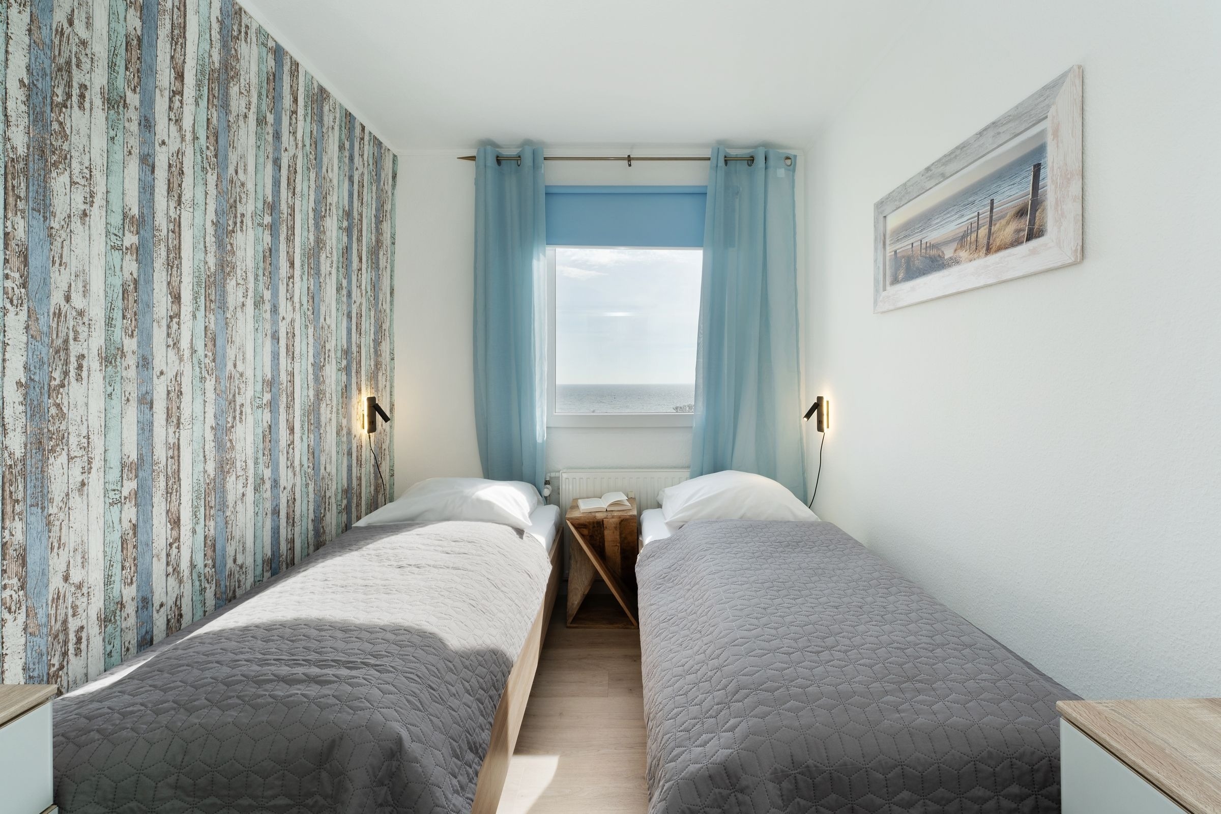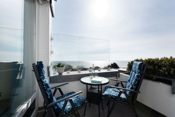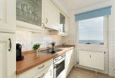 Ostsee pur. Das lichtdurchflutete Feriendomizil verwöhnt Sie mit einem herrlichen Meerblick aus allen Zimmern. Kommen Sie an, machen Sie es sich auf dem Sofa bequem und lassen Sie den Blick über die tiefblaue Ostsee schweifen. Ihre Speisen können Sie im angrenzenden Essbereich einnehmen, die separate Küche im Landhausstil ist sehr gut ausgestattet. Nach dem Essen lässt sich der Weitblick auf die Lübecker Bucht ideal auf dem großzügigen Ost-West-Balkon genießen. Das Schlafzimmer verfügt über 2 Einzelbetten (je 90x200 cm), zudem bietet das Schlafsofa im Wohnzimmer eine weitere Schlafmöglichkeit (ca. 134x197 cm). Das Duschbad mit Handtuchwärmer ist hell gefliest.