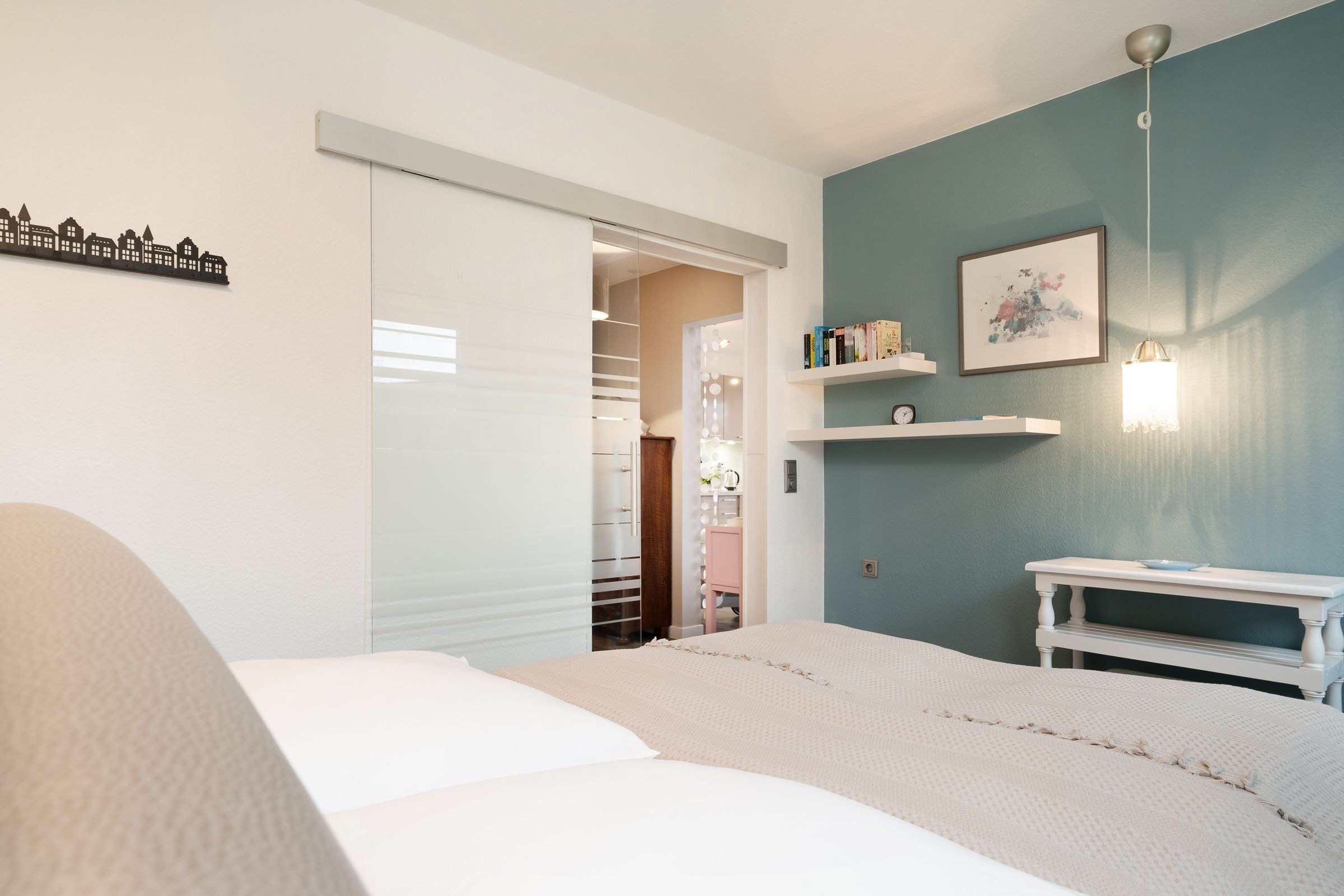 Schlafzimmer: Doppelbett (2x 80x200cm), Kleiderschrank, Verdunkelung (Plissees), kein Platz für ein Kinderreisebett vorhanden