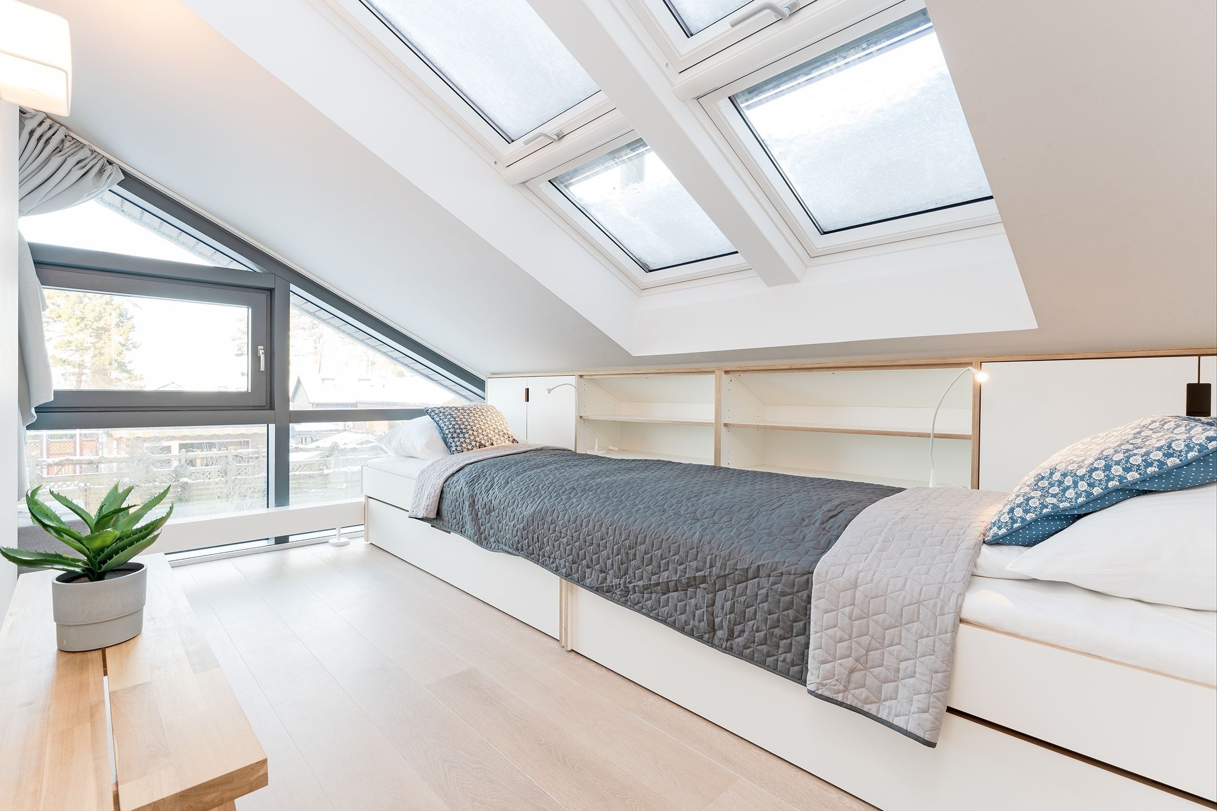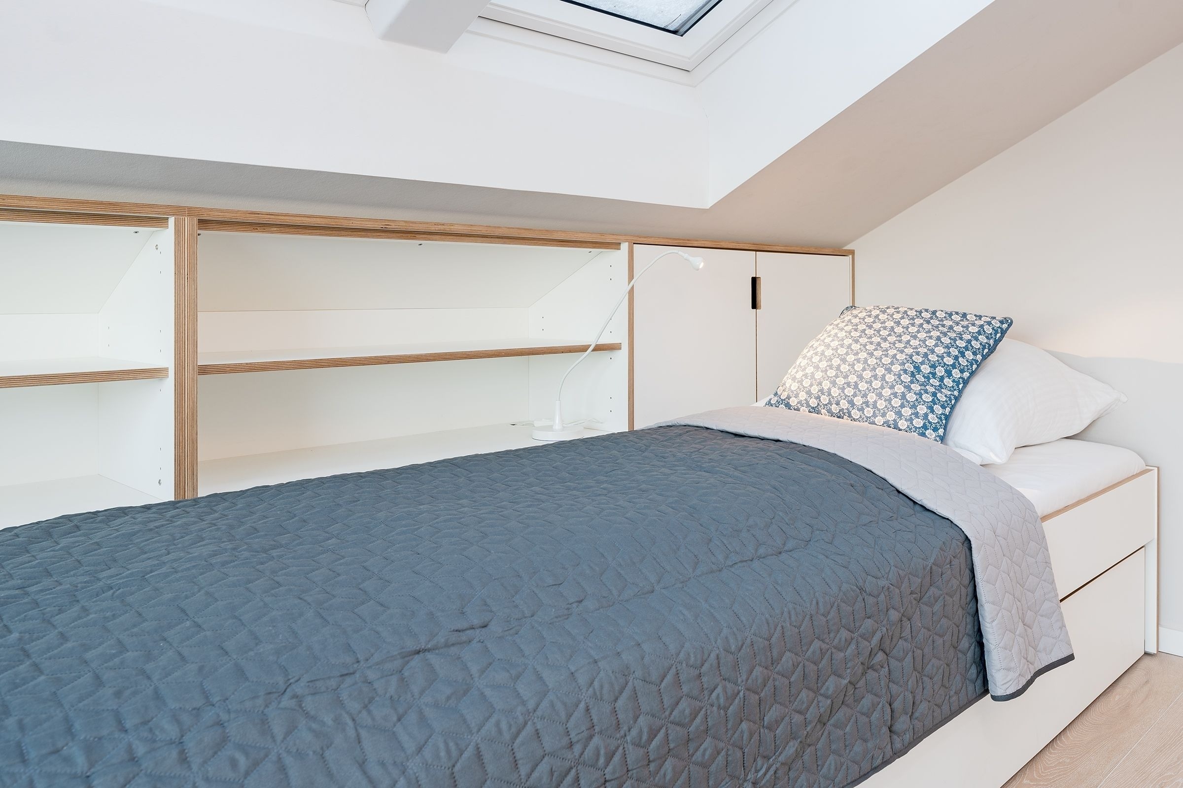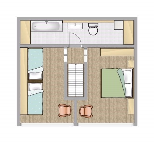 Schlafzimmer 2 (OG): 2 Einzelbetten (je 90x190cm), Kleiderschrank, Verdunkelung Dachfenster: elektr. Rolläden, Verdunkelung Fenster: Vorhänge
