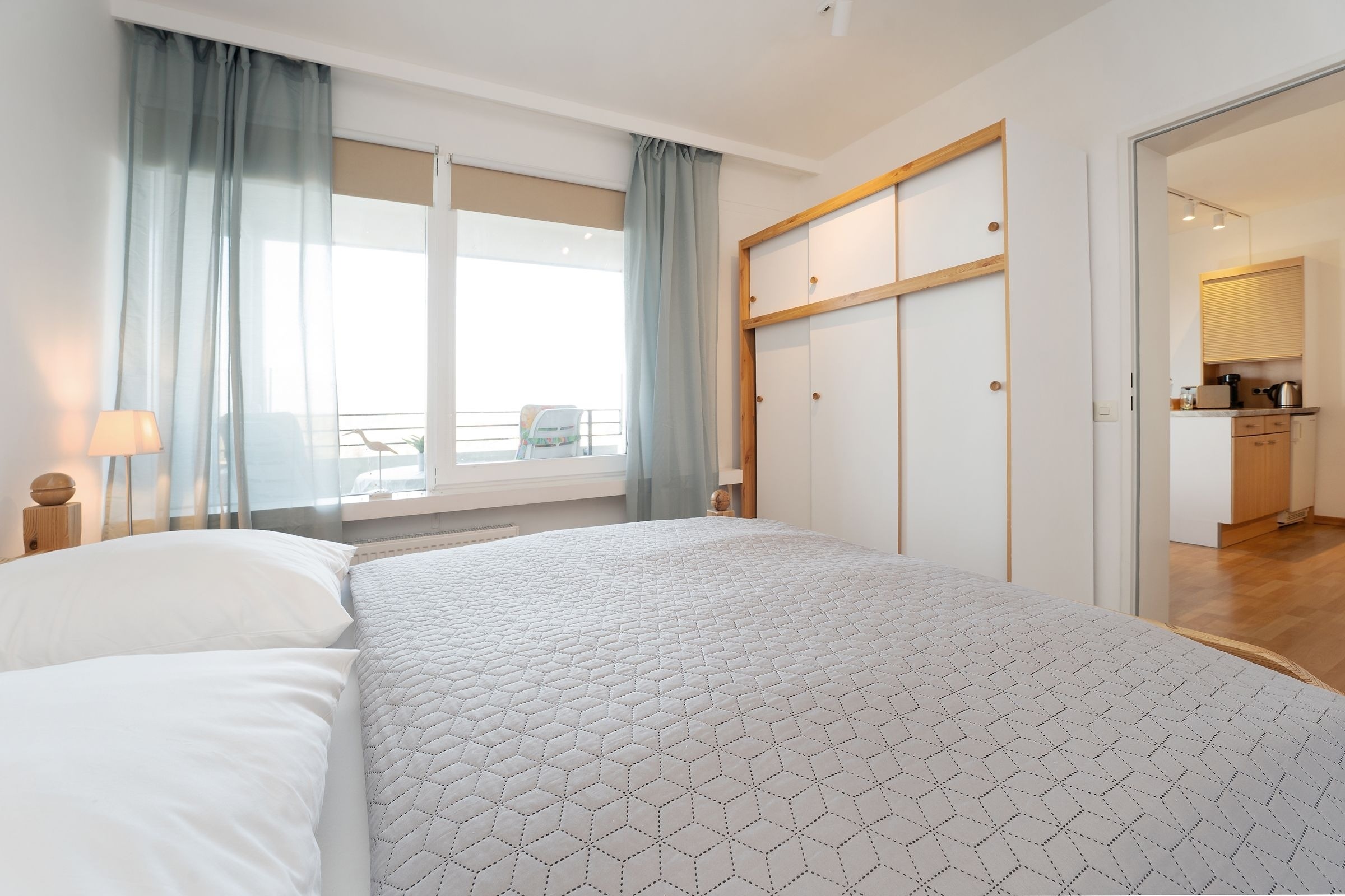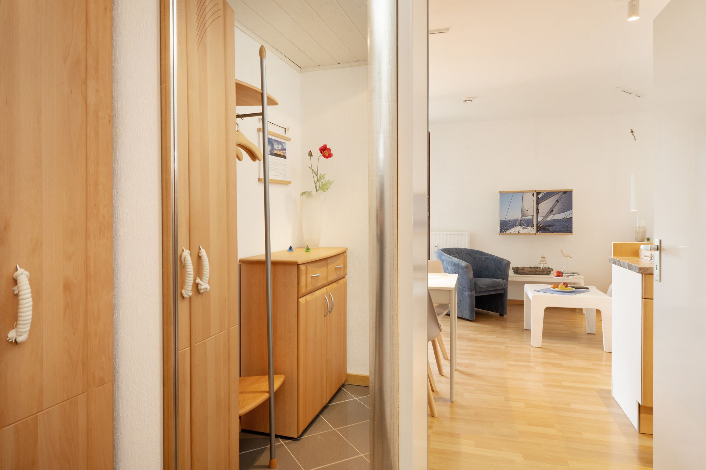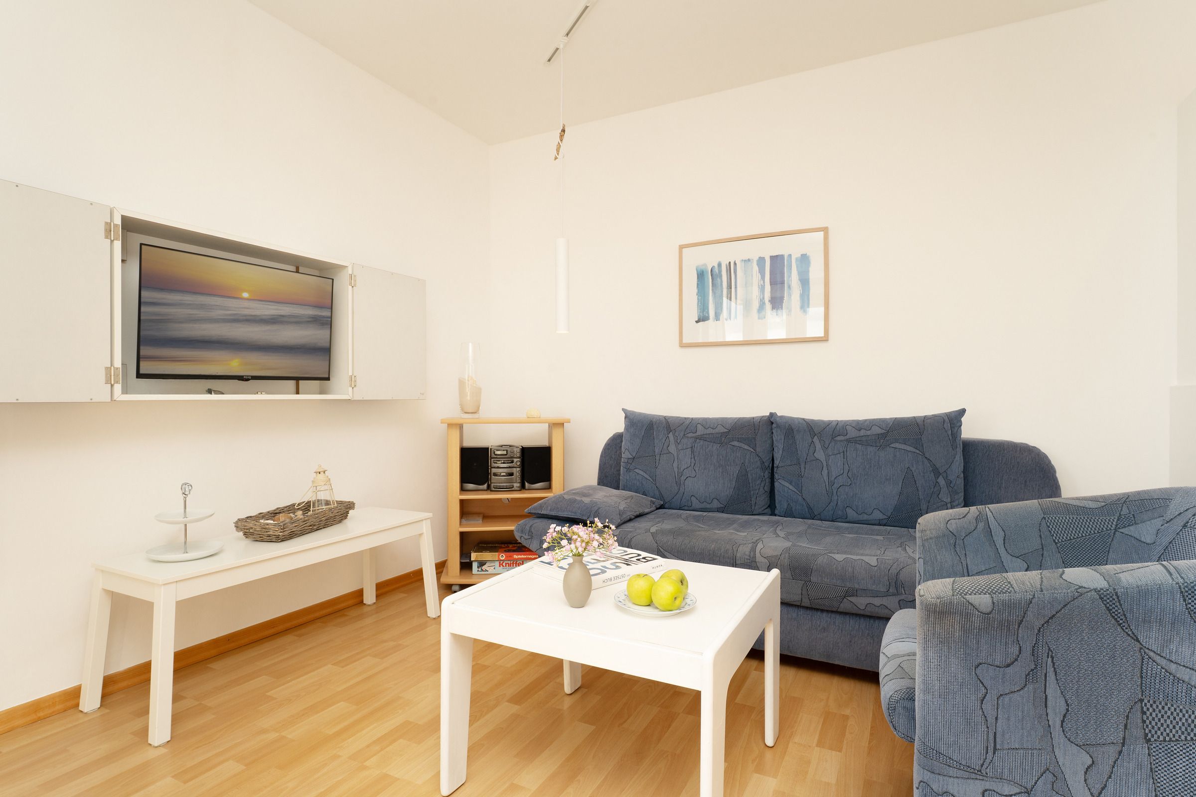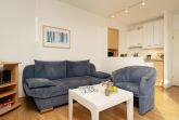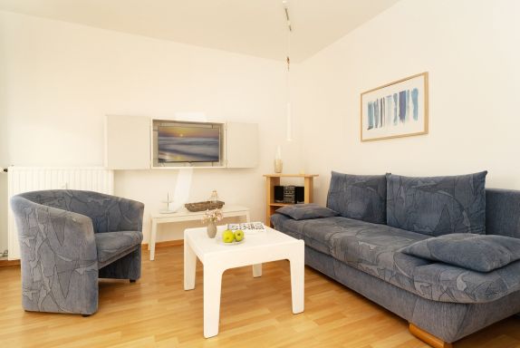 Der Name dieser schönen Wohnung ist Programm: Sie heißt Abendsonne – und genau diese können Sie auf dem großzügigen, möblierten Balkon in Nordwest-Ausrichtung gut geschützt genießen. Dazu gibt es einen herrlichen Weitblick. Auch vom Wohnzimmer aus haben Sie den tollen Blick, nehmen Sie Platz auf dem meerblauen Sofa oder dem Sessel und lassen Sie sich vom TV-Programm oder der Stereoanlage unterhalten. Die funktional ausgestattete Küche ist in den Wohnbereich integriert, ein Tresen fungiert als angenehmer Raumteiler. Den Weitblick können Sie übrigens auch vom Doppelbett (2x 90x200cm) im Schlafzimmer aus genießen, da man über den Balkon hinweg rausschauen kann. Besonders praktisch ist der Insektenschutz am Schlafzimmerfenster - so können Sie bei offenem Fenster im Bett vielleicht das Meeresrauschen hören. Der praktische Flur verfügt über Ganzkörperspiegel und Garderobe. Das innenliegende Duschbad ist hell gefliest und macht Sie munter für den nächsten Tag an der Ostsee. Der Strand ist nur rund 130 Meter entfernt ...