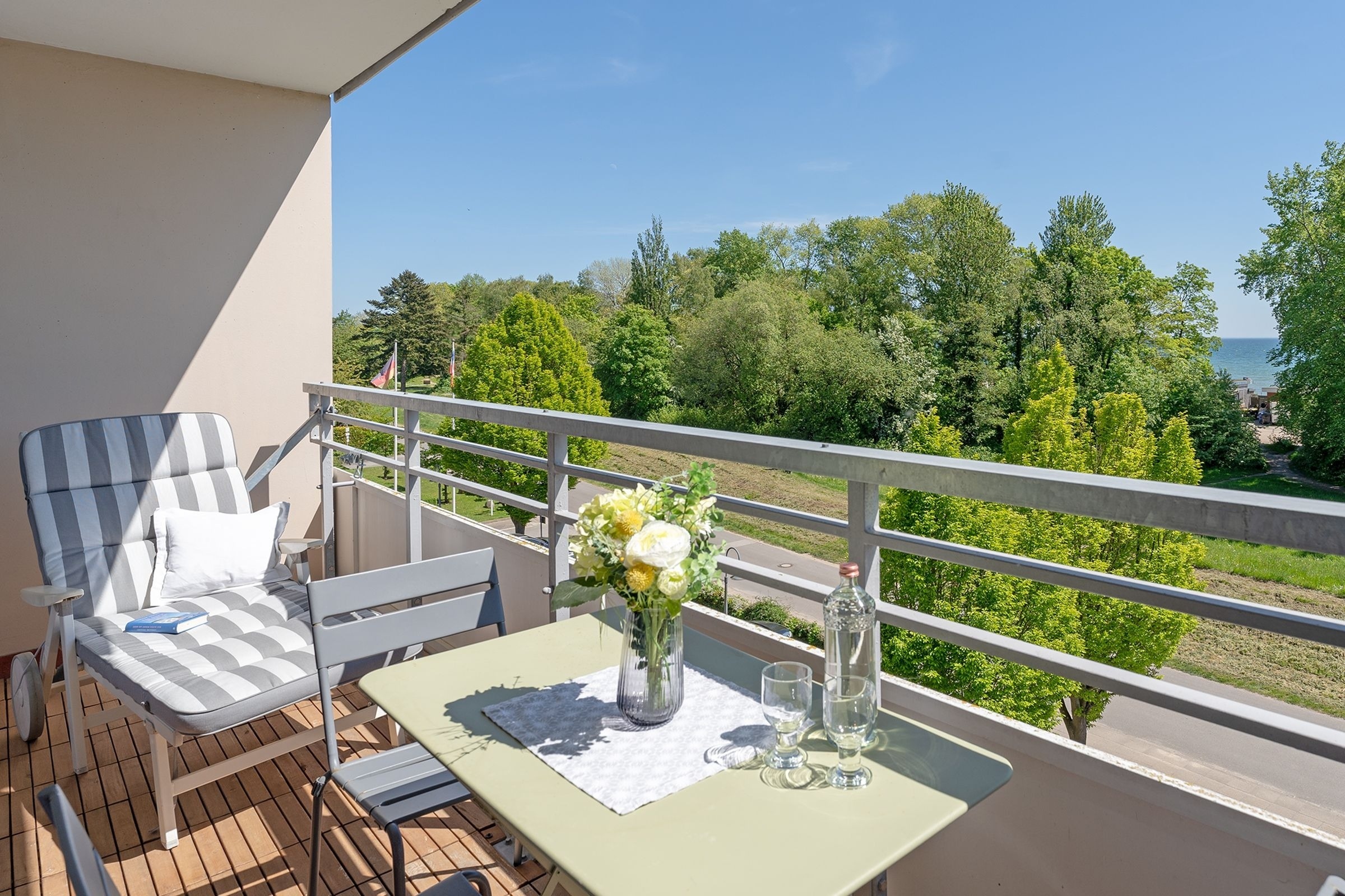 Urlaub der Extra-Klasse in Kellenhusen: strandnahe 2-Zimmer-Ferienwohnung (ca. 40 m²) im 3. Stock mit Aufzug, Balkon und Meerblick für bis zu 3 Personen.