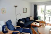 Das Wohnzimmer ist hell und offen gestaltet und mit einer Sofaecke, TV-Gerät und einem Essbereich sowie Küchenzeile ausgestattet. Außerdem befindet sich hier der Zugang zum möblierten Balkon mit seitlichem Blick auf den Hafen.