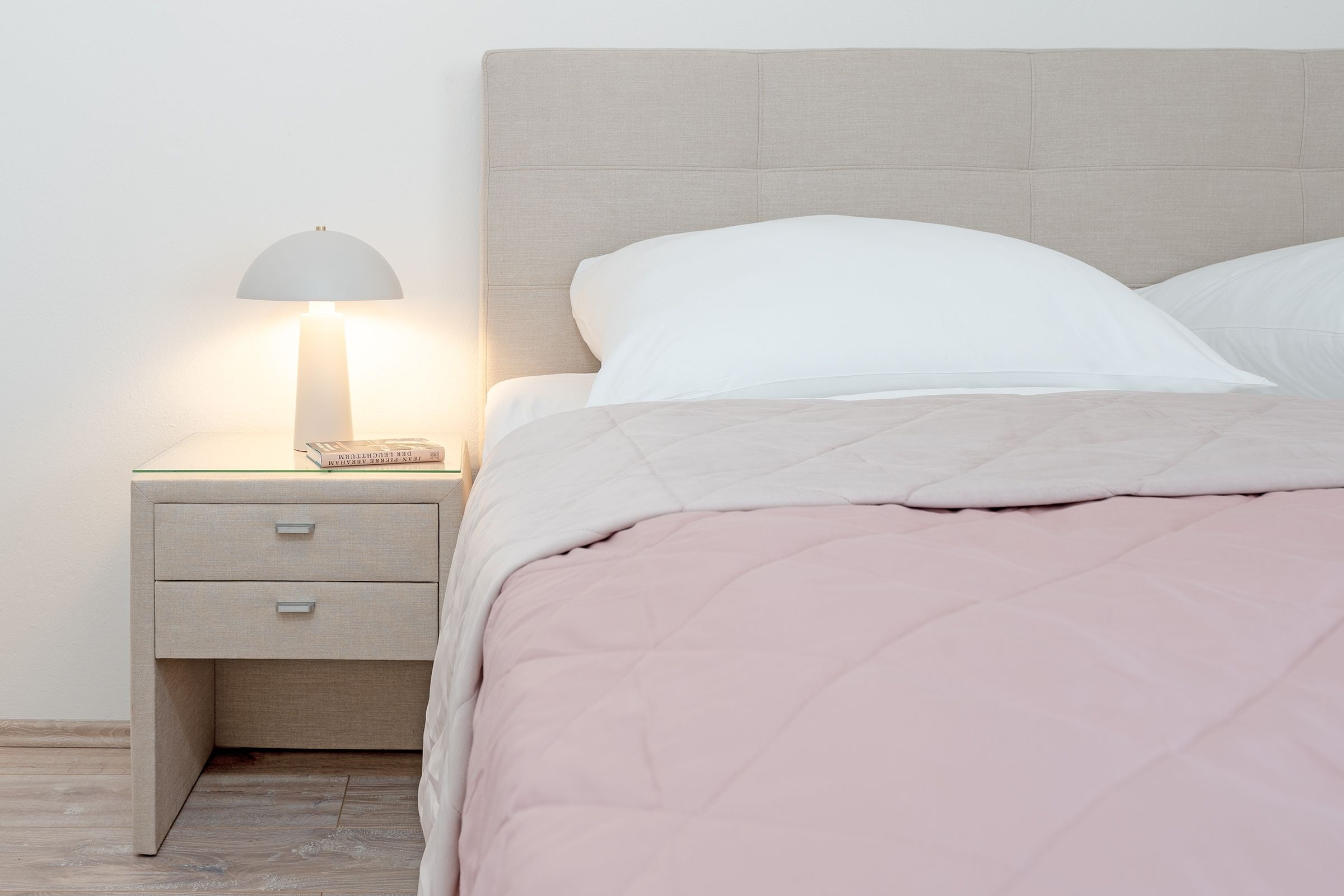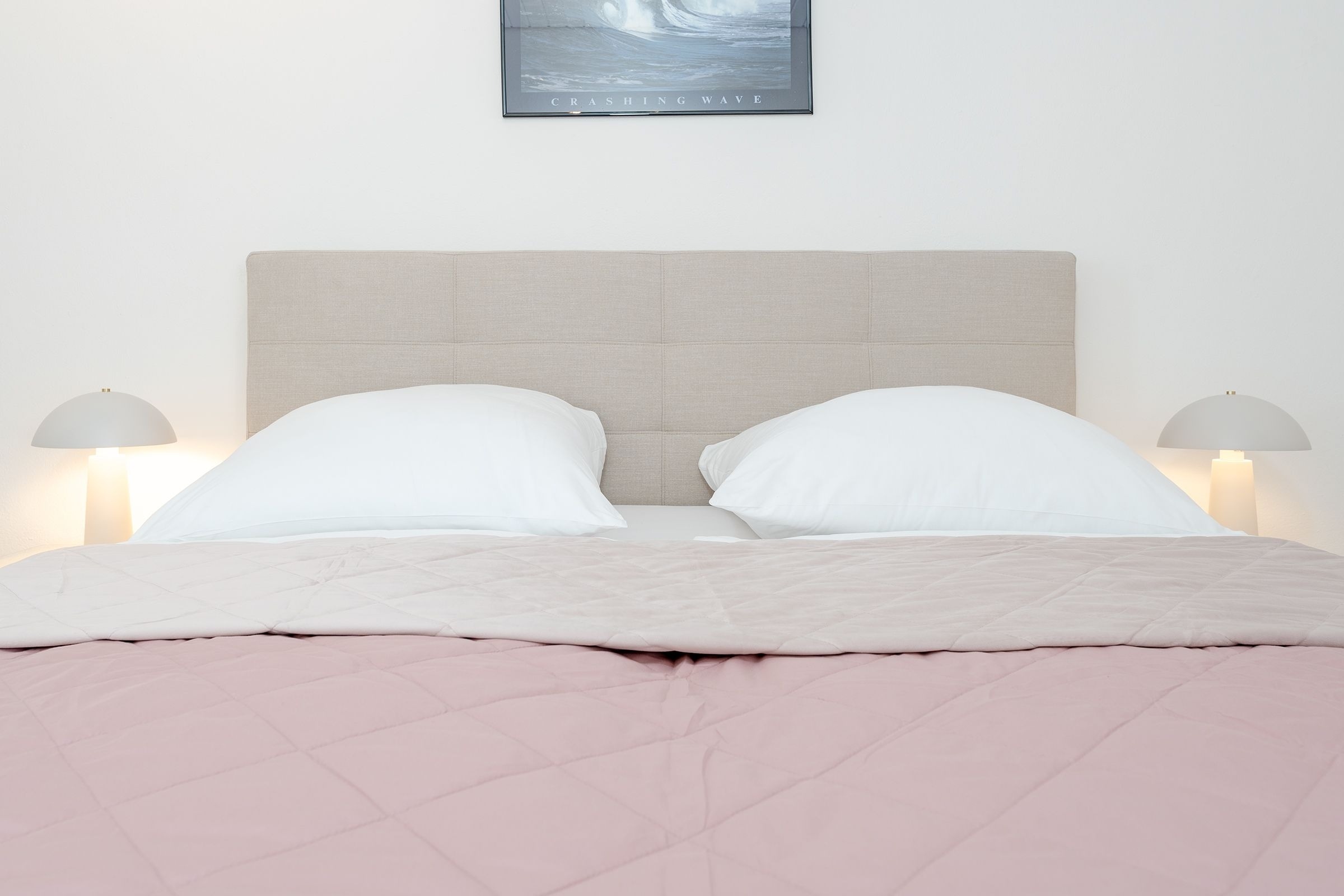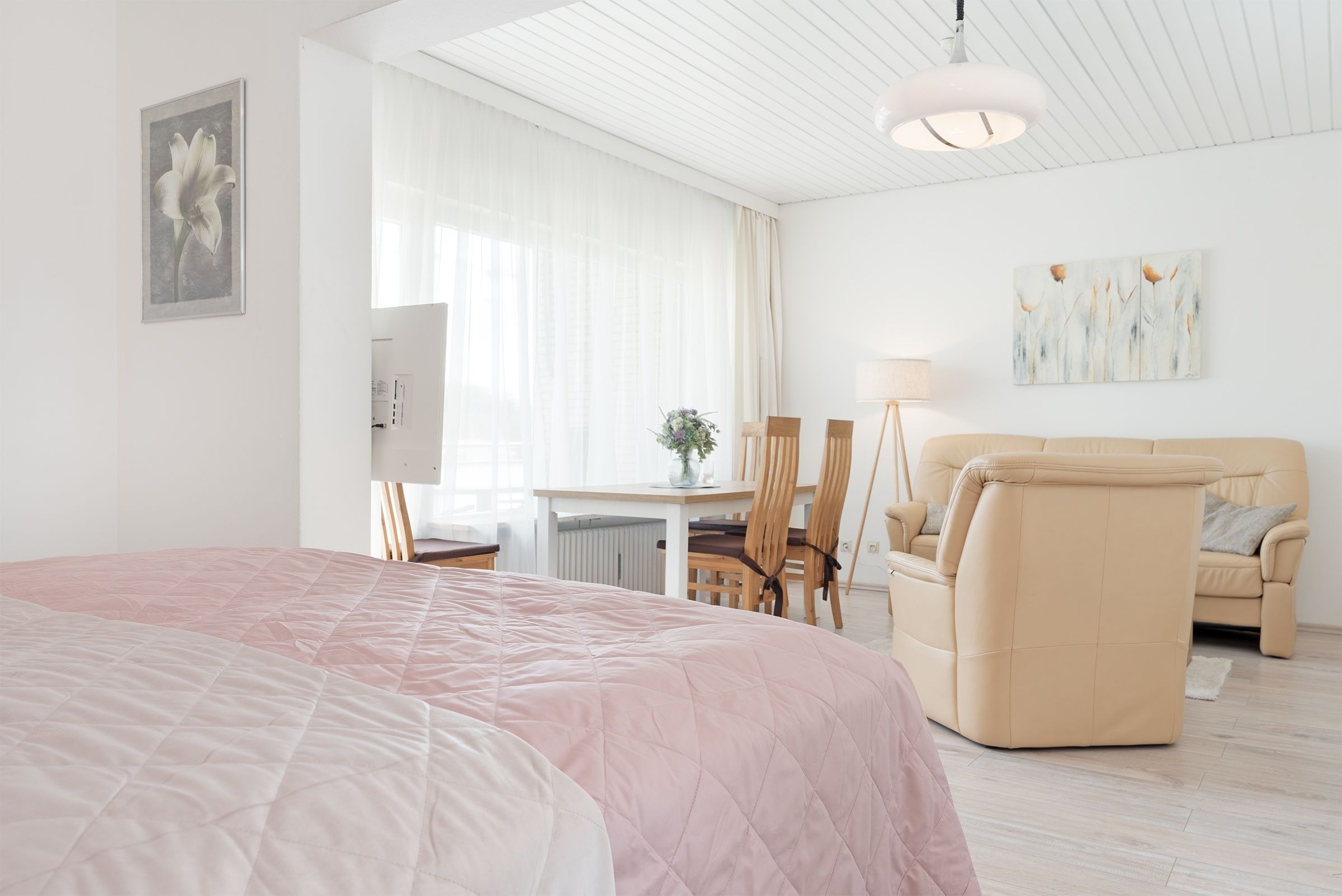 Wohnzimmer: 1 Boxspringbett (180x200 cm), Kleiderschrank, Verdunkelungsvorhänge, Platz für Babybett vorhanden