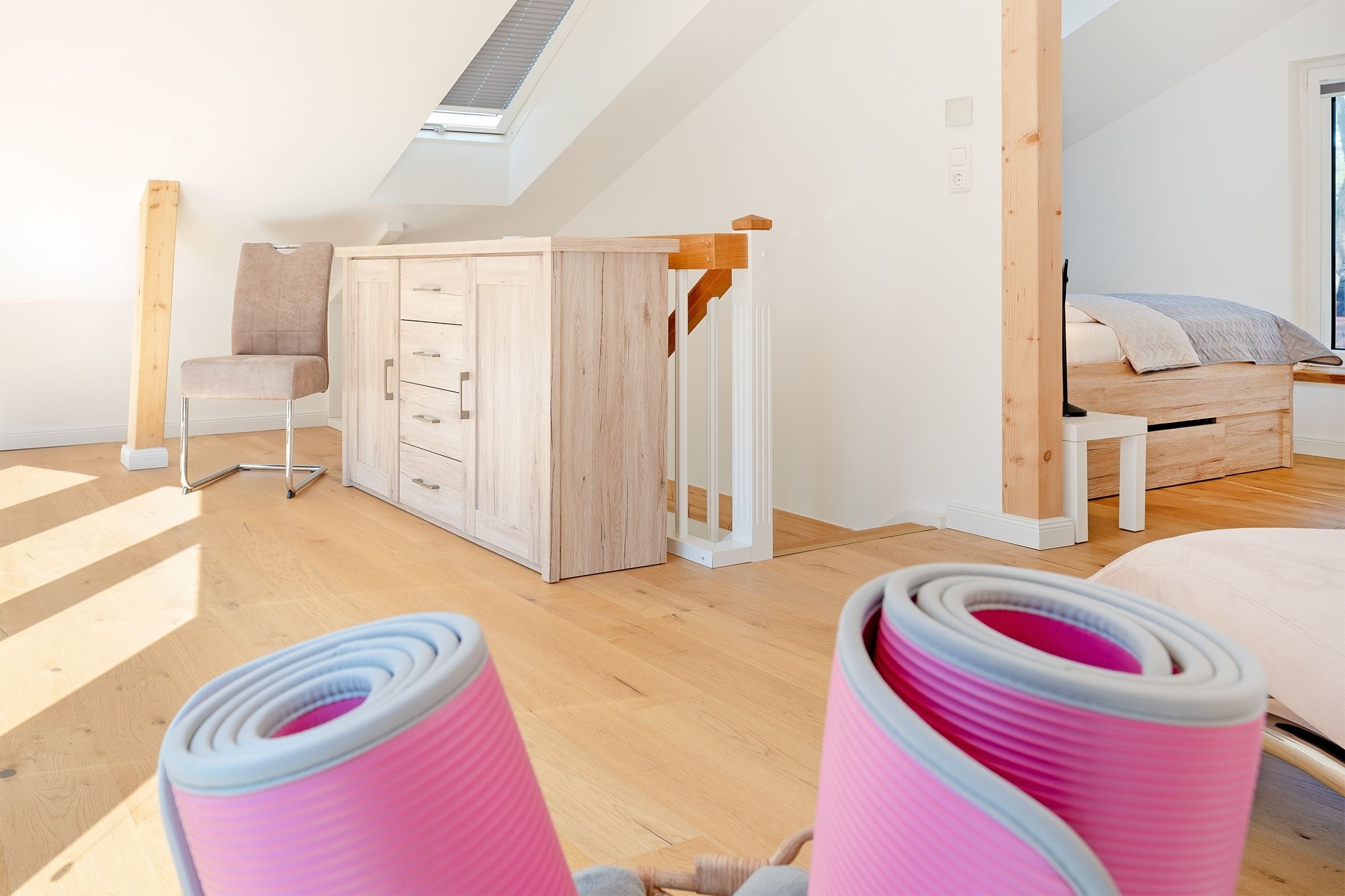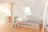 Schlafzimmer (OG): 1 Doppelbett (2x 100x200 cm), Verdunkelung: Innenrollos, Platz für Babybett vorhanden