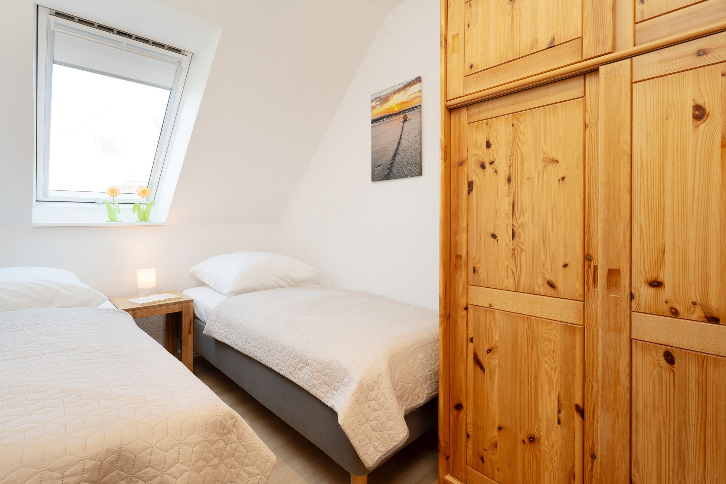 Schlafzimmer 2: 2x Einzelbett (je ca. 80x200 cm), Kleiderschrank, Verdunkelung (Rollo), kein Platz für Kinderreisebett vorhanden