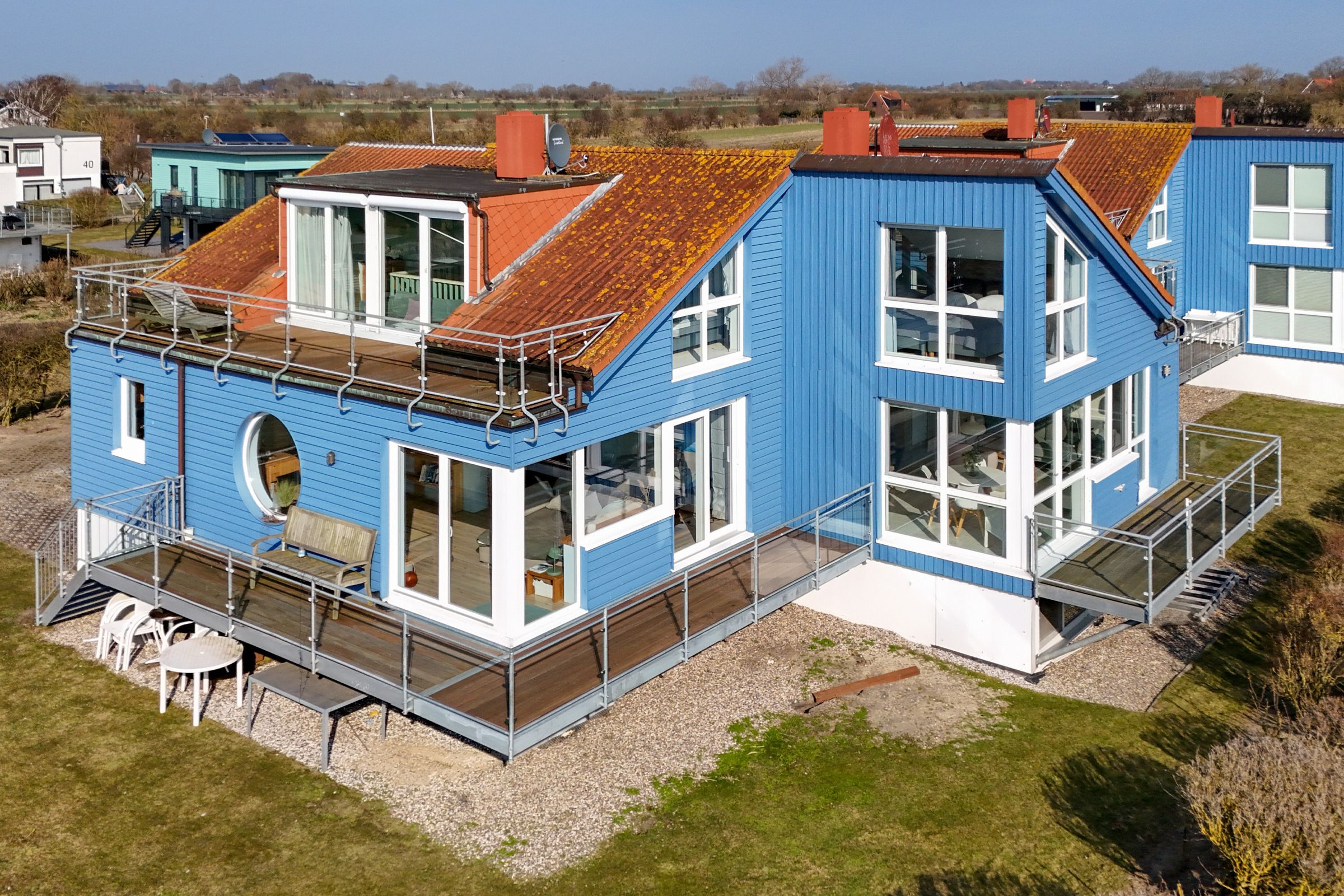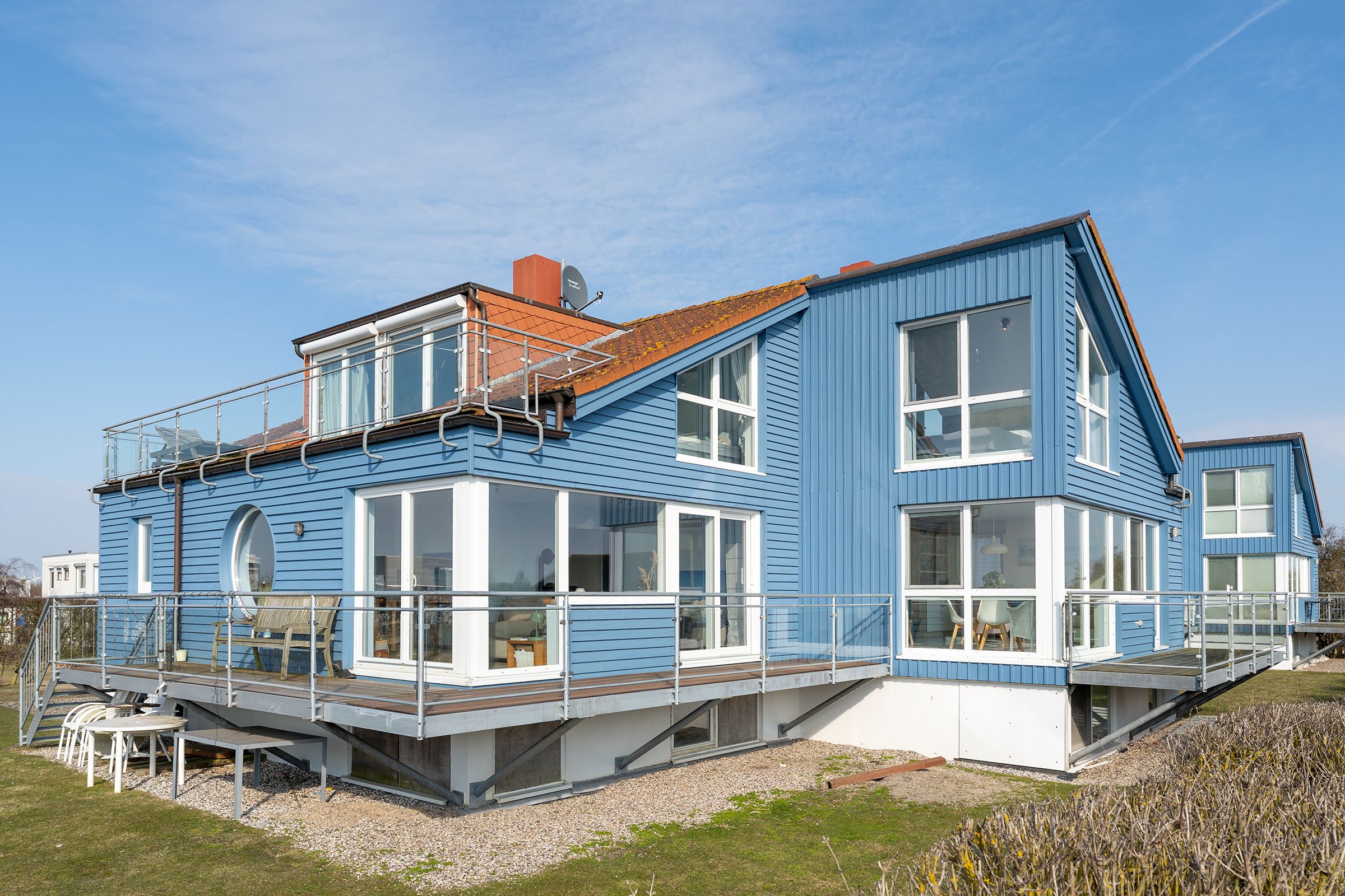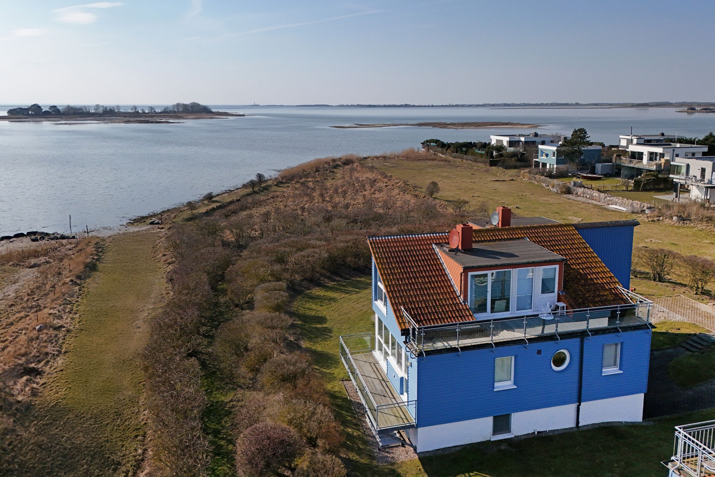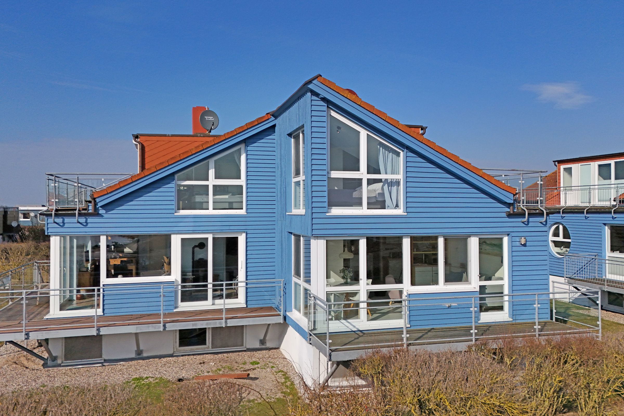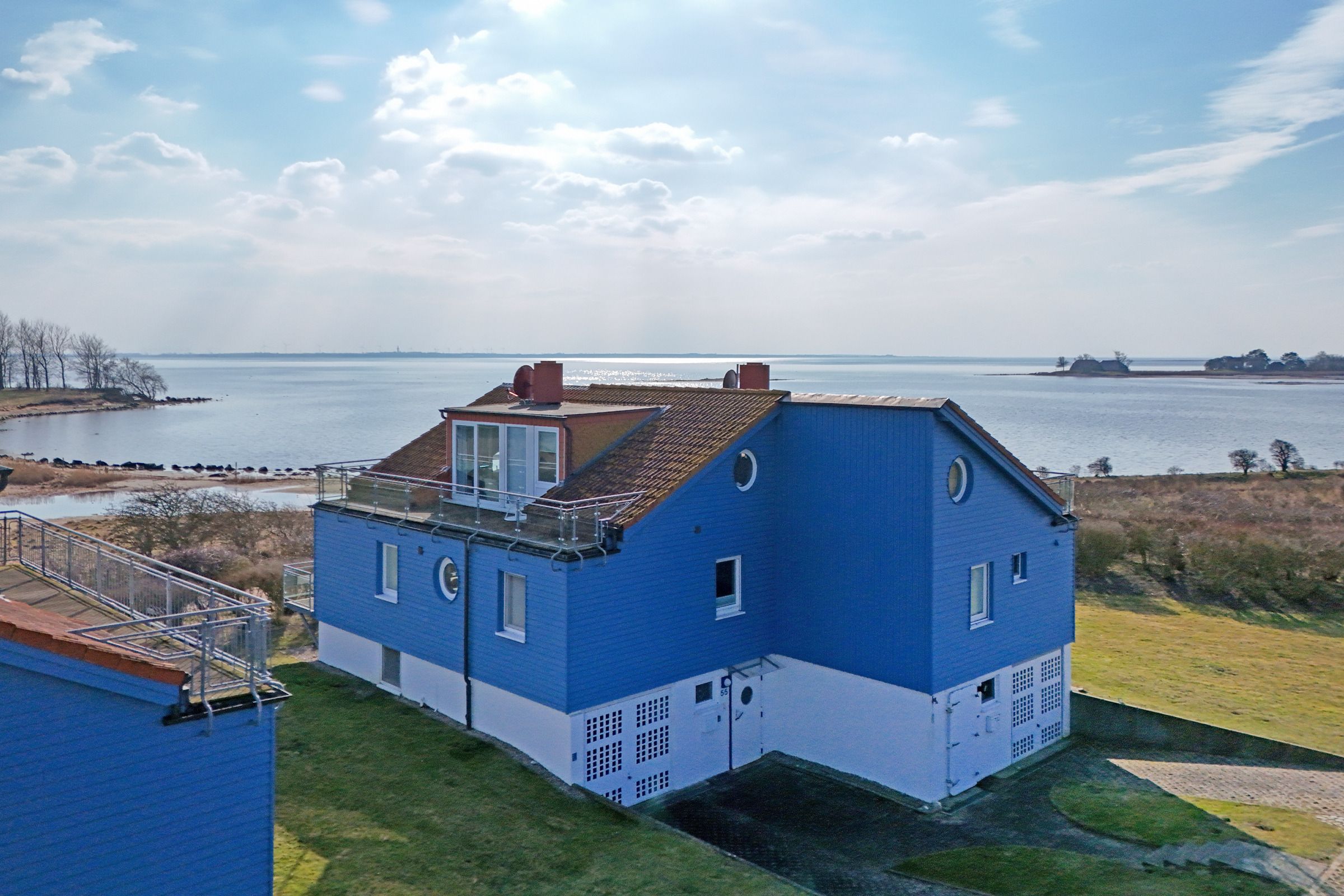 Herzlich Willkommen im blauen Haus. Herzlich Willkommen an einem besonderen Ort! Am Ende einer Sackgasse, direkt am Naturschutzgebiet mit einem fantastischen Blick auf das Meer, die Bucht und die Fehmarnsundbrücke. Zwei Balkone zum Sonnen, Essen und Genießen im Sommer. Ein knisterndes Kaminfeuer im Winter - ein Aufenthalt im Ferienhaus Meerkieker ist zu jeder Zeit ein Erlebnis. Der Eingangsbereich befindet sich im Tiefgeschoss, gleich neben dem PKW-Stellplatz und der Garage. Von dort geht es über eine Wendeltreppe nach oben in den hellen Wohn- und Essbereich mit offener Küche und Zugang zum Balkon. Hier erwarten Sie ein großes Sofa, Sat-TV, Kaminofen sowie ein bequemer Essplatz. Die Küche ist z. B. mit Geschirrspüler, Cerankochfeld, Backofen, Kaffeemaschine und vielem mehr ausgestattet. In diesem Geschoss befindet sich auch ein Schlafzimmer mit Doppelbett (180x200 cm) und ein Duschbad. Über eine weitere Wendeltreppe gelangen Sie zum zweiten Schlafbereich mit zwei Einzelbetten (je 80x200 cm) und einem Vollbad. Sowohl das Dachgeschoss als auch das Erdgeschoss haben einen Balkon mit Meerblick.