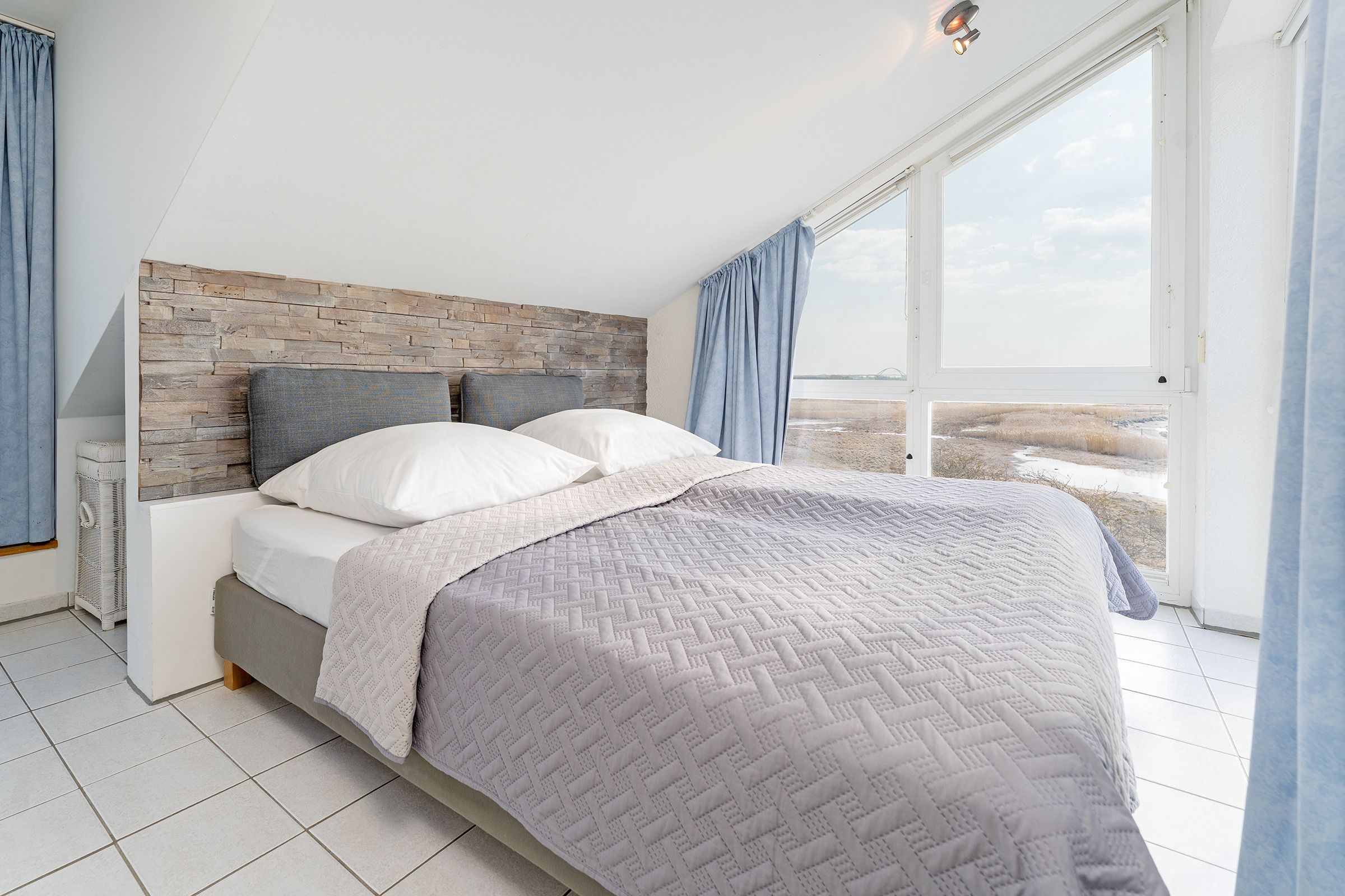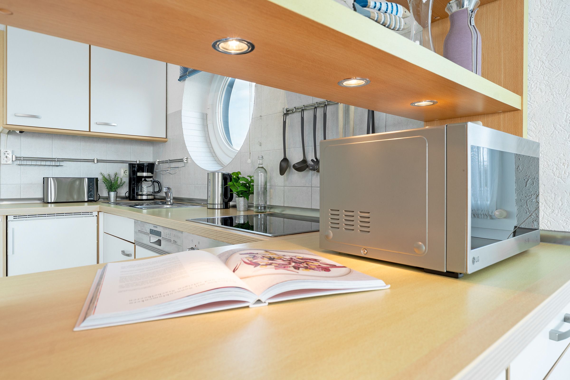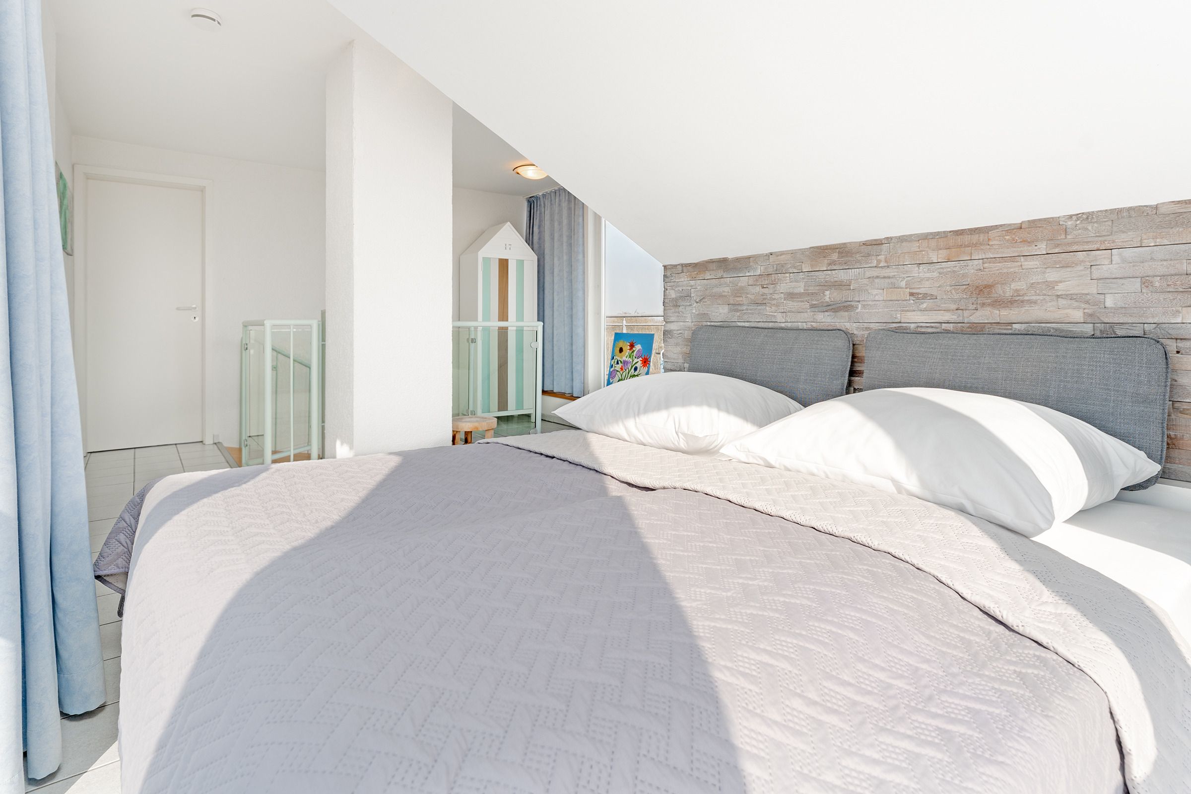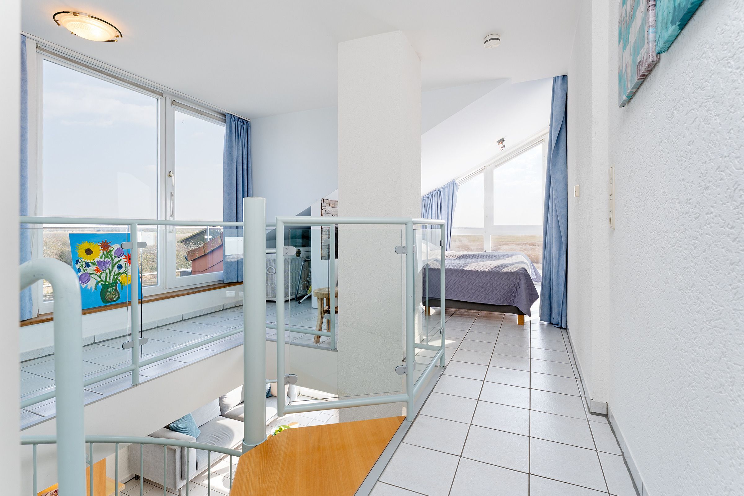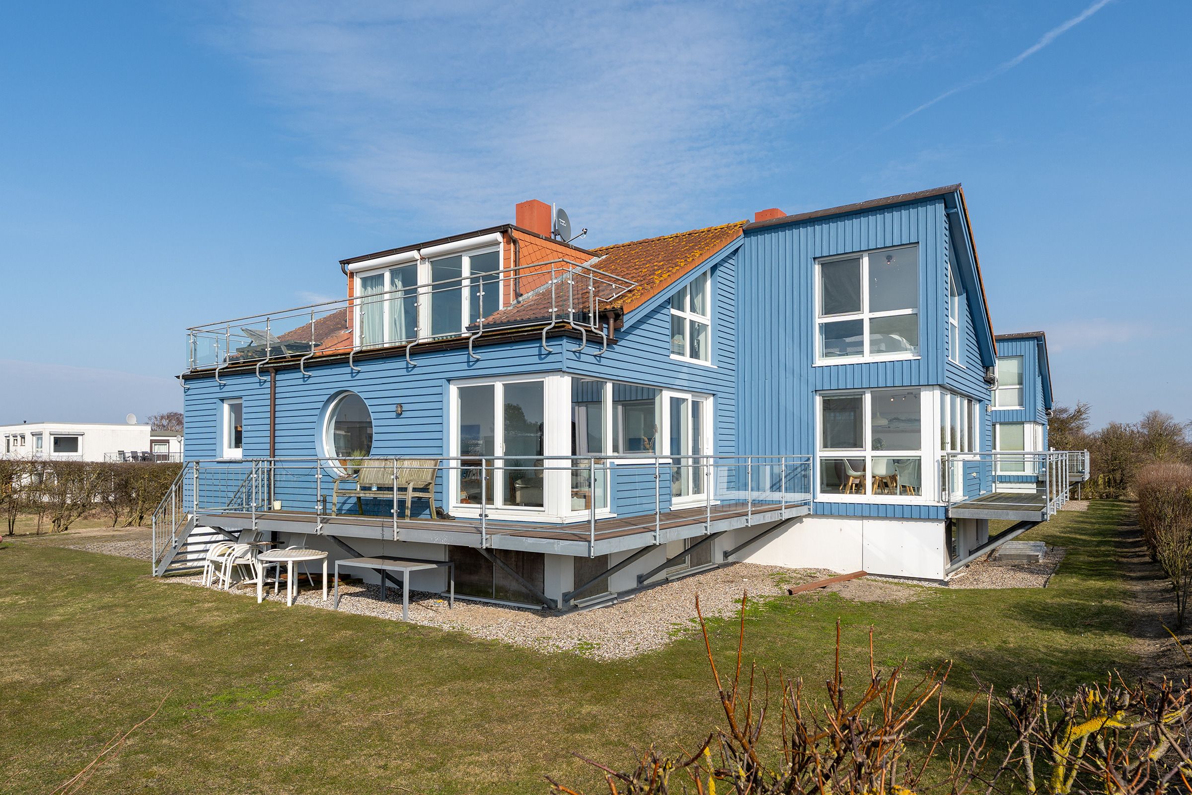 Herzlich Willkommen im blauen Haus. Herzlich Willkommen an einem besonderen Ort! Am Ende einer Sackgasse, direkt am Naturschutzgebiet mit einem fantastischen Blick auf das Meer, die Bucht und die Fehmarnsundbrücke. Zwei Balkone zum Sonnen, Essen und Genießen im Sommer. Ein knisterndes Kaminfeuer im Winter - ein Aufenthalt im Ferienhaus Meerkieker ist zu jeder Zeit ein Erlebnis. Der Eingangsbereich befindet sich im Tiefgeschoss, gleich neben dem PKW-Stellplatz und der Garage. Von dort geht es über eine Wendeltreppe nach oben in den hellen Wohn- und Essbereich mit offener Küche und Zugang zum Balkon. Hier erwarten Sie ein großes Sofa, Sat-TV, Kaminofen sowie ein bequemer Essplatz. Die Küche ist z. B. mit Geschirrspüler, Cerankochfeld, Backofen, Kaffeemaschine und vielem mehr ausgestattet. In diesem Geschoss befindet sich auch ein Schlafzimmer mit Doppelbett (180x200 cm) und ein Duschbad. Über eine weitere Wendeltreppe gelangen Sie zum zweiten Schlafbereich mit zwei Einzelbetten (je 80x200 cm) und einem Vollbad. Sowohl das Dachgeschoss als auch das Erdgeschoss haben einen Balkon mit Meerblick.