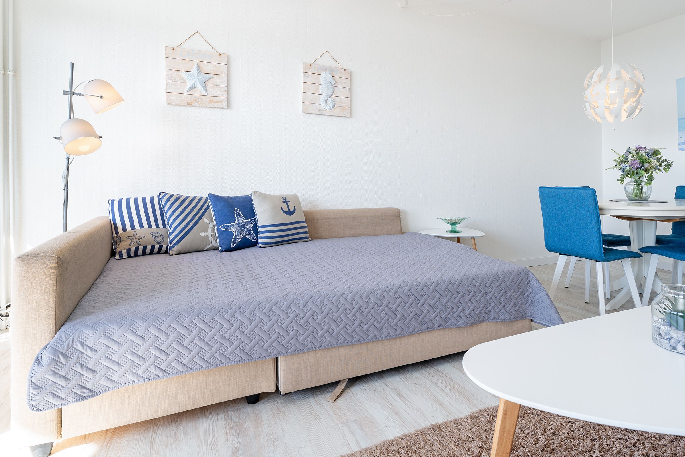Hereinspaziert! Genießen Sie den traumhaften Blick auf die Ostsee aus dem großzügigen Wohn-Essbereich sowie vom überdachtem, möblierten Balkon aus. Ihr Urlaub kann beginnen. Der geschmackvoll eingerichtete Wohnbereich ist mit einer gemütlichen Schlafcouch, einem Smart-TV sowie einer netten Essecke ausgestattet. In der halb offenen Küche können Sie neue Rezepte der Region ausprobieren. Eine Spülmaschine übernimmt anschließend den Abwasch. Traumhaft nächtigen werden Sie im separaten Schlafzimmer im kuscheligen Doppelbett (140x200 cm). Das hell geflieste Duschbad bringt Sie gut in den neuen Tag. Der nahegelegene Naturstrand lädt zum Baden ein, aber auch Wassersportliebhabern bietet er viele Möglichkeiten. Auf dem fußläufig erreichbaren Campingplatz finden Sie einen Supermarkt sowie Restaurants und Spielmöglichkeiten für Kinder.