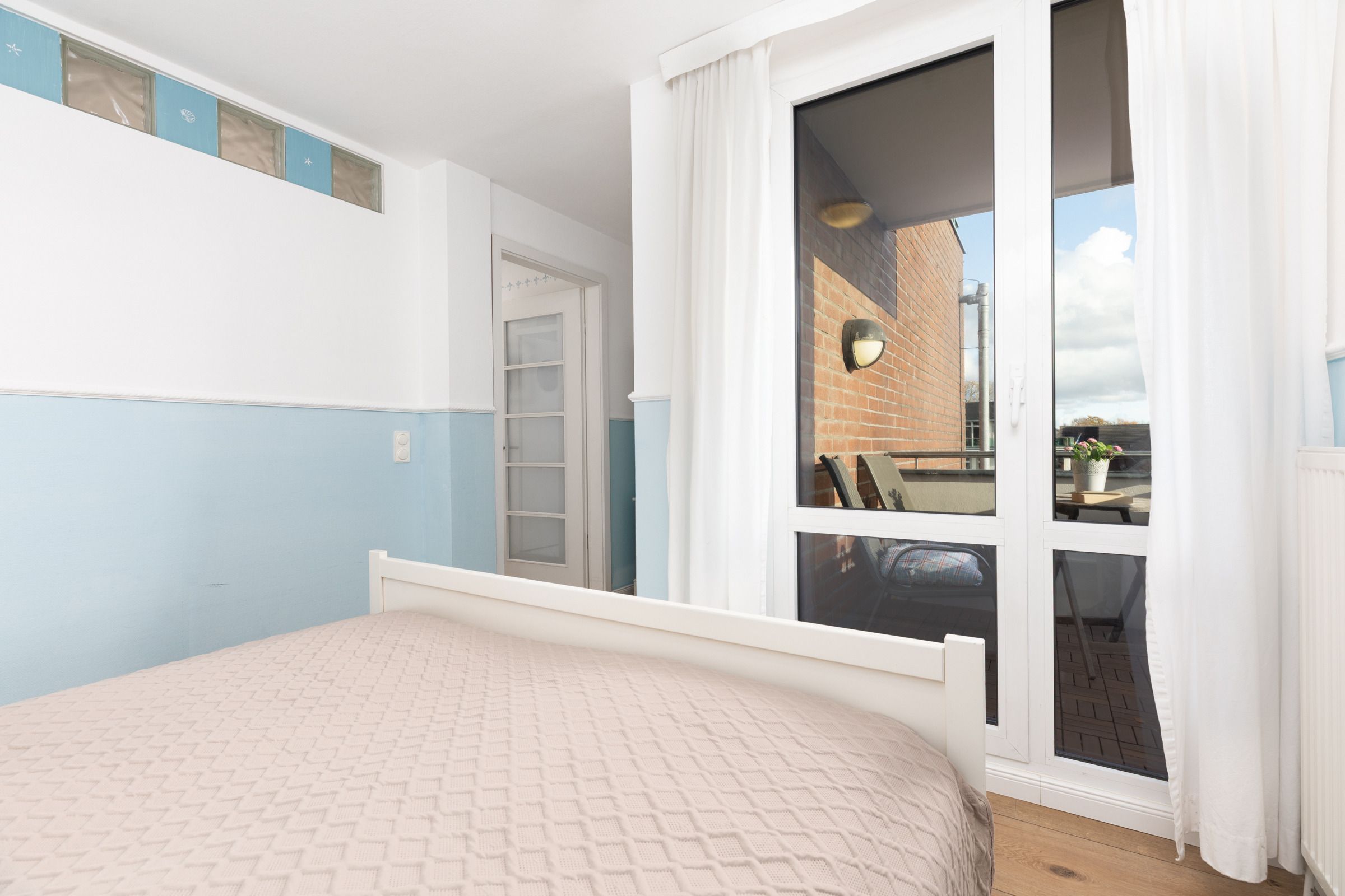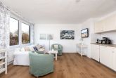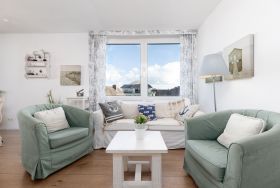 Nur rund 100 Meter vom Strand entfernt ... Die ideale Lage und die liebevoll ausgesuchte Möblierung machen diese Ferienwohnung zum perfekten Urlaubsdomizil an der Ostsee. Lassen Sie sich vom traumhaften Meerblick vom Balkon aus verzaubern - auch von Innen haben Sie die Ostsee im Blick. Das Appartement besteht aus einem kombiniertem Wohn-/Schlafbereich mit einer eingebauten Küchenzeile mit Ceranfeld und Geschirrspüler. Im separatem Schlafzimmer steht ein bequemes Doppelbett (2x 90x200 cm), in dem Sie herrlich träumen werden. Auch die Couch im Wohnzimmer bietet einen Schlafplatz (ca. 130x190 cm). In dem großen Badezimmer mit Duschwanne und Handtuchtrockner können Sie entspannt in den neuen Tag starten.
