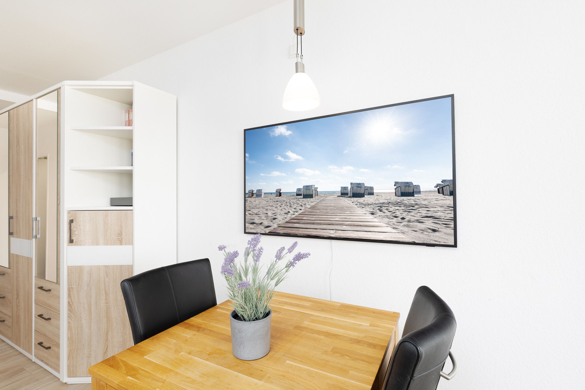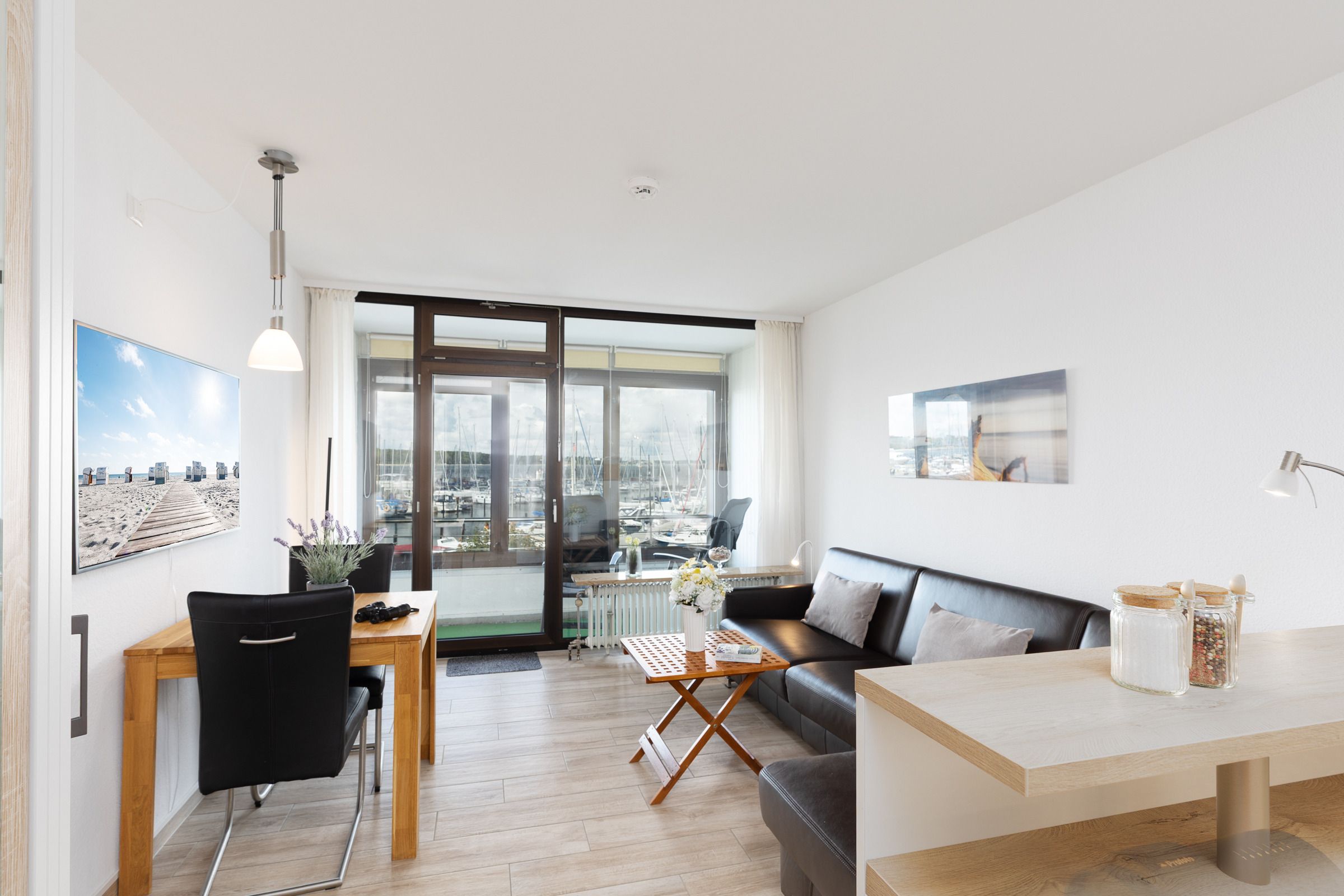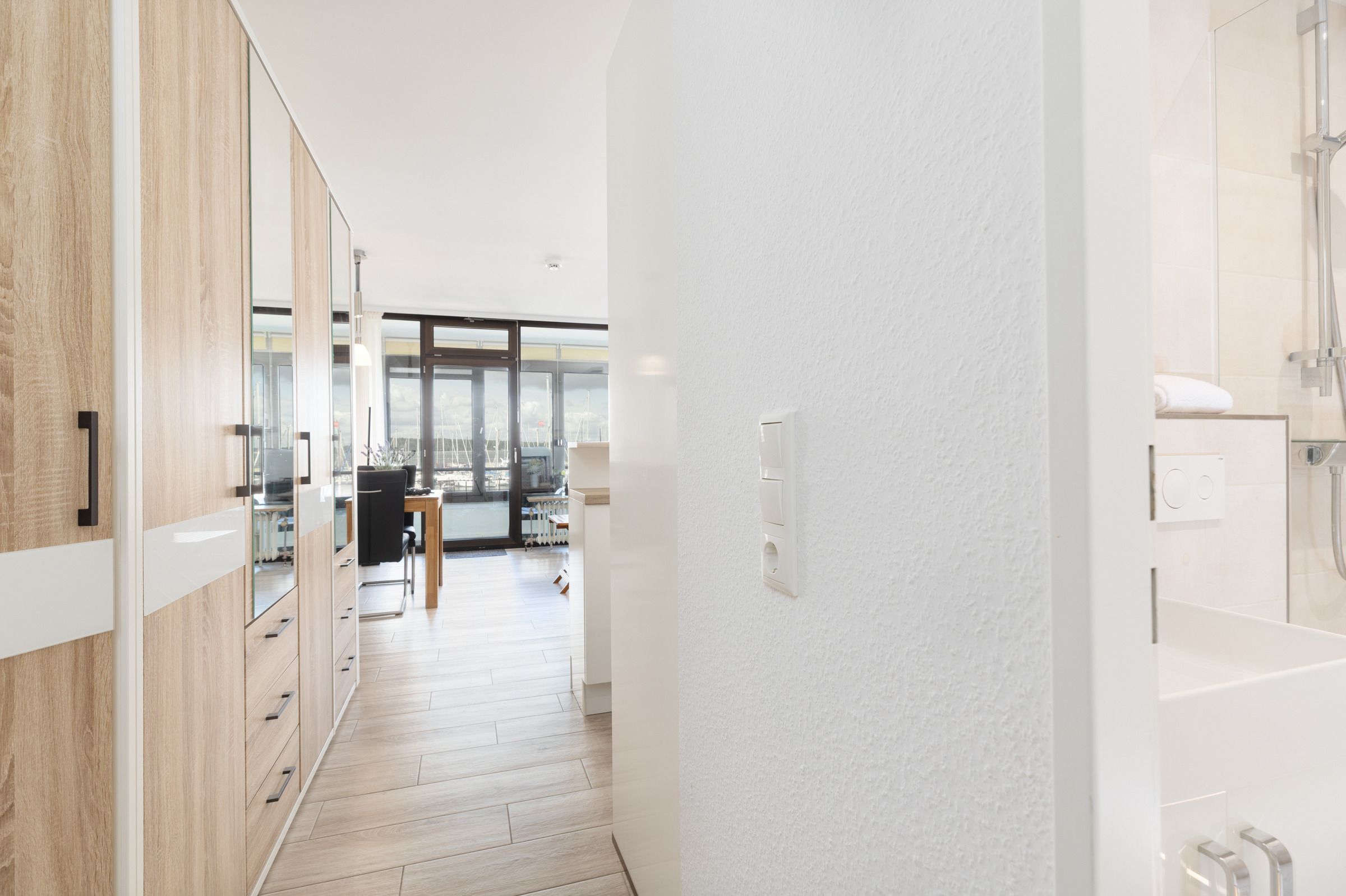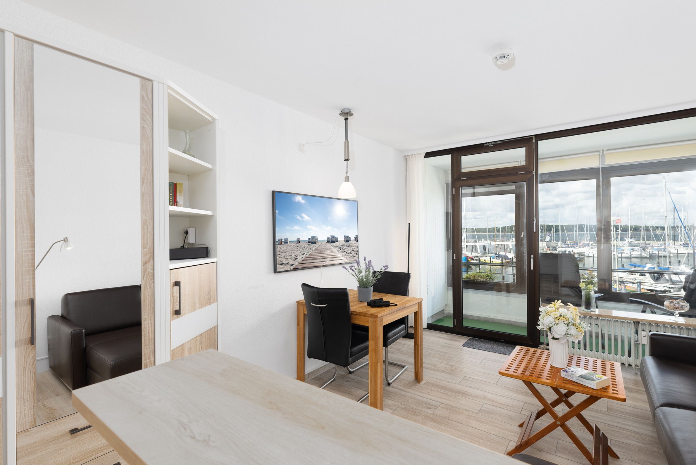 Herzlich willkommen! In der schönen Wohnung Hafenkajüte können Sie abschalten und die Seele baumeln lassen, während Sie den wunderschönen Blick auf den Hafen und die Kieler Förde vom möblierten Balkon aus genießen. Der Balkon ist verglast, sodass Sie auch in den Wintermonaten die vielen Schiffe beobachten können. Im Sommer können Sie die Fenster weit öffnen und die frische Meeresluft reinlassen. Auch vom Wohnraum aus haben Sie den tollen Blick aufs Wasser. Hier steht eine Schlafcouch, die mit einem Handgriff zum bequemen Bett (160 cm breit) umgebaut werden kann. Die angrenzende Küche ist mit einer Mikrowellen-Backofen-Kombination, einem Induktionsherd und einer Spülmaschine ausgestattet. Im großzügigen Kleiderschrank findet Ihre Urlaubsgarderobe Platz. Das moderne Duschbad ist hell gefliest.