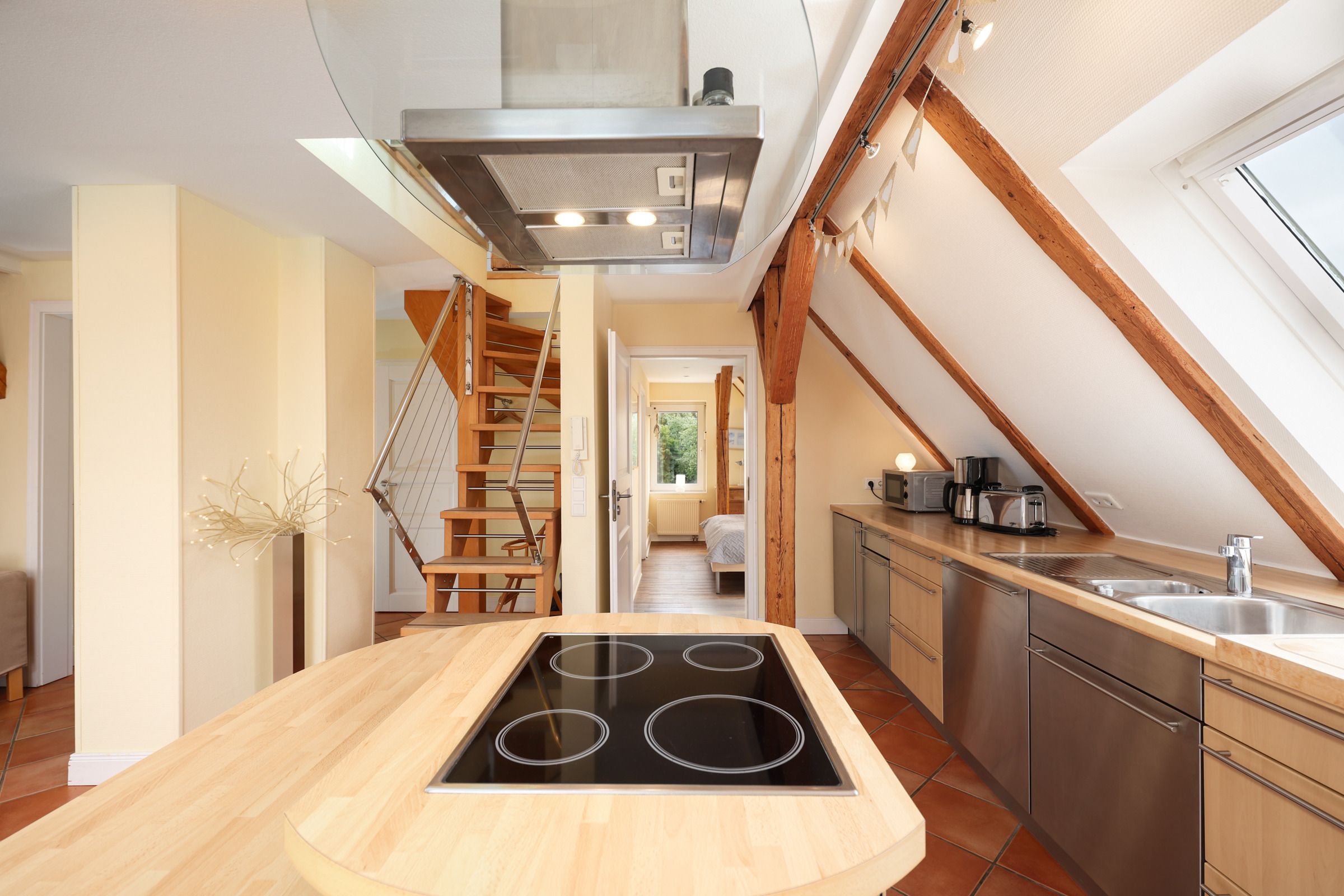 Erleben Sie einen entspannten Aufenthalt in zweiter Reihe im Herzen von Laboe. Nutzen Sie die kurzen Wege zum Strand und beobachten in luftiger Höhe von der Dachterrasse oder darüberliegend vom Cabriofenster aus vorbeiziehende, dicke Pötte, Segler & Kitesurfer - selbst das Ehrenmal von Laboe ist von hier aus gut sichtbar. Die untere Ebene verfügt über einen großzügigen kombinierten Wohn-Ess-Küchenbereich mit gemütlichen Holzbalken.. Entspannen Sie in der Sitzecke mit Smart-TV. oder kochen Sie gemeinsam in der hochwertigen Küchenzeile mit Kochinsel und Sitzplätzen. Ein Schlafzimmer mit Doppelbett (2x 90x200 cm) sowie einem Badezimmer en Suite, ein weiteres Duschbad sowie die möblierte Dachterrasse runden diese Etage ab. Über einen schmalen Treppenaufgang im Schiffsdesign erreichen Sie das Dachgeschoss in der 4. Etage. Das dortige Zweibettzimmer ist separiert vom weiteren Wohnbereich mit gemütlichen Sitzmöbeln, Flachbild-TV und vor allem dem beeindruckenden Ausblick aus dem Cabriofenster Richtung Kieler Förde.