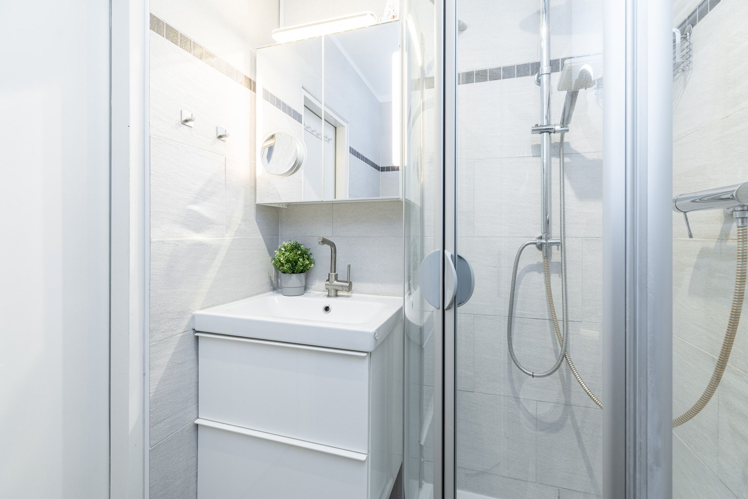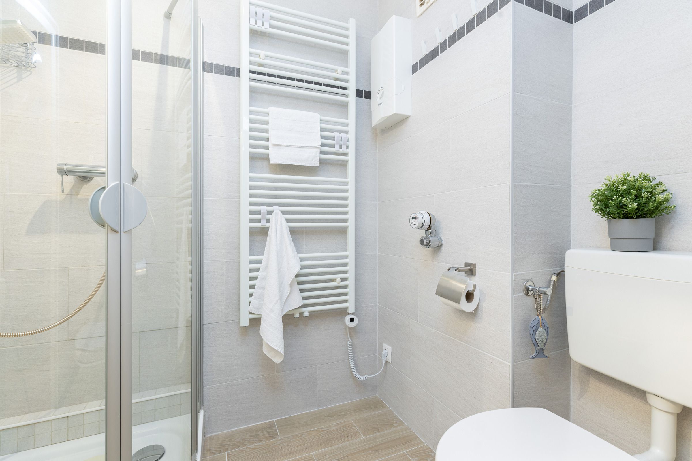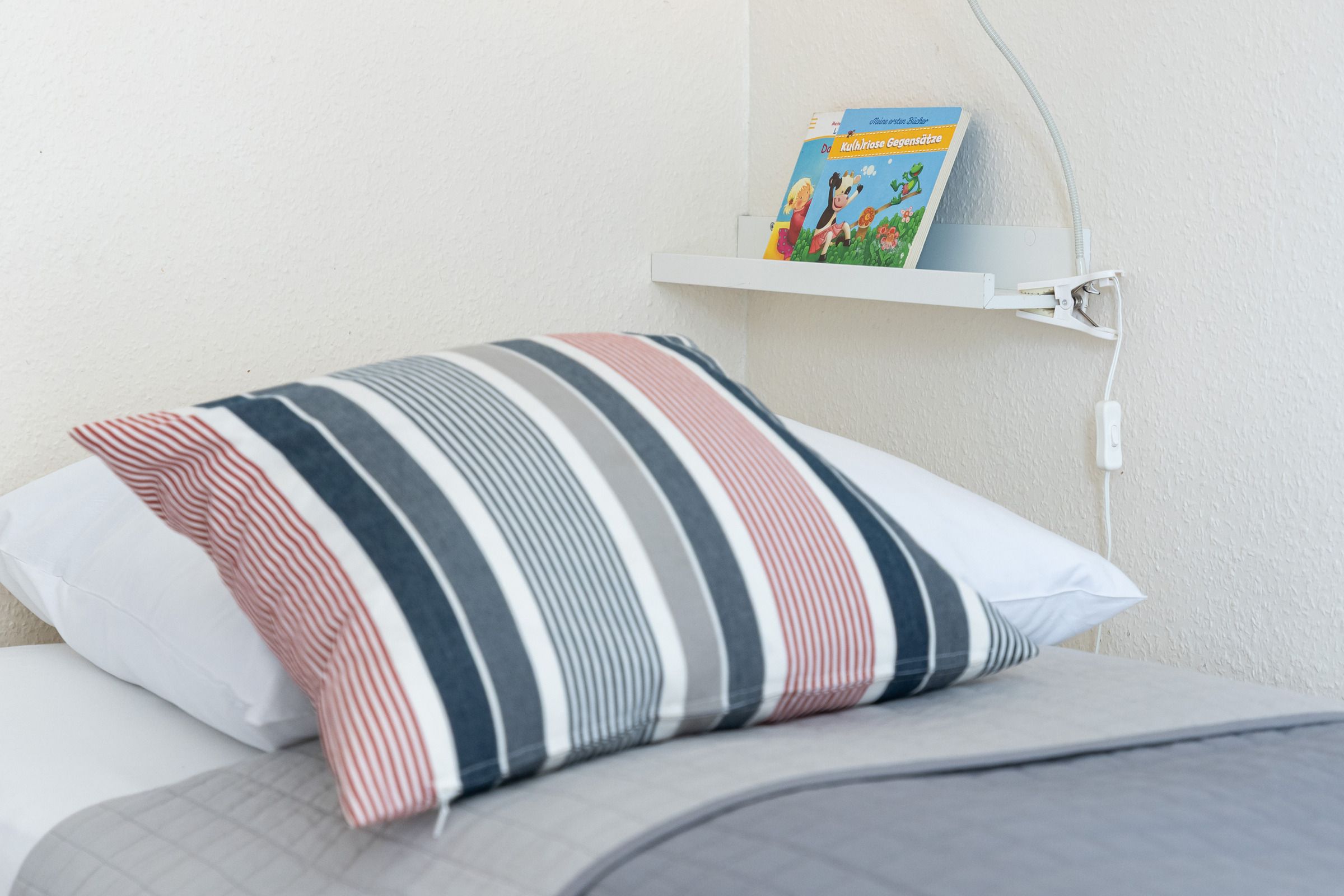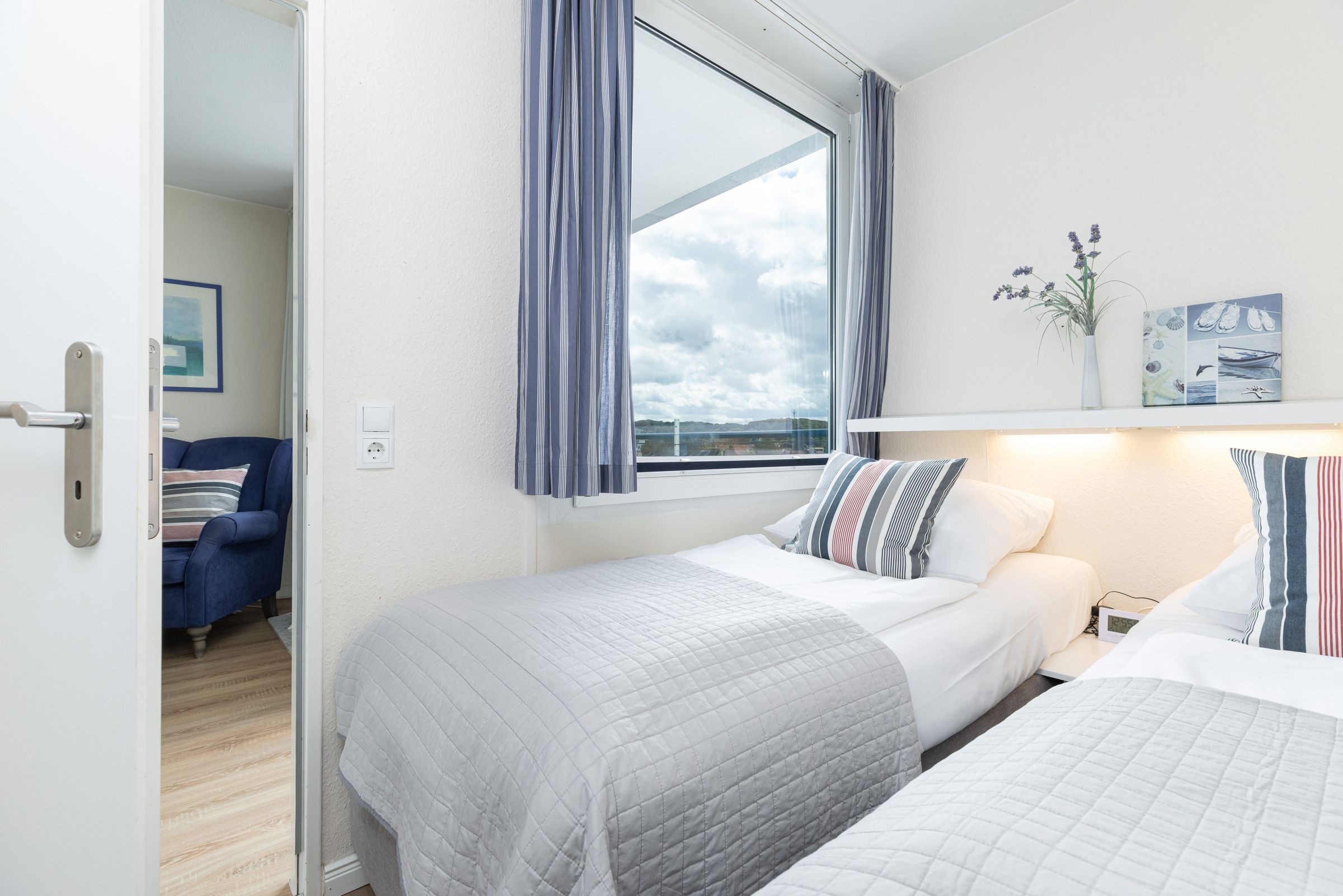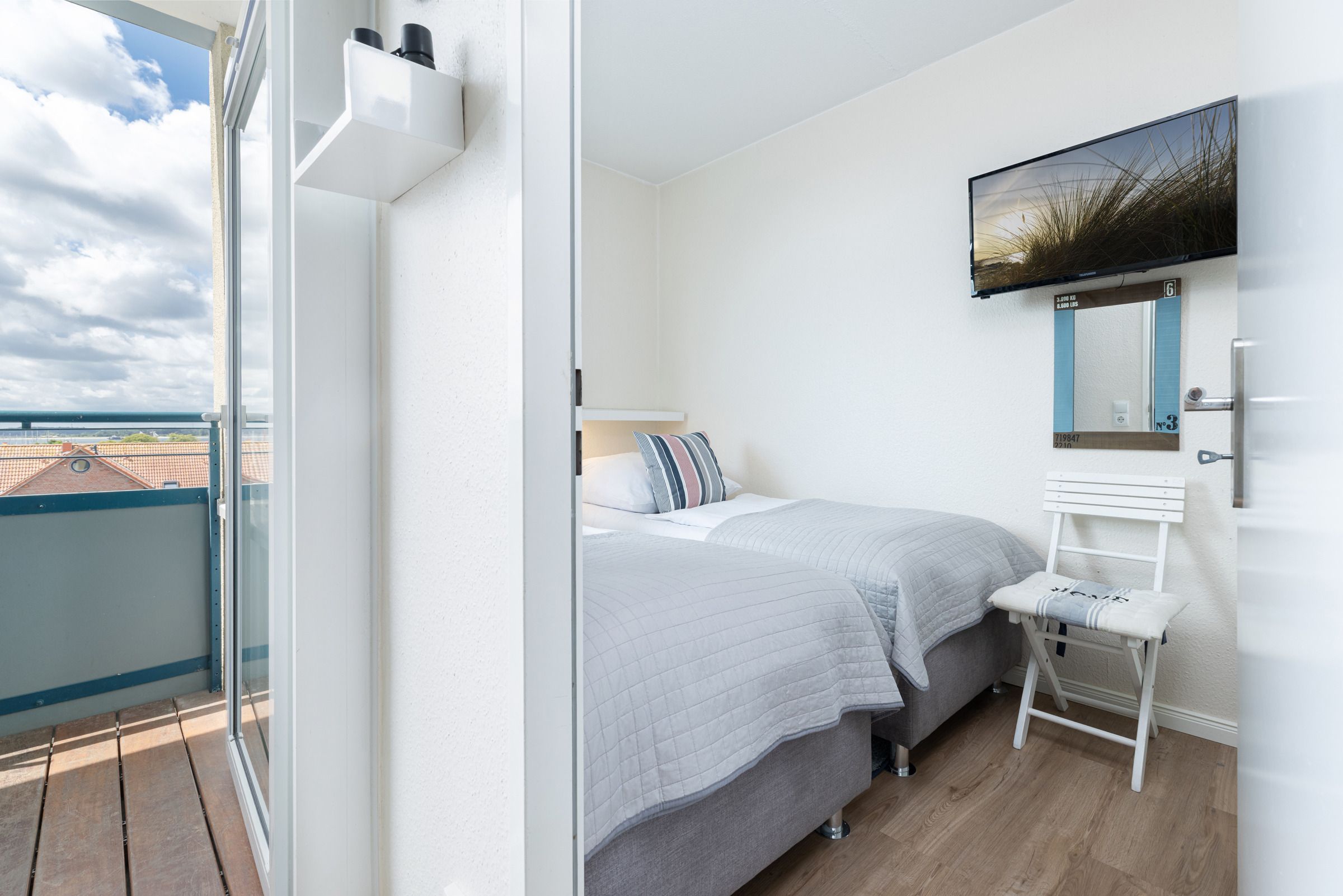 Auf ca. 46 m² Wohnfläche stehen Ihnen zwei separate Schlafzimmer mit je zwei Einzelbetten (90x200 cm), ein kombinierter Wohn-/Essraum sowie eine kleine Küche und ein modernes Badezimmer mit Dusche/WC zur Verfügung. In einem der zwei Schlafzimmer können bis zu 3 Personen schlafen. Ein Bettschutzgitter (Rausfallschutz) für die kleinen Gäste ist vorhanden. Zusätzlich können Sie sich über einen Netflix-Zugang freuen. Vom sonnigen Balkon aus genießen Sie einen schönen Blick auf die Kieler Innenförde. Mit einem Fernglas können Sie die großen Kreuzfahrer und Fährschiffe hautnah vorbeifahren sehen.