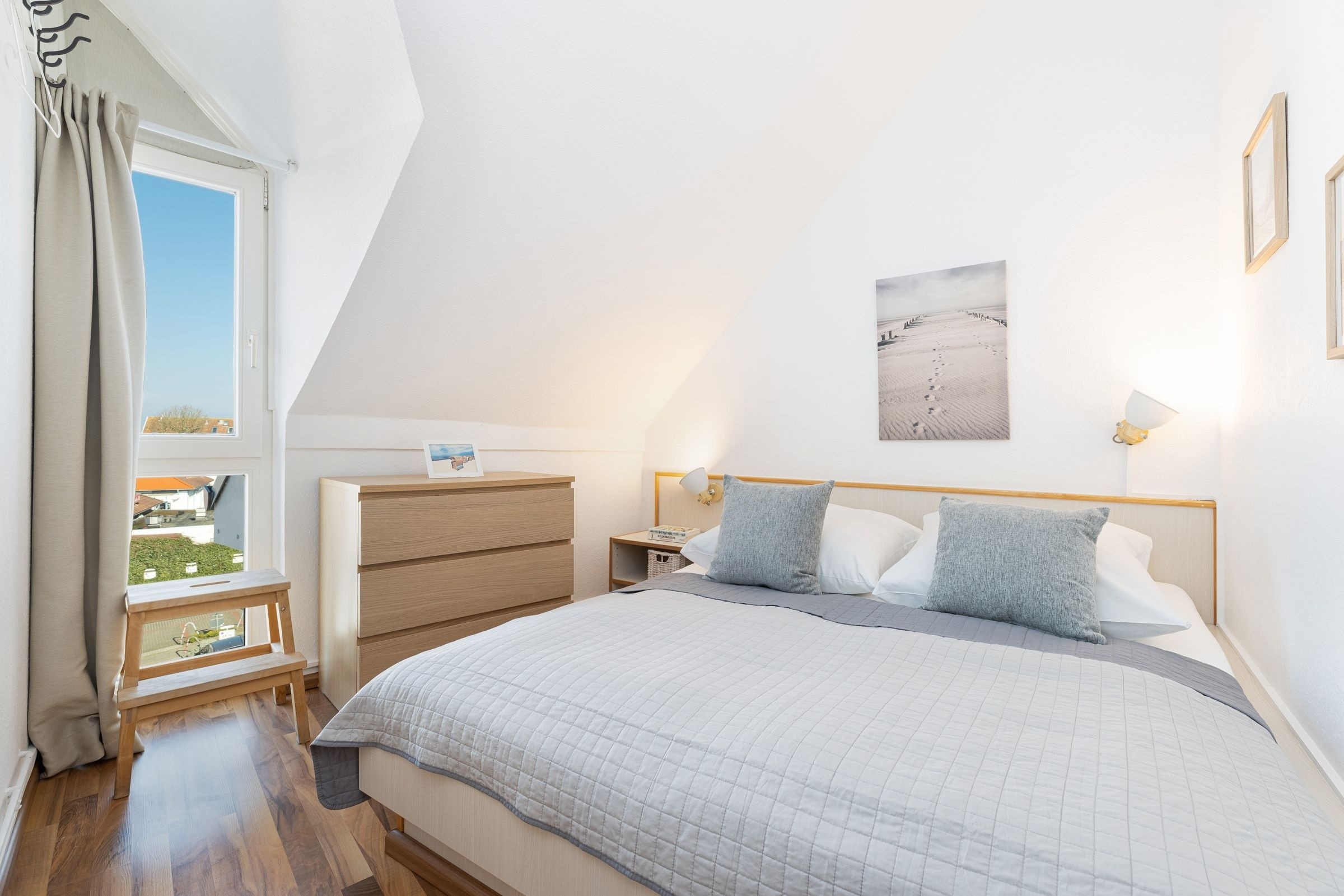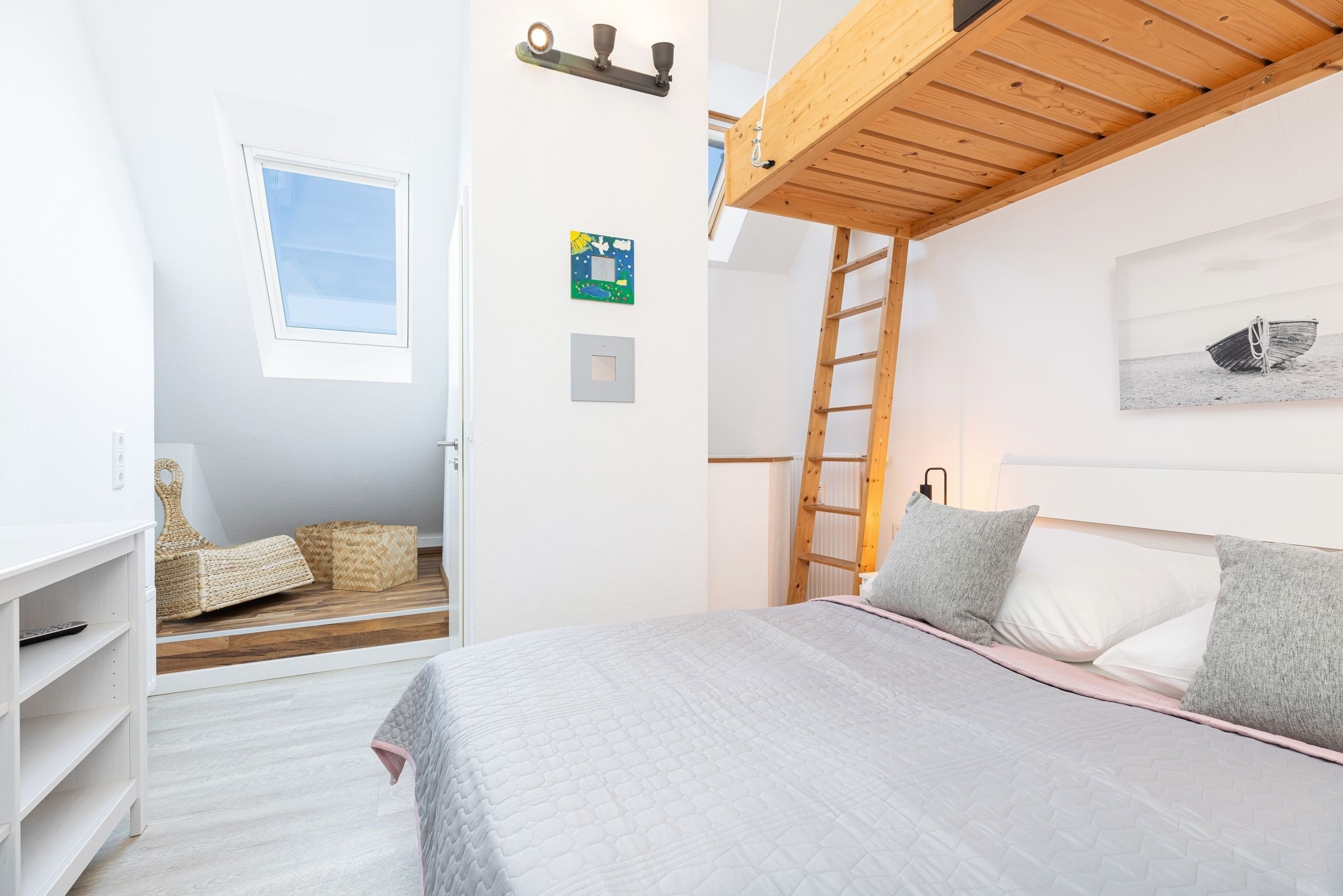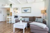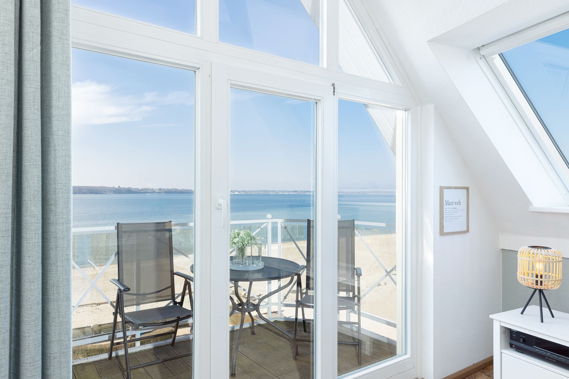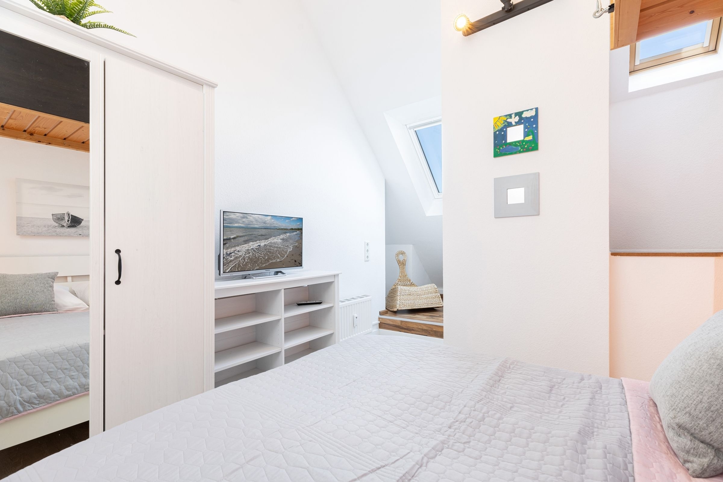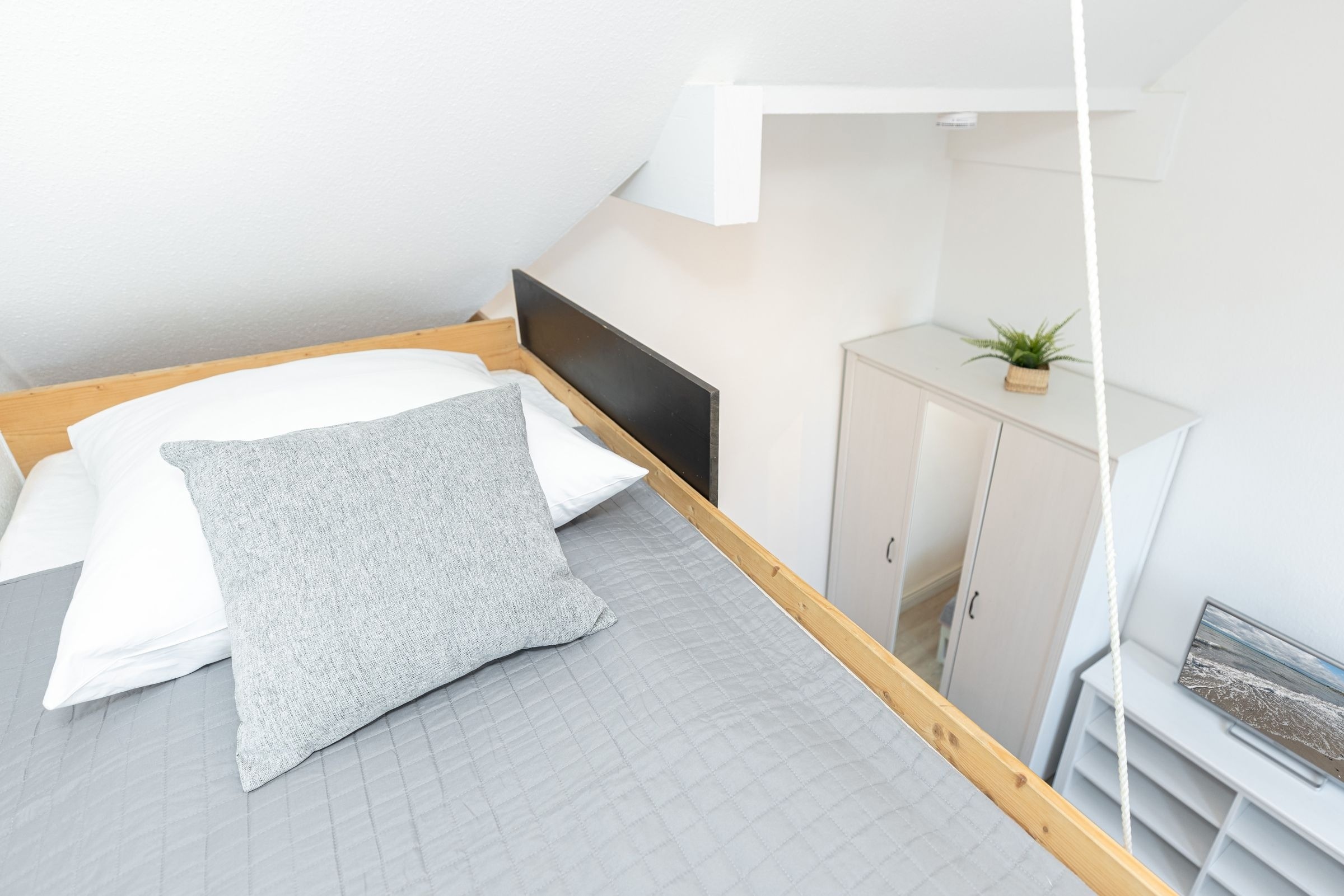 Im offenen Wohn- und Essbereich, welcher sich an die Küchenzeile anschließt, befindet sich ein Esstisch mit vier Stühlen, ein modernes Eck-Sofa, ein Flachbild-Fernseher, ein DVD- sowie ein CD-Radio-Player. Vom Wohnzimmer aus gelangen Sie auf den möblierten Balkon mit einzigartigem Strand- und Fördeblick. Von hier aus lassen der Trubel auf der Strandpromenade und am Strand sowie der Schiffsverkehr betrachten. Abends können Sie die wunderschönen Sonnenuntergänge genießen. An den Wohn- und Essbereich grenzt ein Schlafzimmer mit einem Doppelbett (160x200 cm) an. Das danebenliegende geräumige Badezimmer ist mit einem großen Waschtisch nebst Panoramaspiegel, einer Duschkabine und einem WC ausgestattet und bietet zahlreiche Ablagemöglichkeiten. Über die Wendeltreppe gelangen Sie in die obere Etage, in der sich ein weiteres Schlafzimmer befindet. Dieses verfügt ebenfalls über ein Doppelbett (160x200 cm), einen Kleiderschrank, eine Kommode sowie einen weiteren Flachbild-Fernseher. Zudem ist dort ein Einzel-Hochbett für Kinder installiert, welches diese über eine kleine Leiter erreichen.