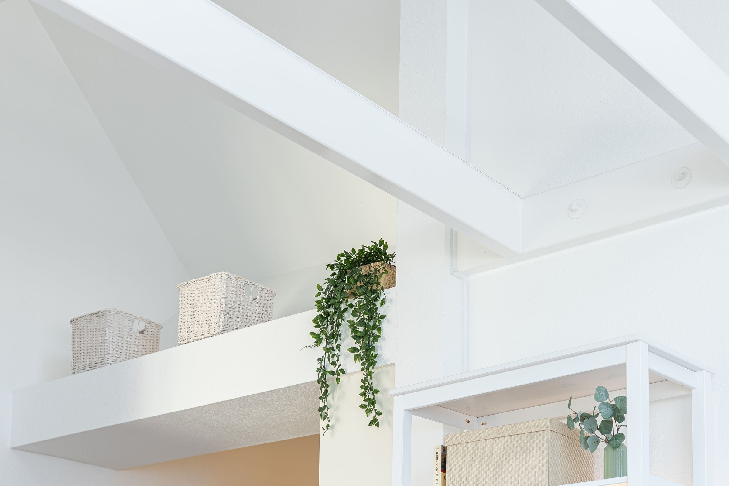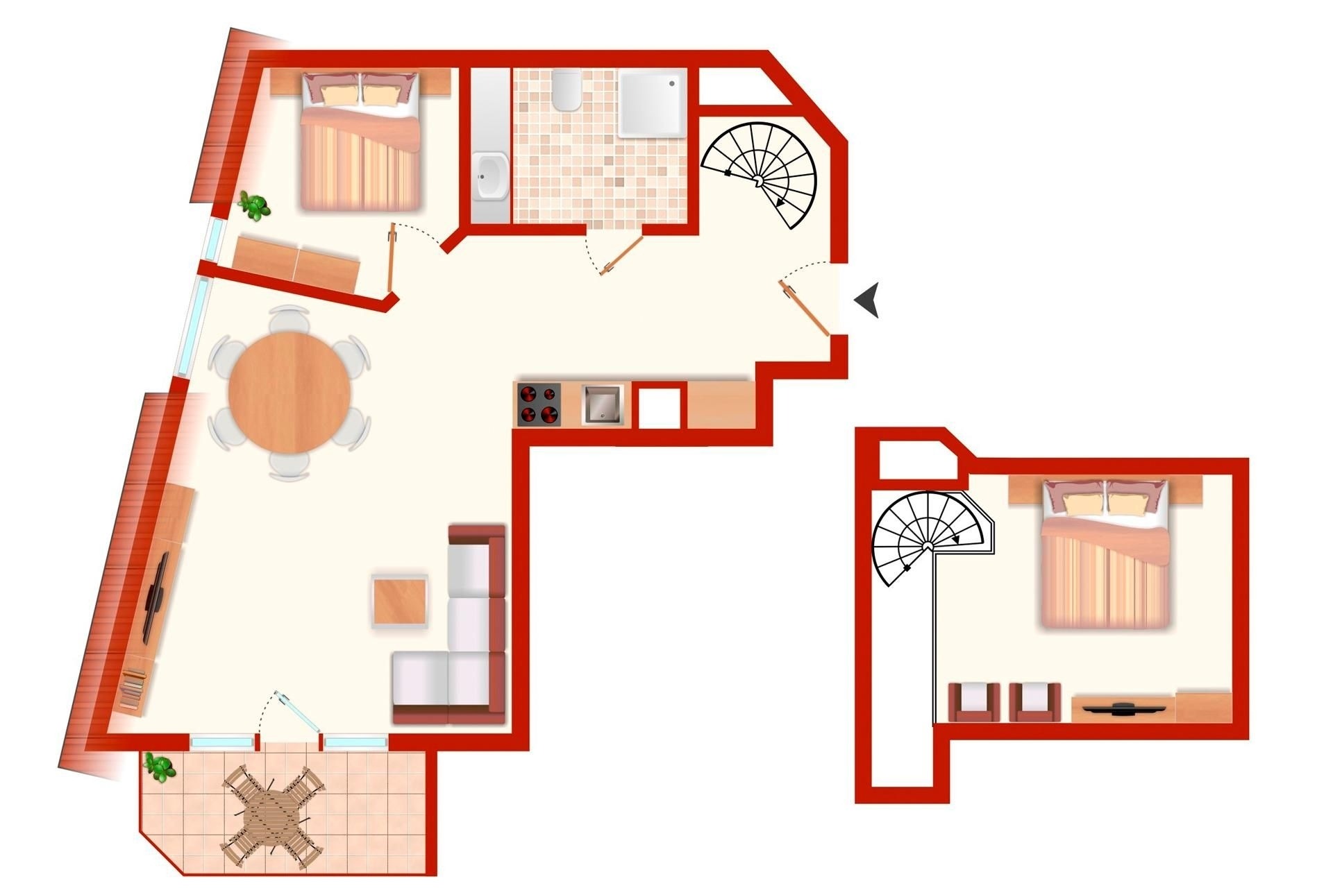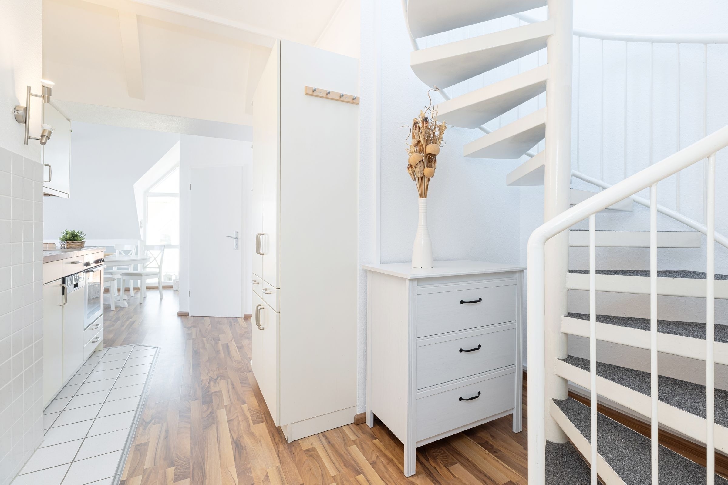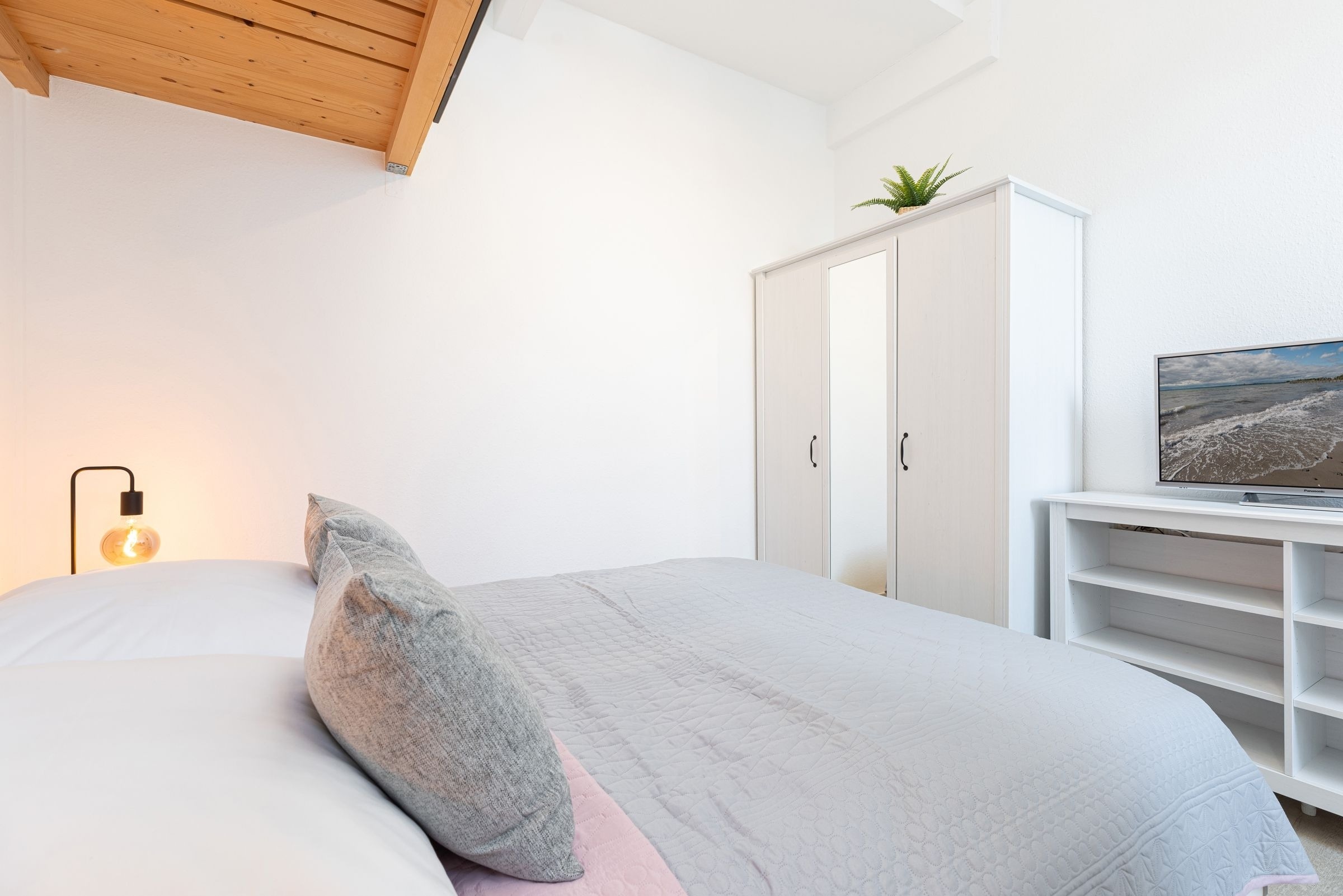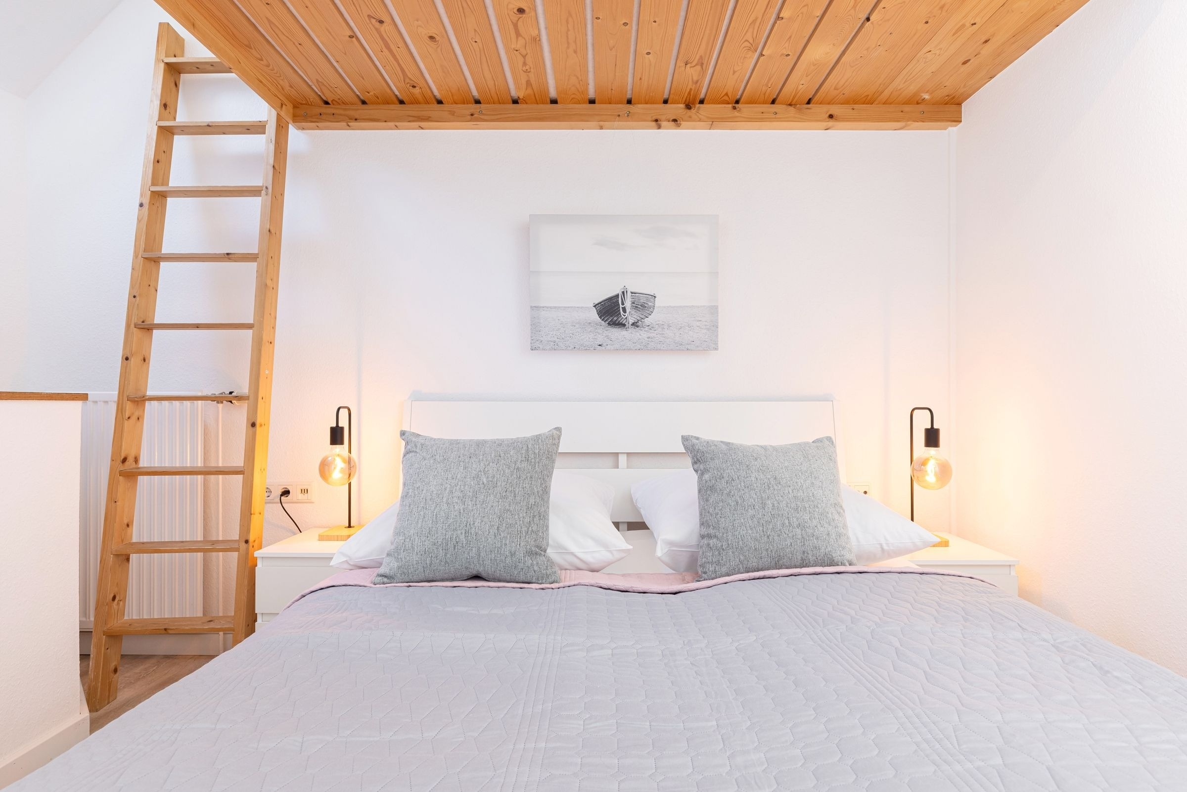 Im offenen Wohn- und Essbereich, welcher sich an die Küchenzeile anschließt, befindet sich ein Esstisch mit vier Stühlen, ein modernes Eck-Sofa, ein Flachbild-Fernseher, ein DVD- sowie ein CD-Radio-Player. Vom Wohnzimmer aus gelangen Sie auf den möblierten Balkon mit einzigartigem Strand- und Fördeblick. Von hier aus lassen der Trubel auf der Strandpromenade und am Strand sowie der Schiffsverkehr betrachten. Abends können Sie die wunderschönen Sonnenuntergänge genießen. An den Wohn- und Essbereich grenzt ein Schlafzimmer mit einem Doppelbett (160x200 cm) an. Das danebenliegende geräumige Badezimmer ist mit einem großen Waschtisch nebst Panoramaspiegel, einer Duschkabine und einem WC ausgestattet und bietet zahlreiche Ablagemöglichkeiten. Über die Wendeltreppe gelangen Sie in die obere Etage, in der sich ein weiteres Schlafzimmer befindet. Dieses verfügt ebenfalls über ein Doppelbett (160x200 cm), einen Kleiderschrank, eine Kommode sowie einen weiteren Flachbild-Fernseher. Zudem ist dort ein Einzel-Hochbett für Kinder installiert, welches diese über eine kleine Leiter erreichen.
