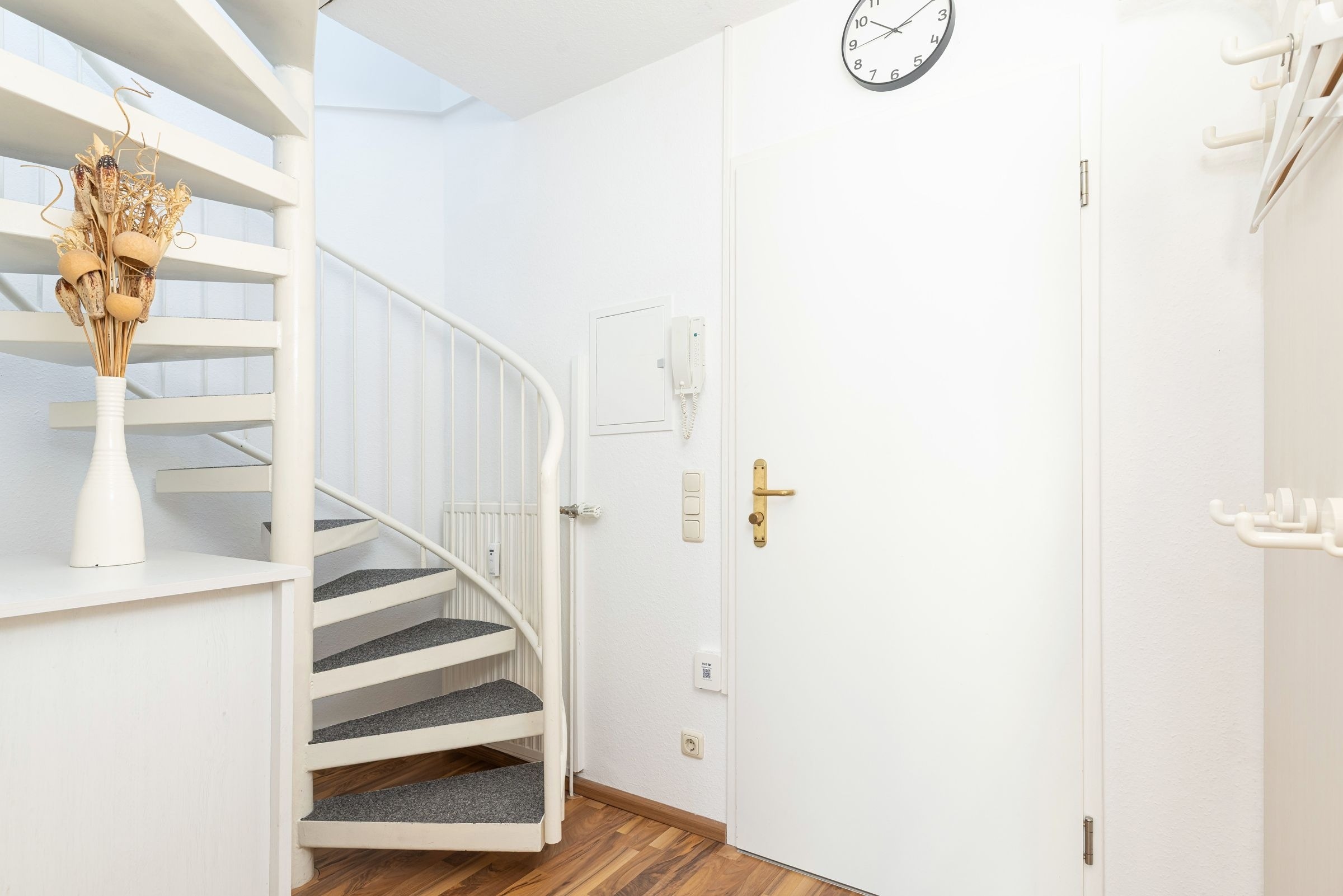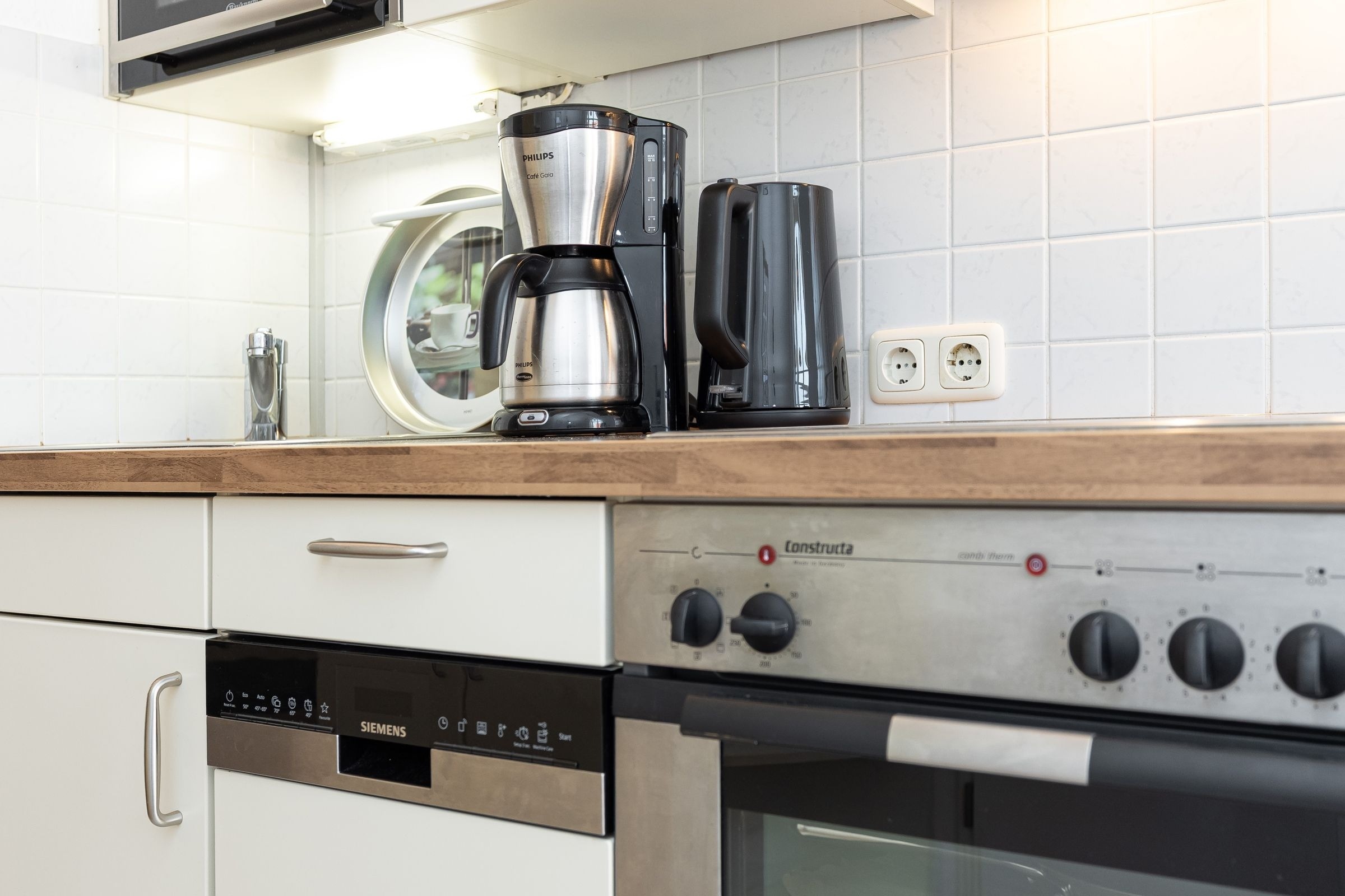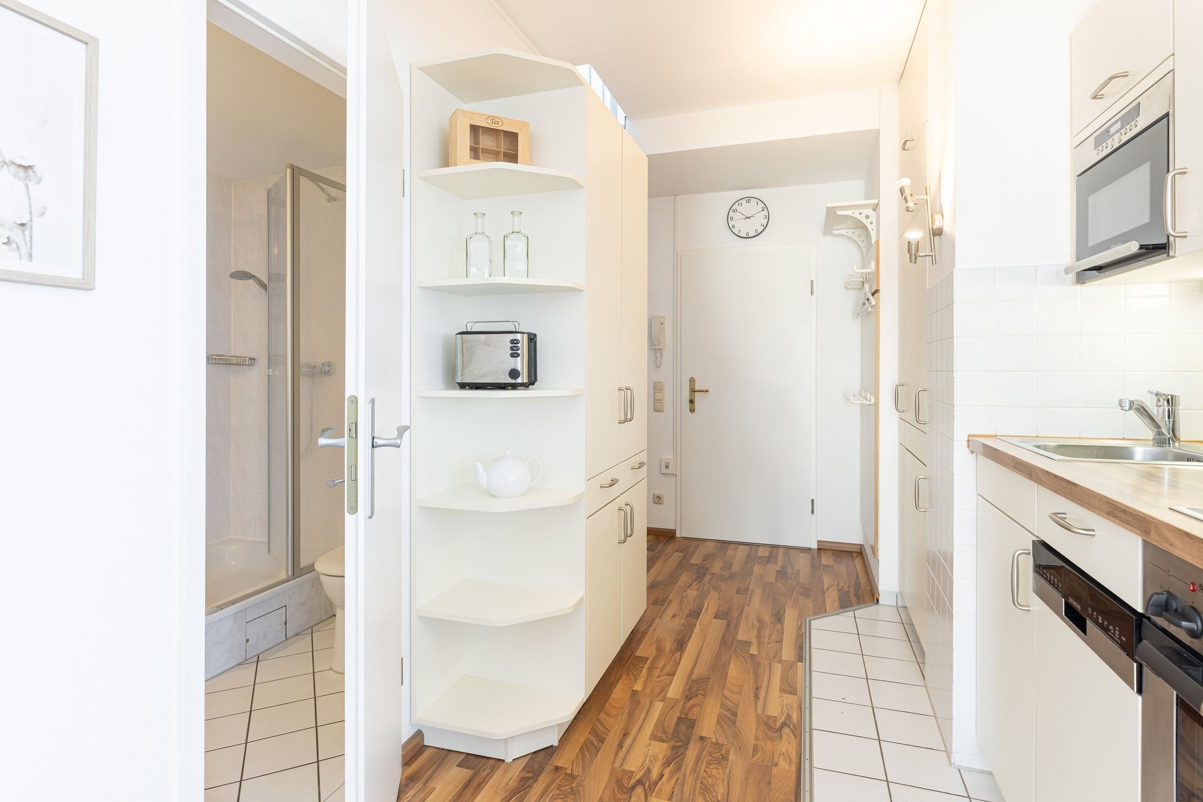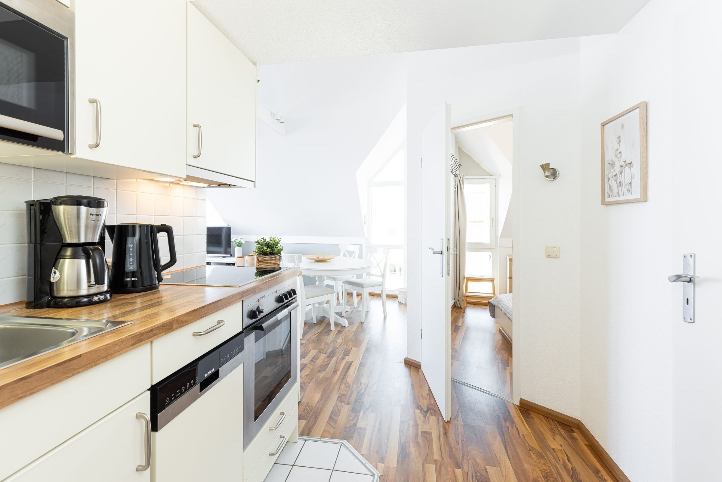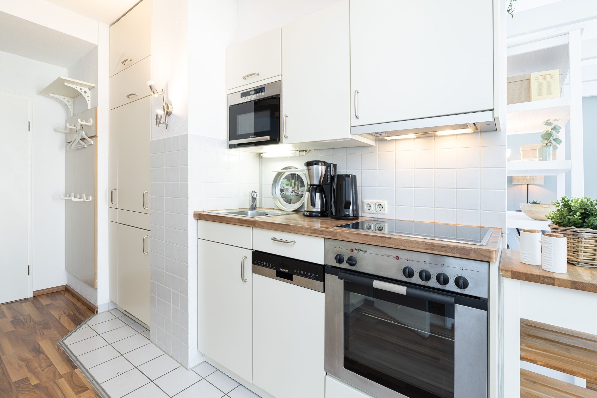 Aus dem Wohnzimmer sowie vom möblierten Balkon haben Sie einen atemberaubenden Panorama-Blick über den Laboer Strand, die Kieler Förde bis in die Kieler Bucht. Das Appartement teilt sich wie folgt auf: Sie betreten im 3. Stock den Flur mit Garderobe und Wendeltreppe, die in die obere Etage führt. Fortlaufend gehen Sie in den kombinierten Wohn-/Ess- und Küchenbereich. Hier stehen Ihnen eine moderne Küchenzeile mit einem 4-er Ceran-Kochfeld, Backofen, Geschirrspüler, Kühlschrank und Gefrierschrank sowie einer Mikrowelle zur Verfügung.