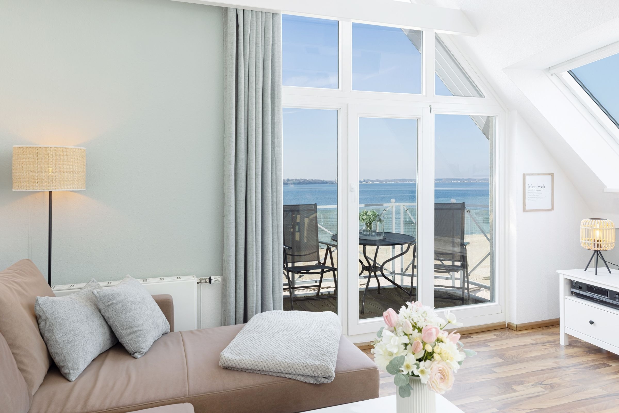 Das 4-Zimmer-Appartement Traumsicht Laboe liegt in 1. Reihe direkt an der Strandpromenade unmittelbar am feinen Sandstrand. Die liebevoll eingerichtete Wohnung befindet sich im 3. und 4. Stock (2 Etagen) und ist für bis zu 4 Erwachsene und 1 Kind geeignet. Die Wohnung lässt sich bequem mit dem Aufzug erreichen.