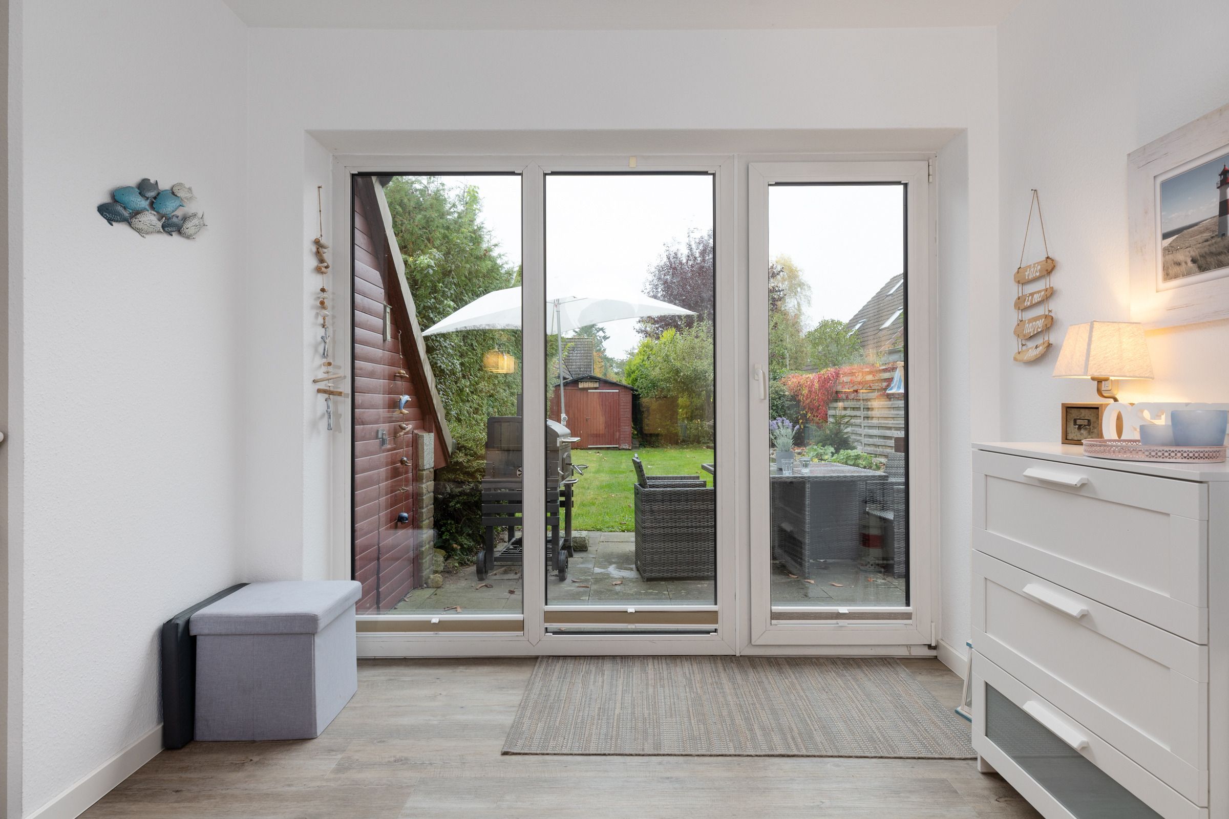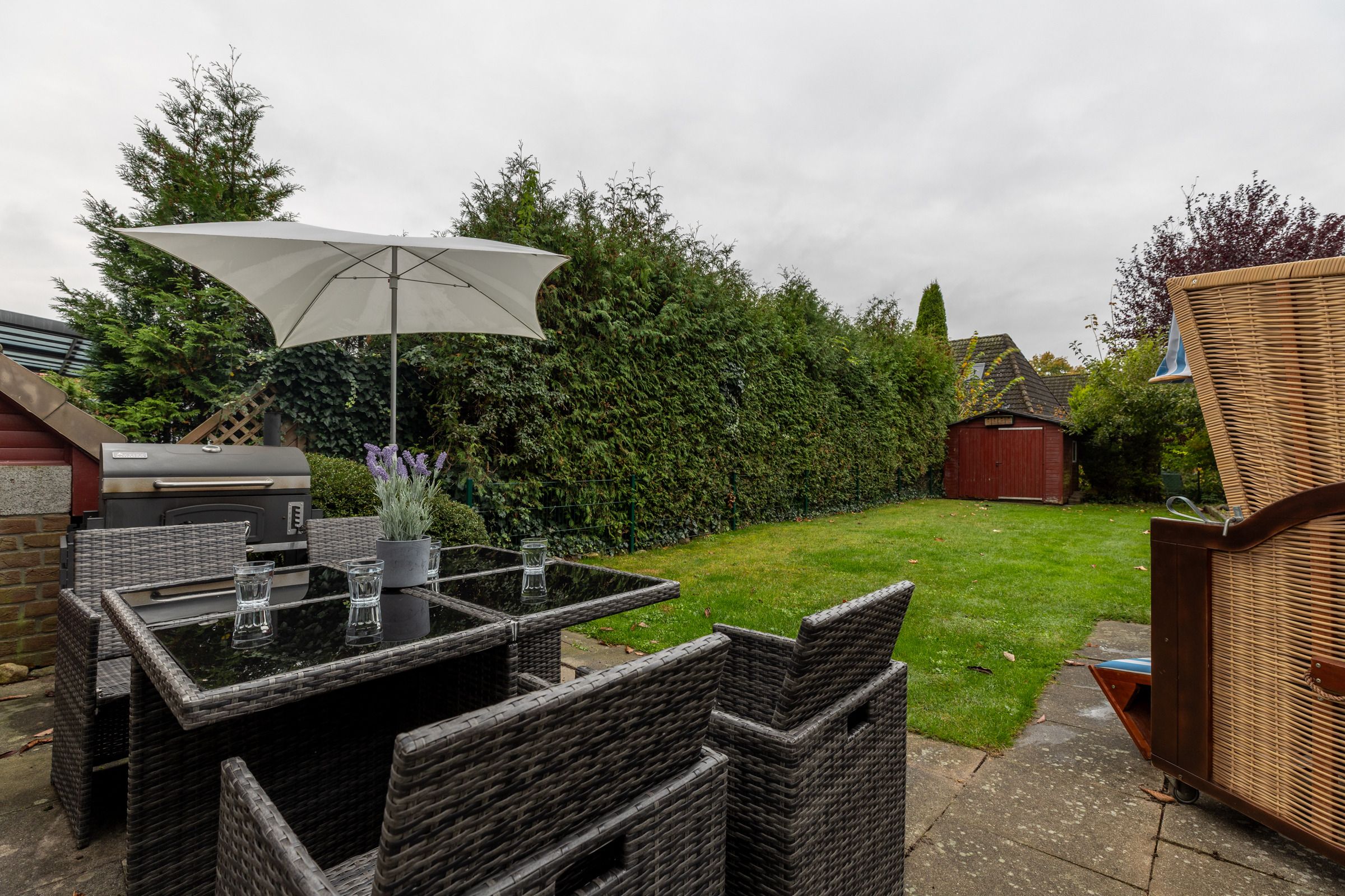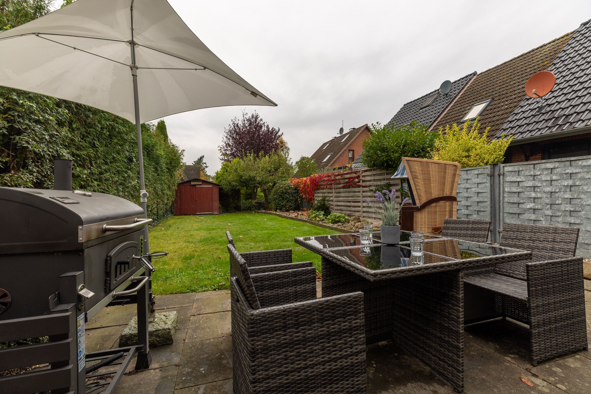 Im eigenen Garten können Sie sich entspannen, morgens dem Vogelkonzert lauschen, mittags ein Sonnenbad nehmen oder mit den Kindern und Ihren Vierbeinern toben. Die Terrasse mit einem modernen Holzkohle-Grill bietet optimale Voraussetzungen für schöne gemeinsame Abende. Für ein schnelles Grillerlebnis steht Ihnen zusätzlich ein kleiner Elektrogrill zur Verfügung. Der Garten ist ringsum dicht bewachsen, weitestgehend uneinsehbar und vollständig eingezäunt.