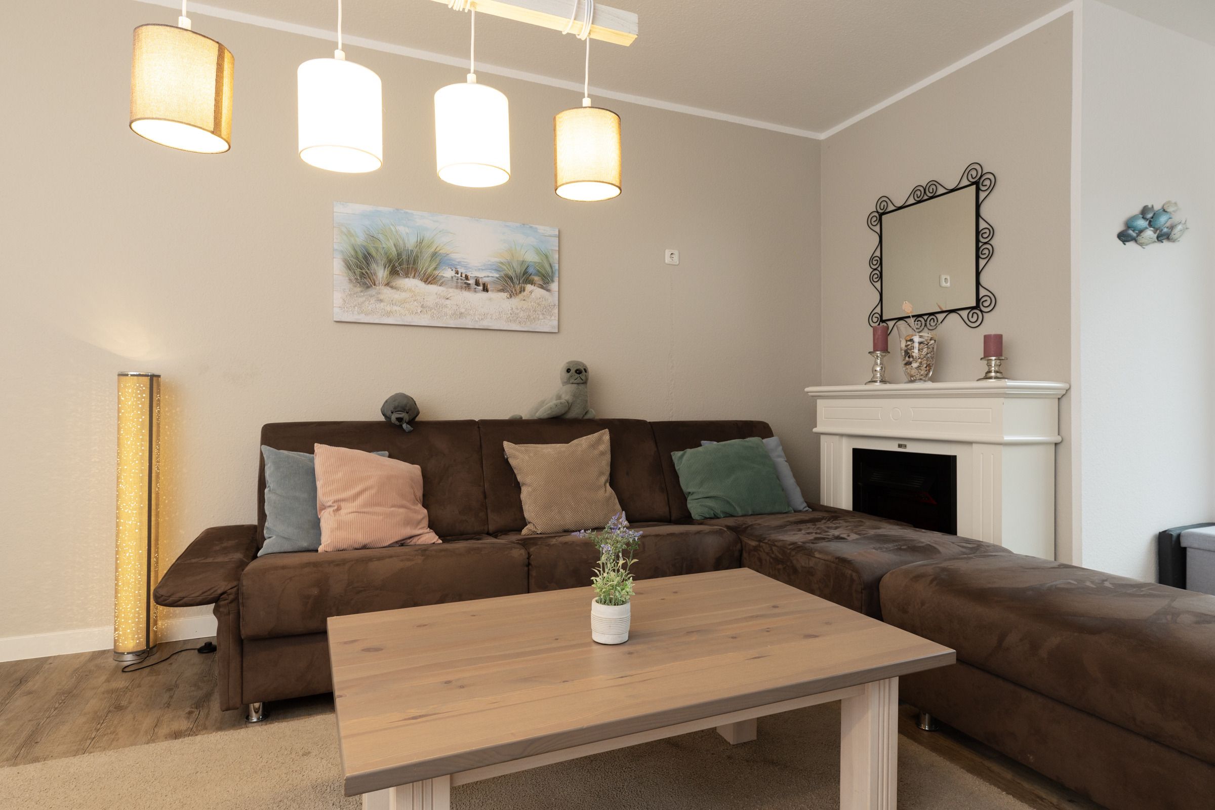 Im geräumigen Wohnzimmer sorgt ein E-Kamin neben der Heizung an kühlen Tagen für eine gemütliche Wärme. Die 2 Schlafzimmer sind mit elektrischen Rollläden und ebenfalls mit 2 weiteren Smart-TV-Fernsehern ausgestattet. Weiterhin gibt es 2 Doppelbetten sowie einem Etagenbett für Kinder. Genießen Sie die Abende mit Ihren Lieblingsfilmen aus der Mediathek oder lassen Sie sich es mit einem Fondue-Abend gut gehen (ein Elektro-Fondue gehört zur Ausstattung).